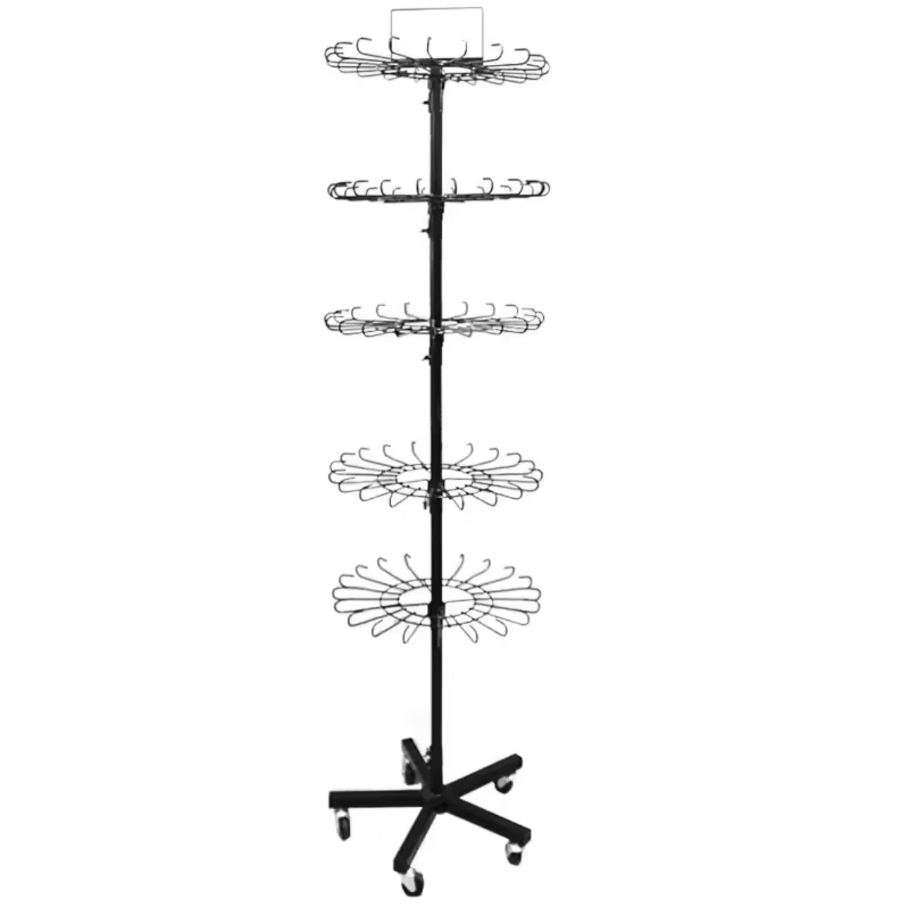 Ekspozitor rrotullues metalik me 5 kate dhe grepëza të kthyera, praktik për organizimin dhe ekspozimin e aksesorëve në dyqan ose showroom. Materiali: Metalike. Ngjyra: E zezë. Përmasat: H187 cm.