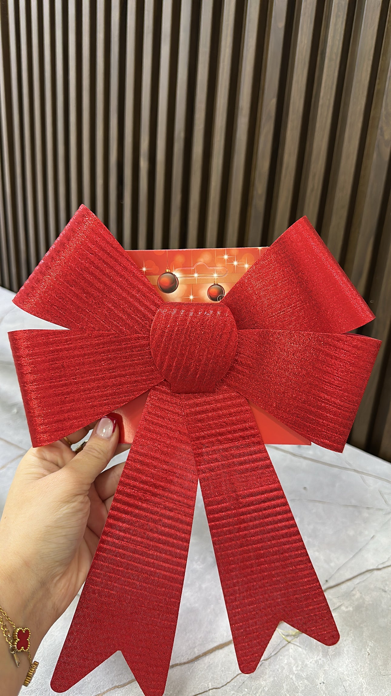 Fjongo dekorative e kuqe me shkëlqim, perfekte për pemë, kurora, dhurata dhe çdo dekor festiv. E lehtë për vendosje dhe shumë efektive në pamje. Përmasa: 31 x 24 cm.