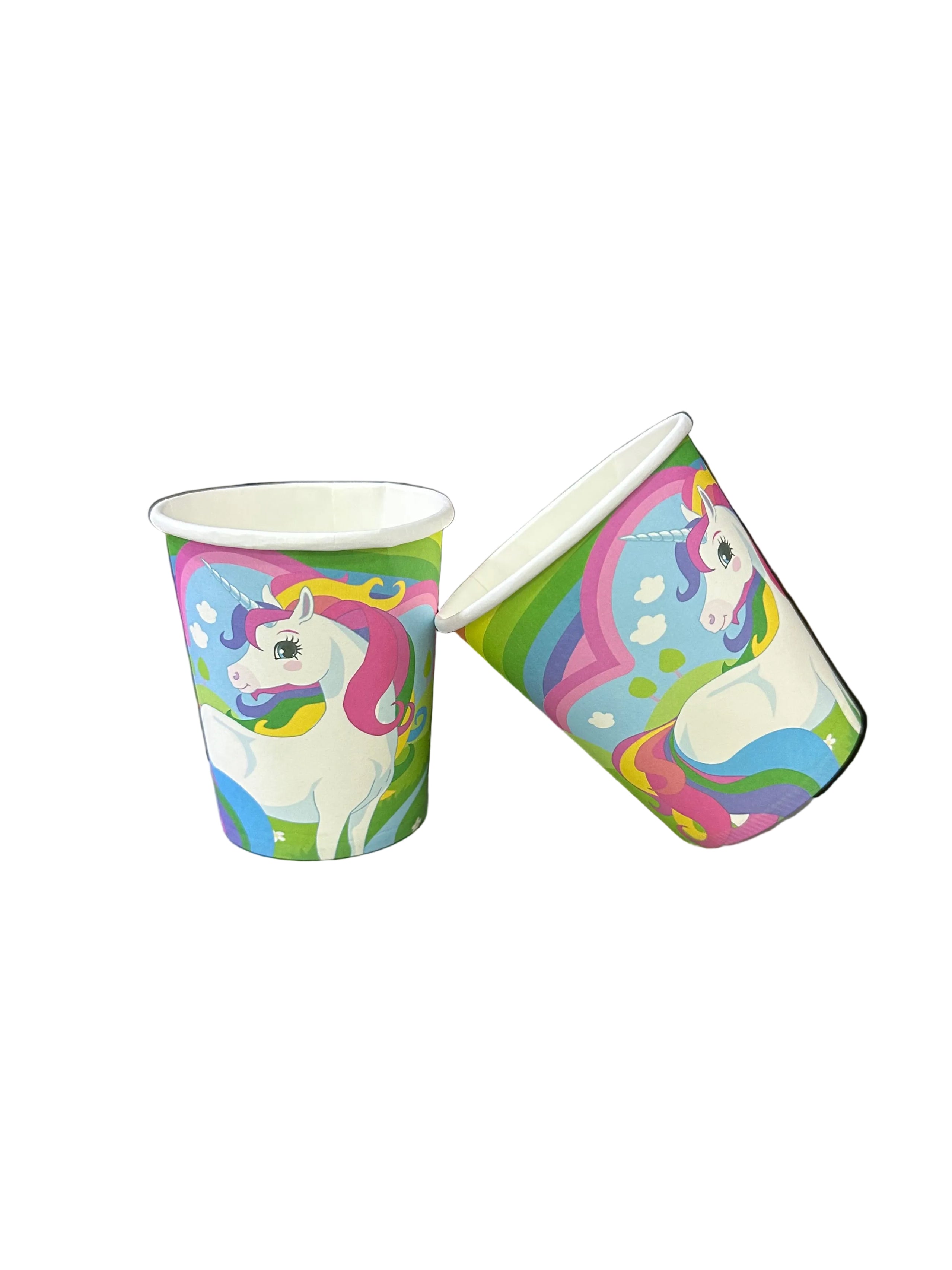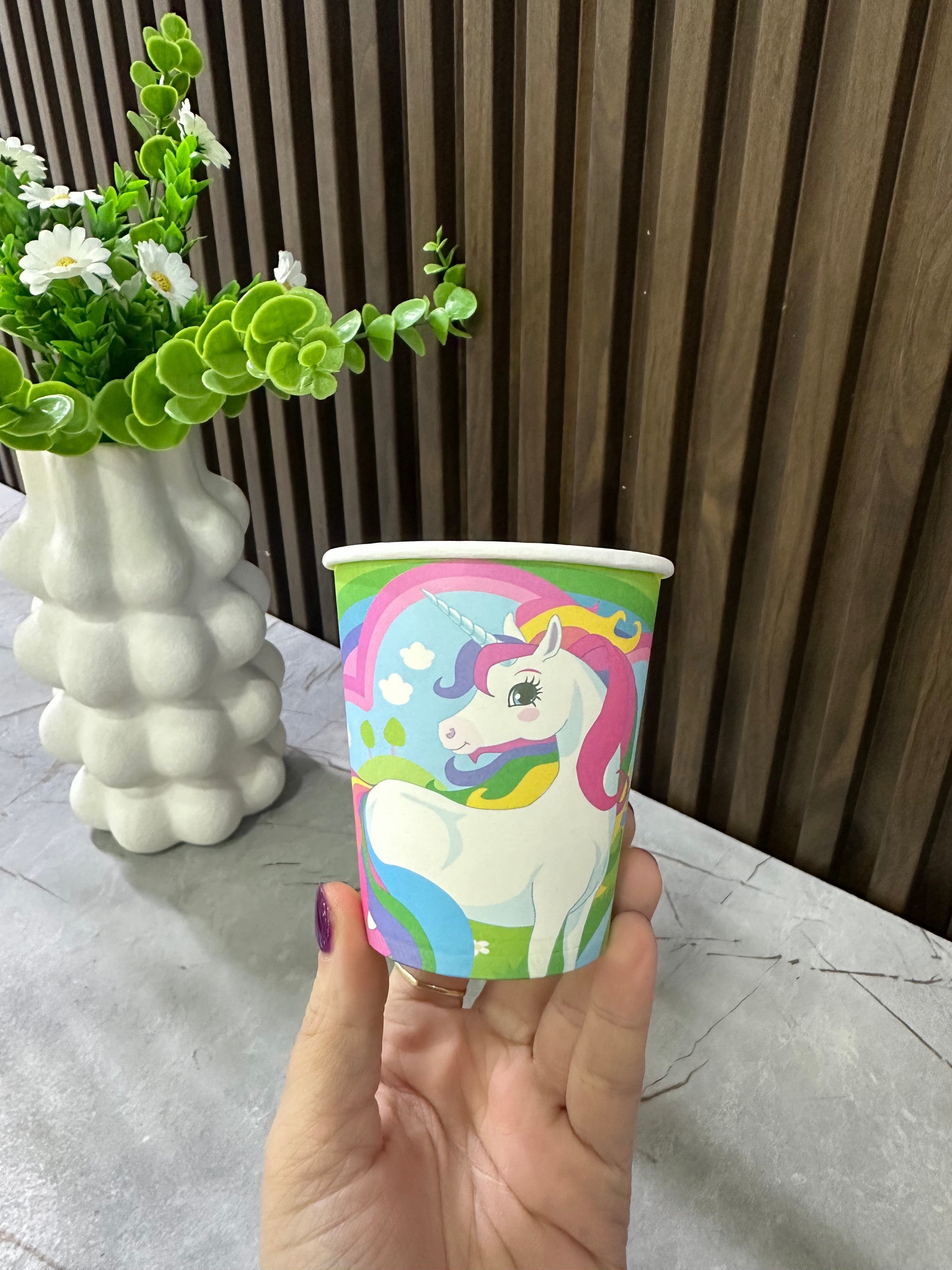 Gotë kartoni për festa me dizajn njëbrirëshi, e përshtatshme për ditëlindje dhe evente për fëmijë. Përmasat: 7 x H8 cm. Personazhi: Njëbrirëshi. Materiali: Karton.