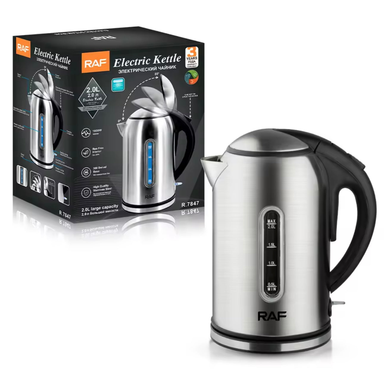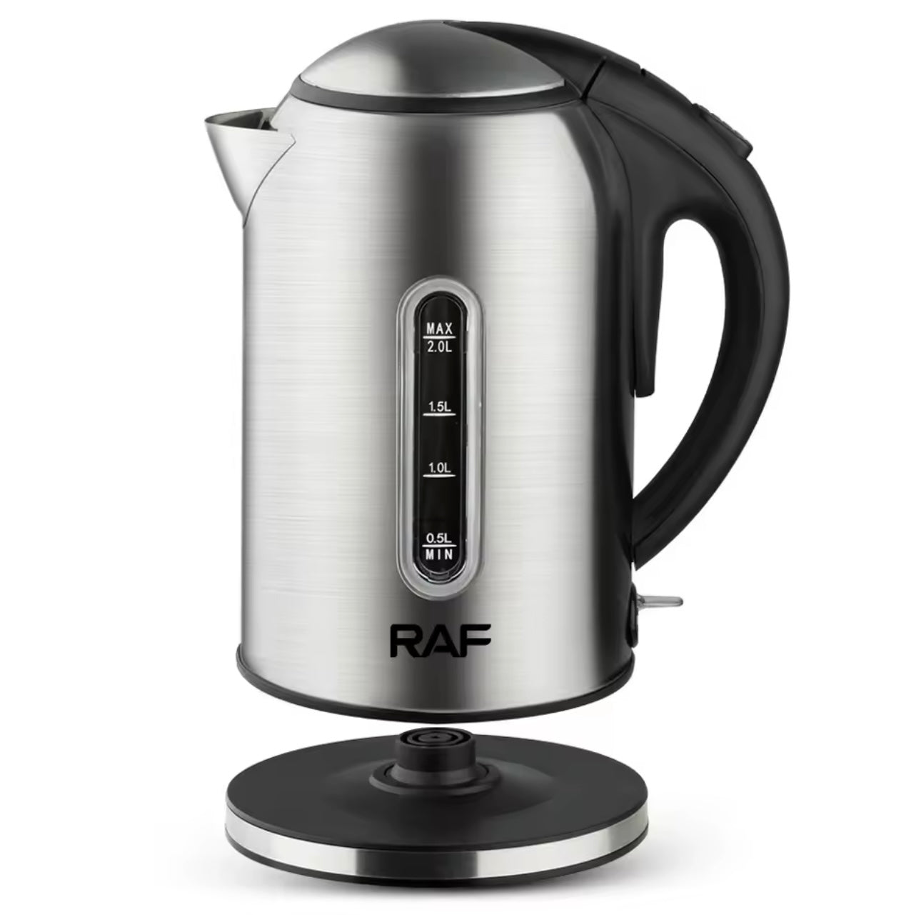 Ibrik  elektrik RAF 2L me fuqi 1800W, i shpejtë dhe praktik për zierje të menjëhershme të ujit. Trup çelik inox, bazë rrotulluese 360° dhe hapje e kapakut me një prekje....