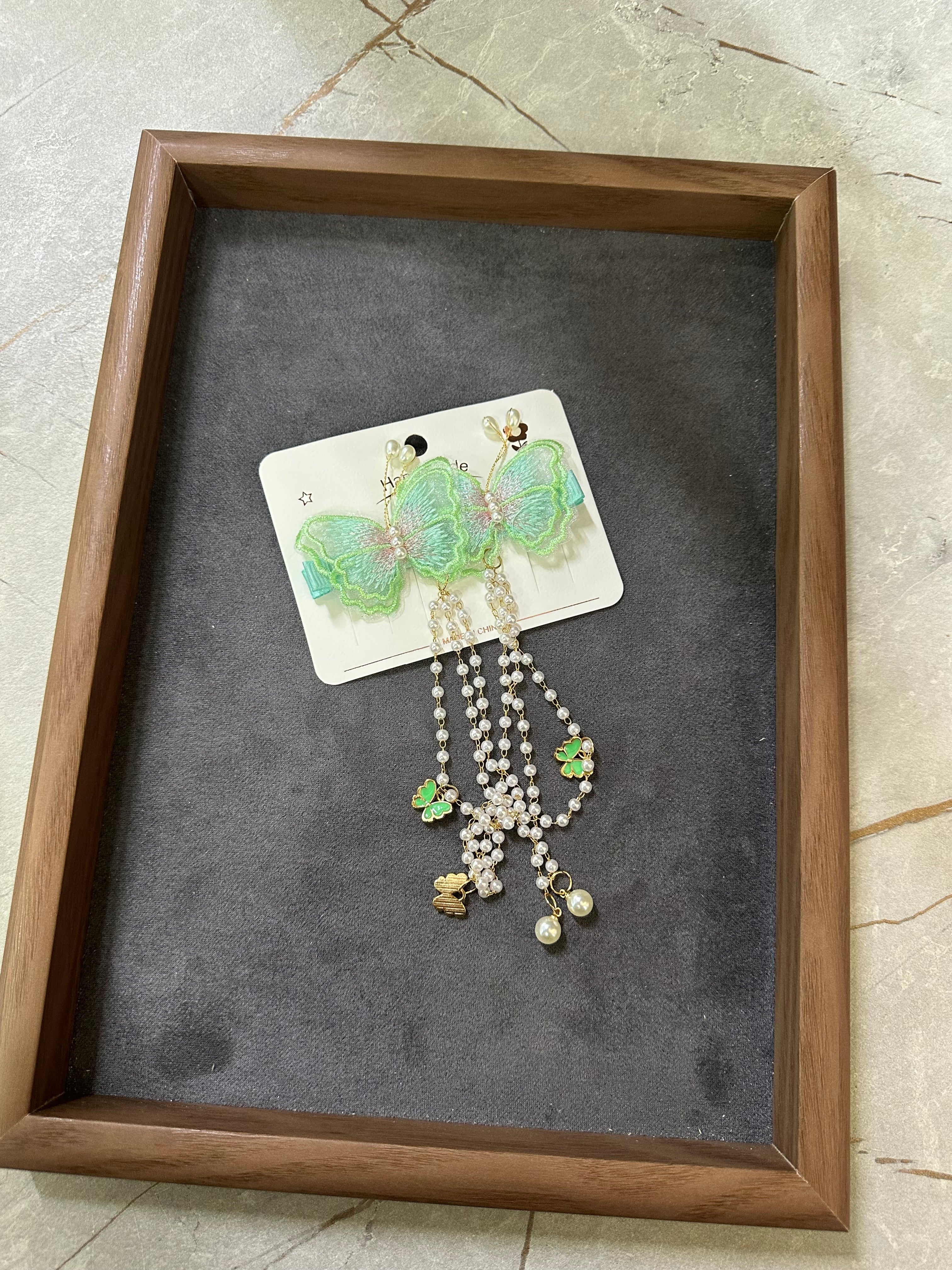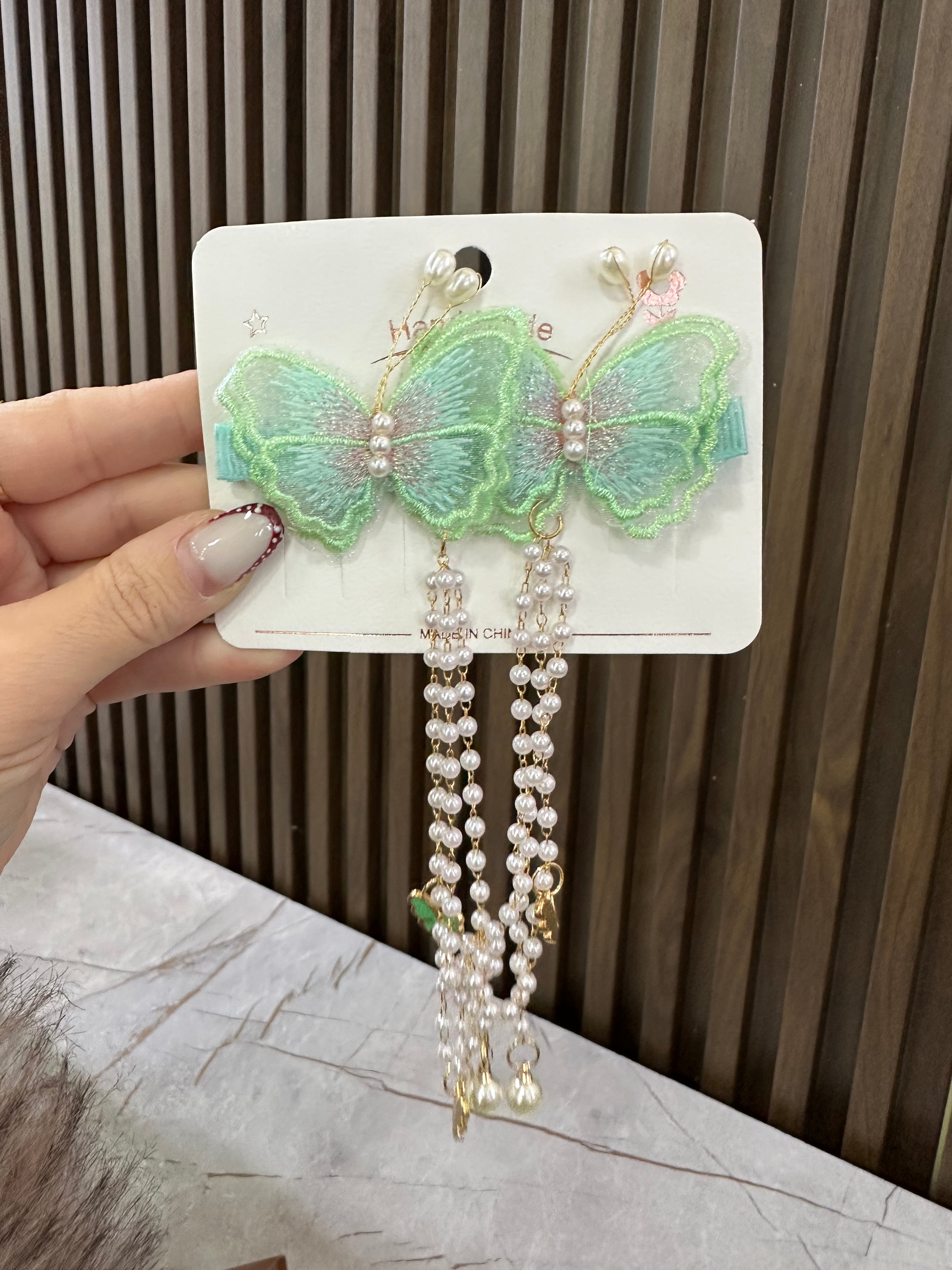 Kapëse flokësh elegante me flutur jeshile dhe varëse perlash dekorative. Ngjyra: Jeshile. Set: 2 Pcs.