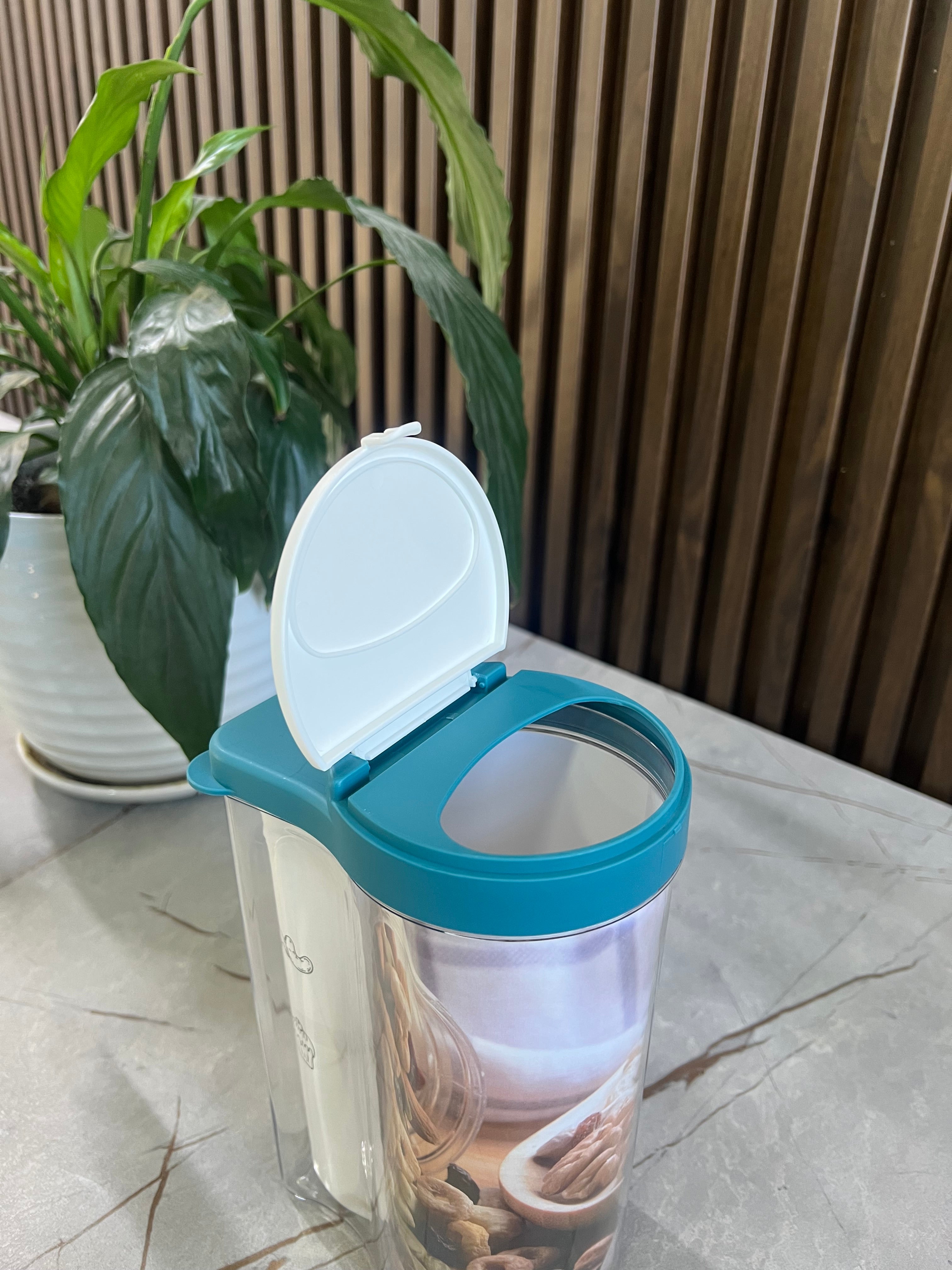Materiali: Plastike. Ngjyra: Transparente + blu. Përmasat: 12.3x9xH21 cm. Ideale për ushqime të thata.