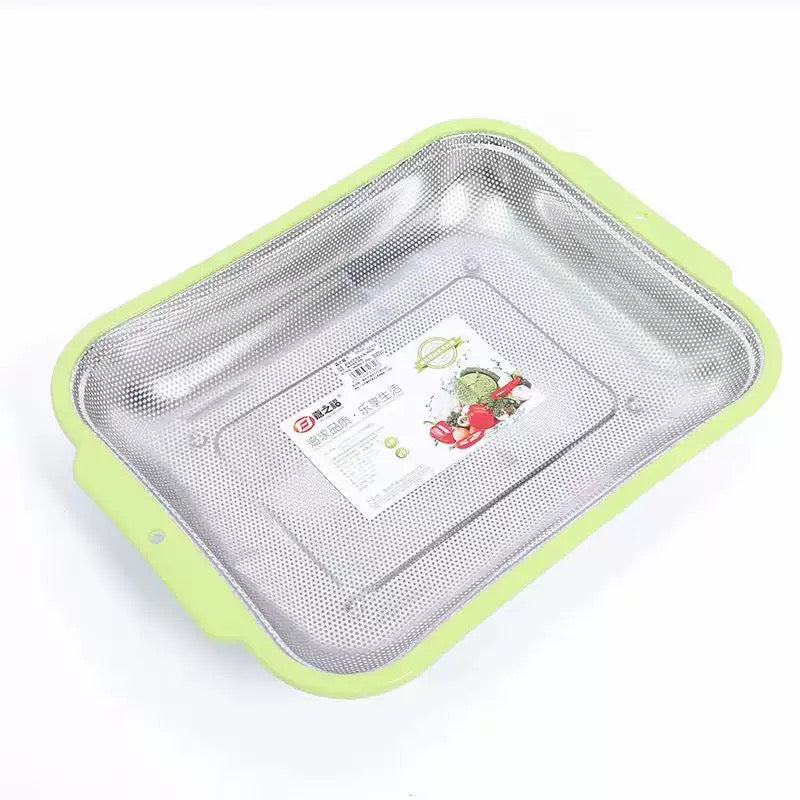 Kullesë plastike me rrjetë metalike, ideale për larjen dhe kullimin e perimeve, frutave dhe ushqimeve.  Materiali: Metalike/inox. Përmasat: 28 x 39 x H6 cm. Ngjyra: Jeshile.