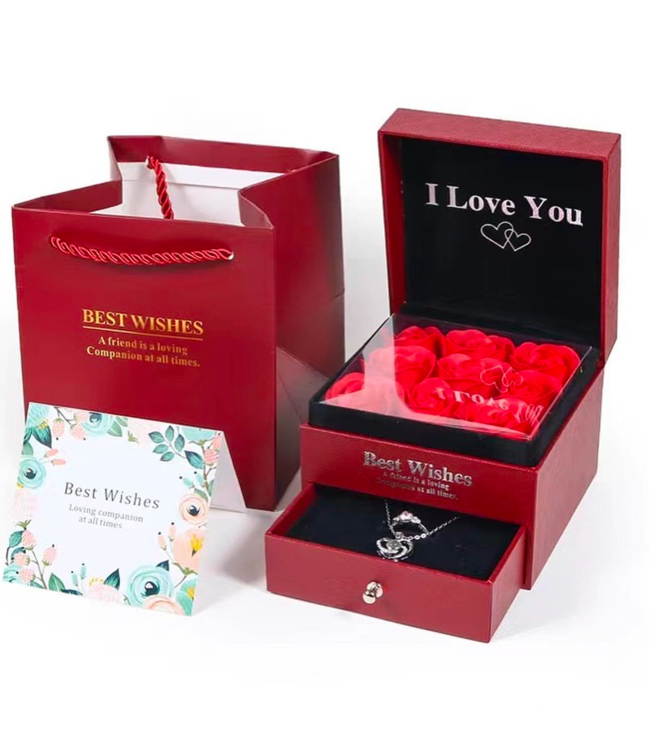 Kuti “Best Wishes” me trëndafila sapun e me shkrim gold “I love you”; Me çantë e kartolinë;  Ngjyra: vishnje, gri, rozë