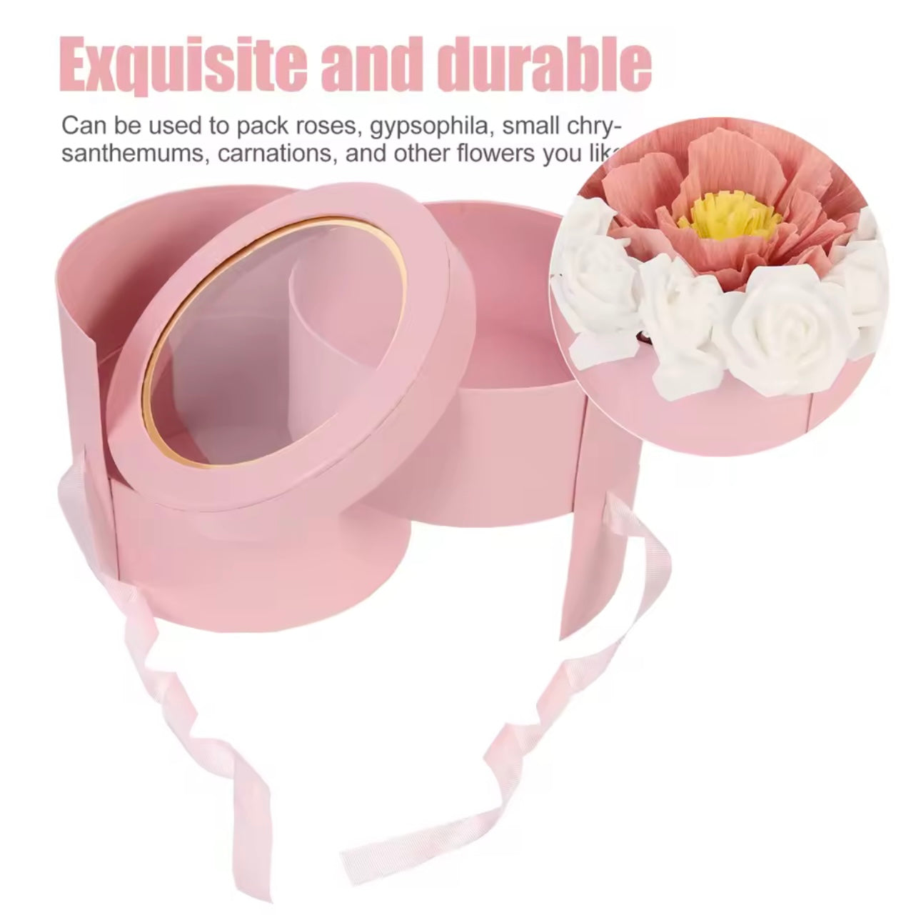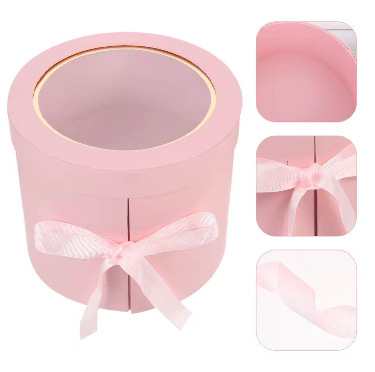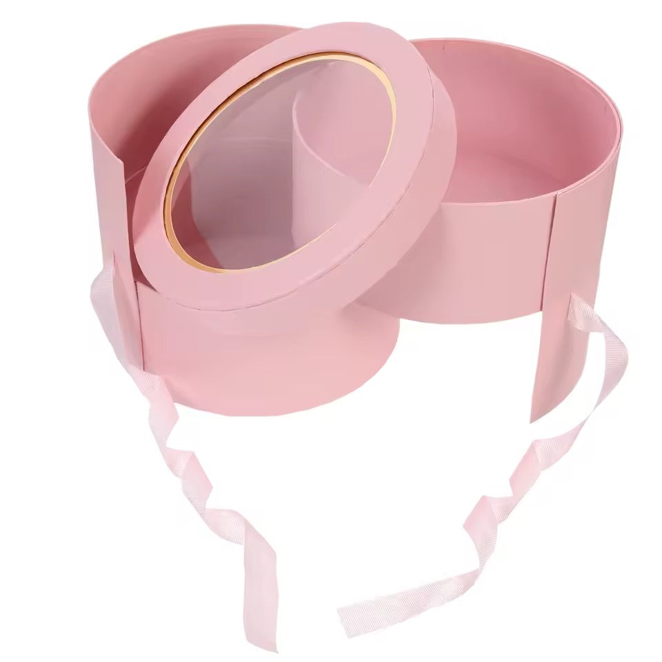 Kuti dhuratash cilindrike me kapak transparent dhe fjongo,për lule dhe surpriza