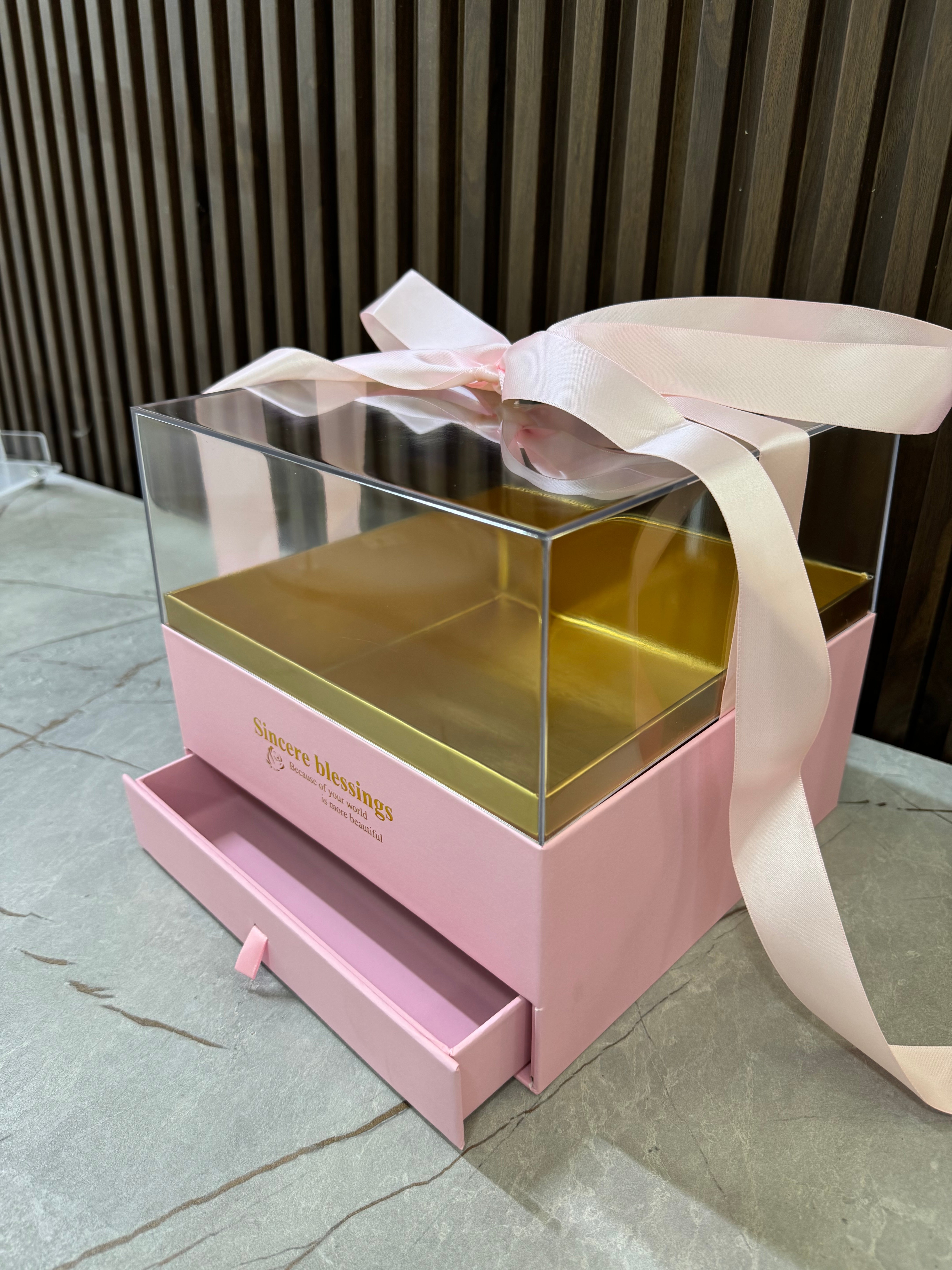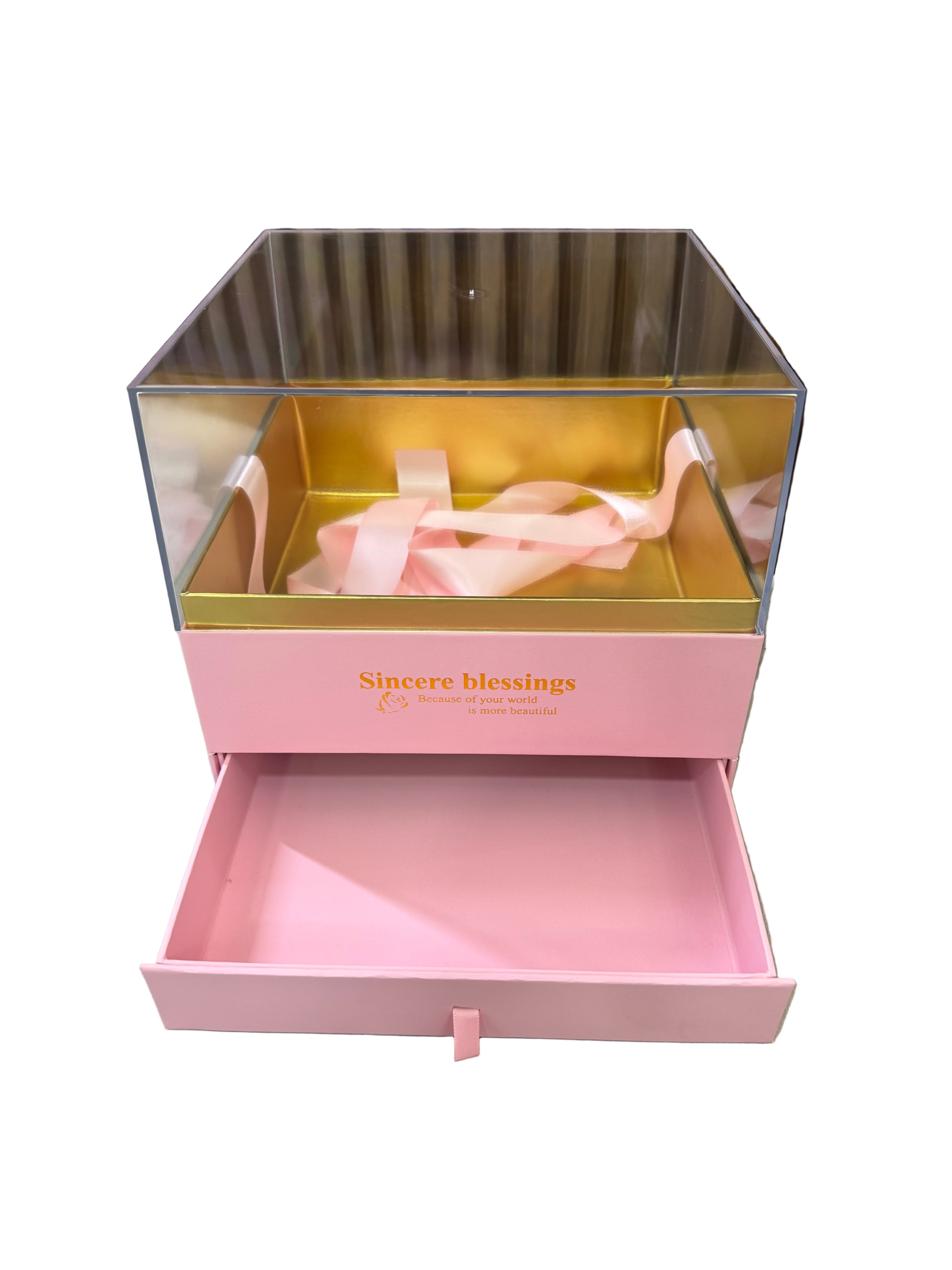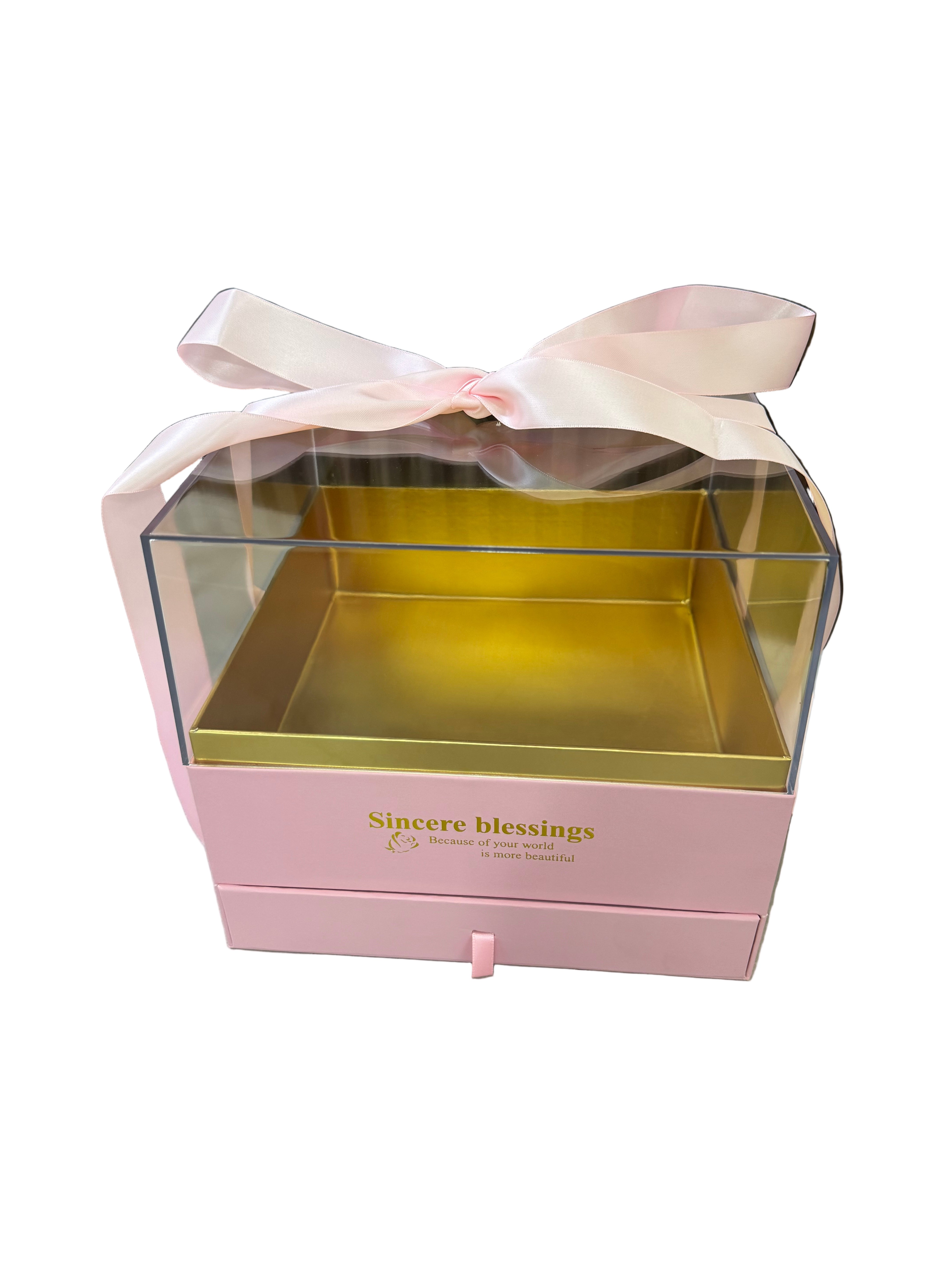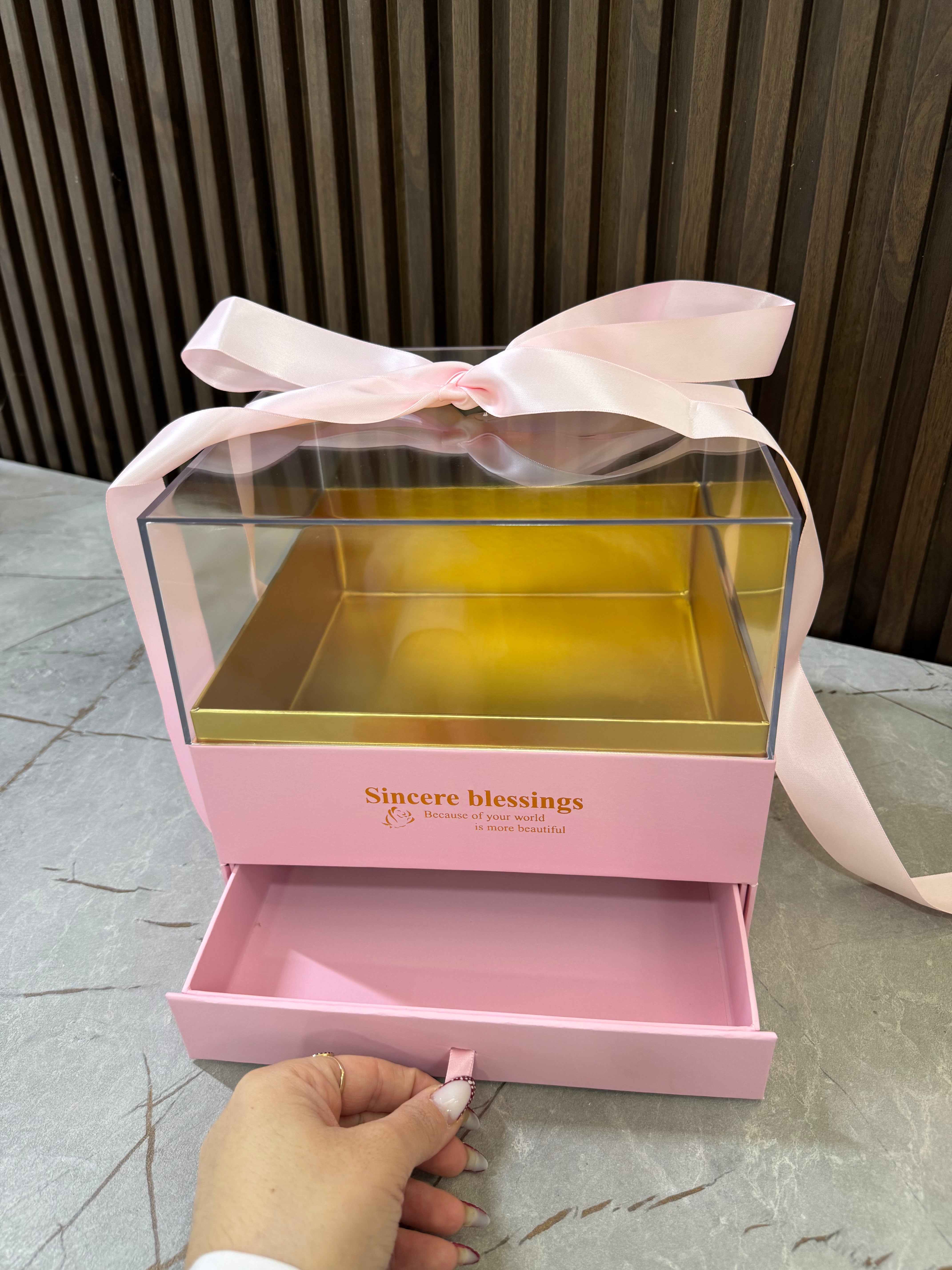 Kuti dhuratash me kapak transparent, sirtar praktik dhe fjongo dekorative. Model i thjeshtë, i përshtatshëm për lule, aksesorë apo surpriza speciale. Përmasa: (25x23.5xH21cm). Ngjyra: Pink. Përdorimi: Për kompozime dhuratash.
