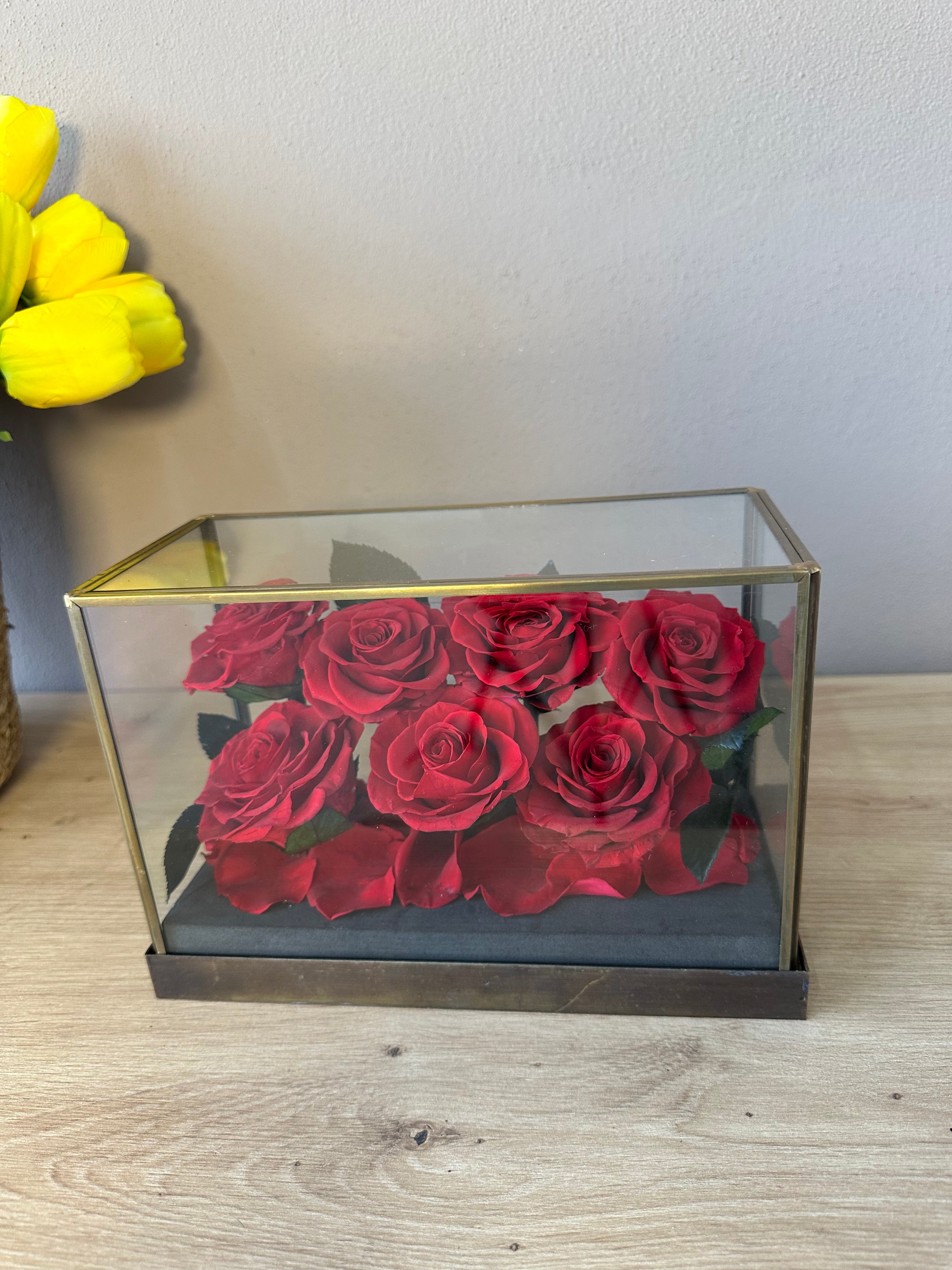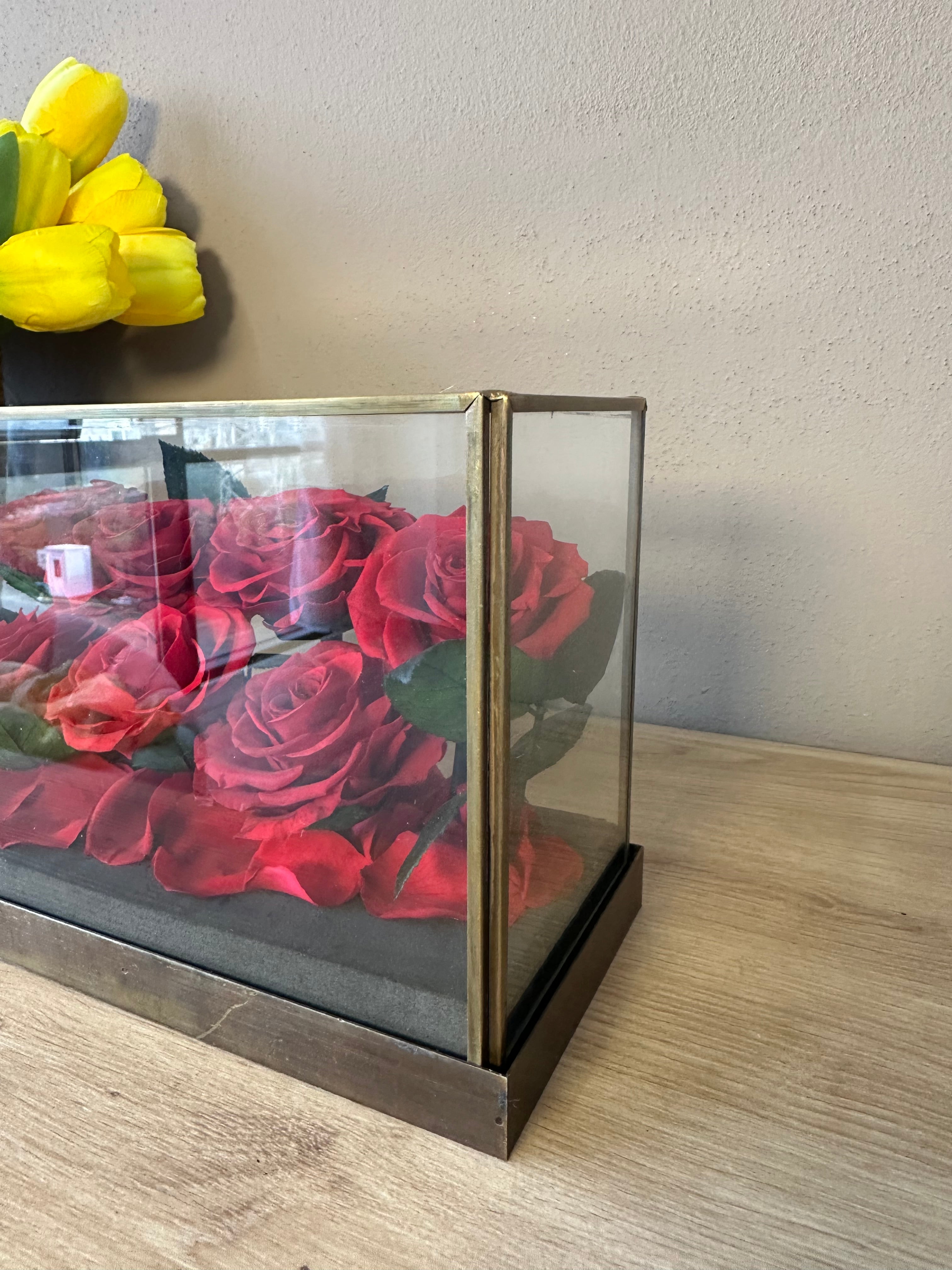 Kuti qelqi drejtkëndore me korrniza gold, dhe 7 trëndafila