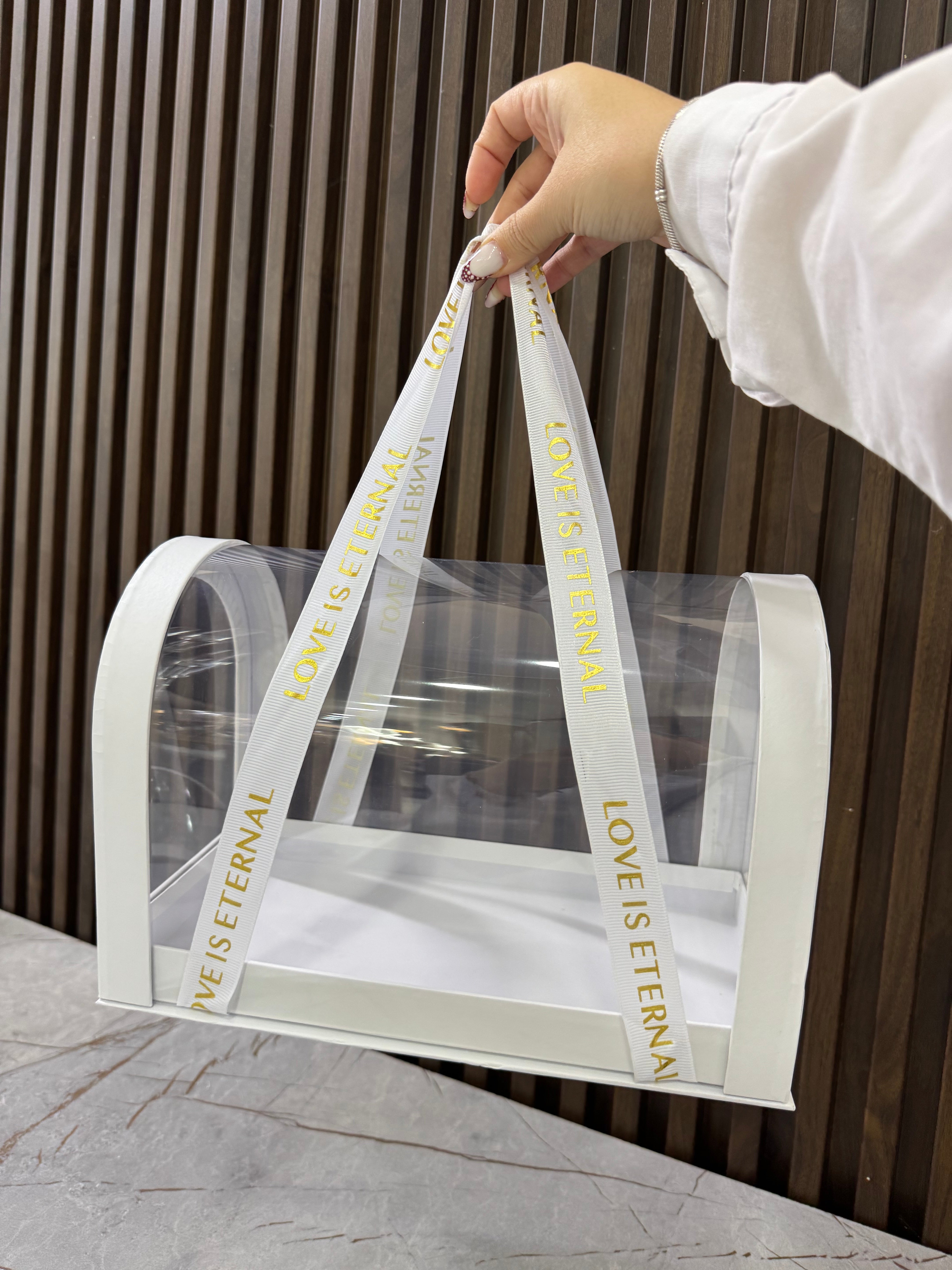 Kuti transparente për lule dhe ëmbëlsira me dorezë “Love is Eternal”