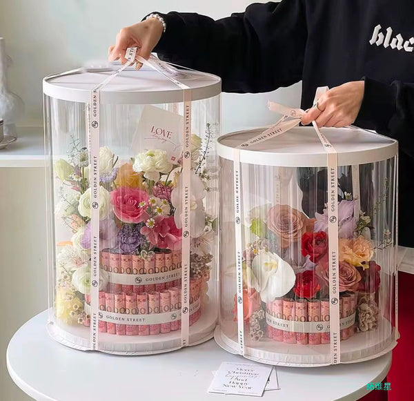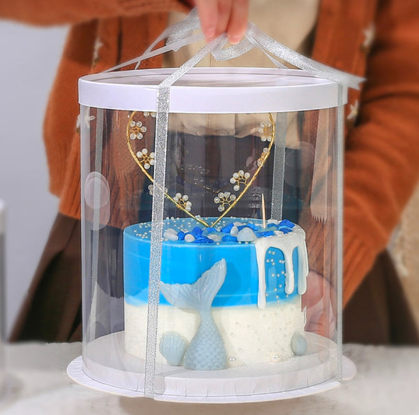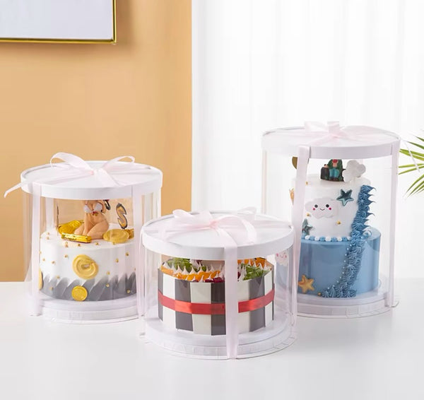 Kuti transparente rrethore për torta ose lule e dhurata me bazament në ngjyrën e bardhë, gri ose gold