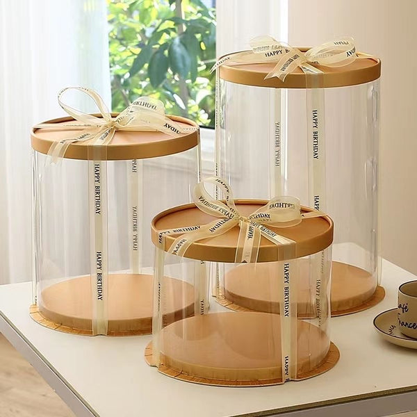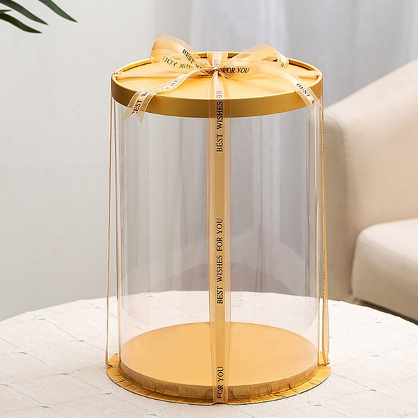 Kuti transparente rrethore për torta ose lule e dhurata me bazament në ngjyrën gold e kapak gold