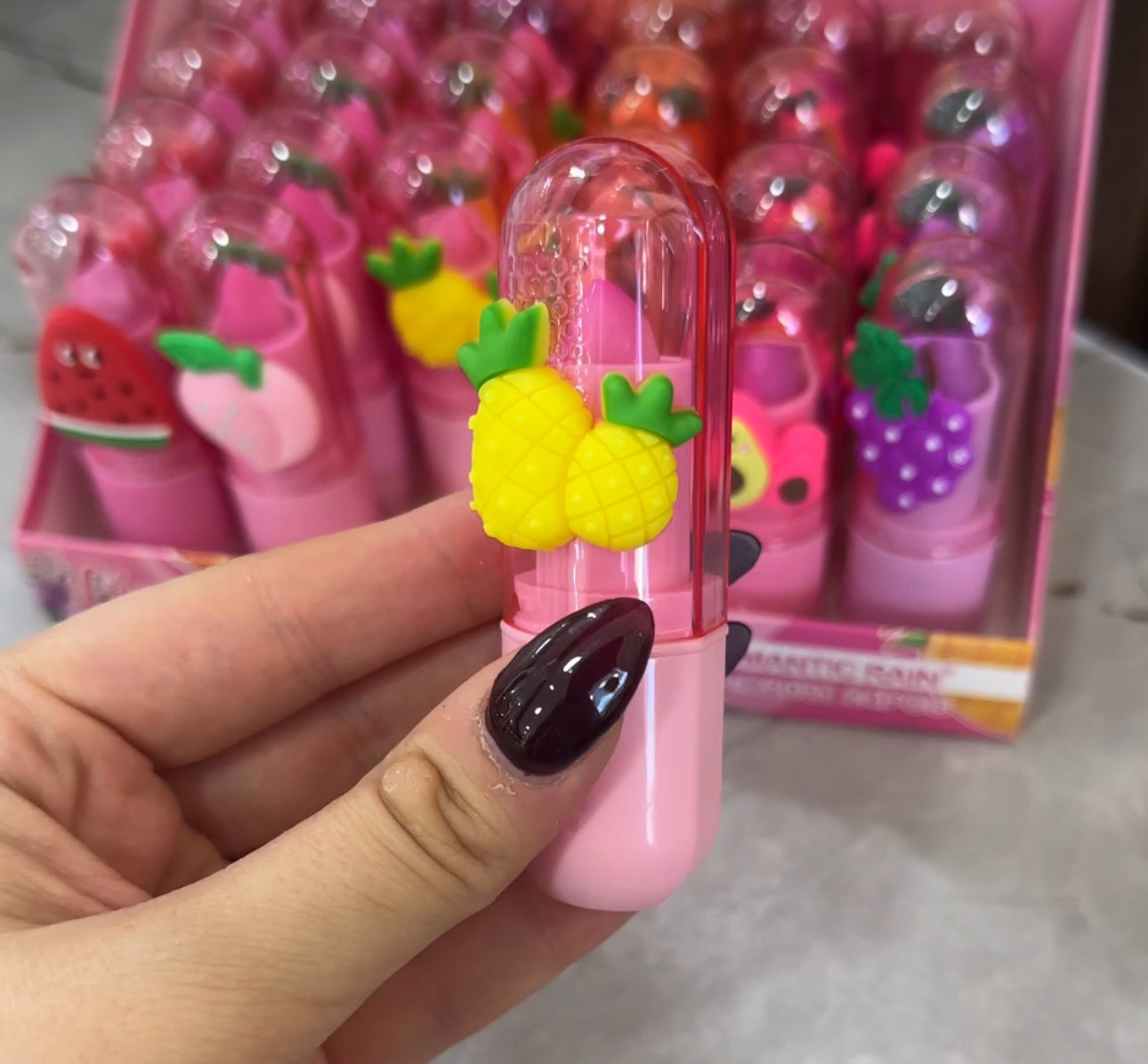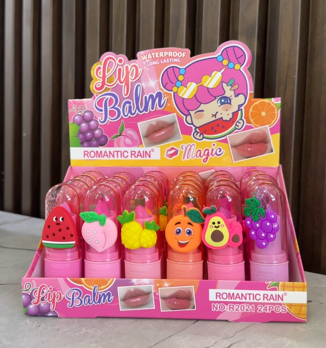 Lip balm me fruta të ndryshme shalqi, ananas, pjeshkë, portokall, rrush Romantic Rain✨ Pako me 24 copë