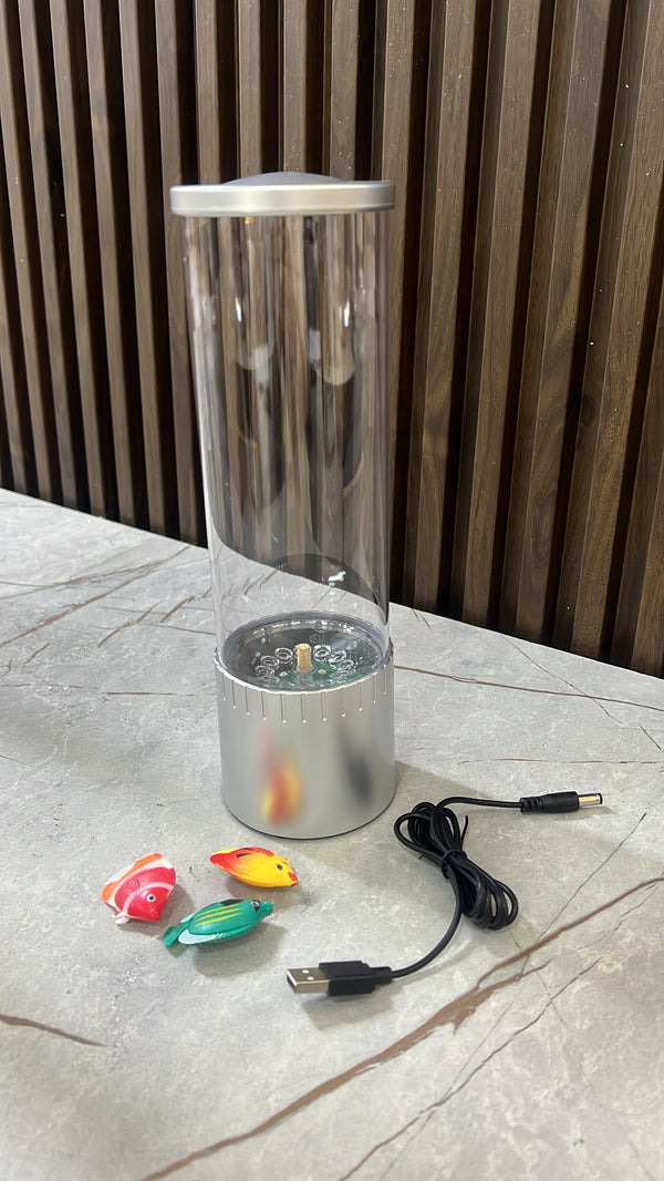 Mbushet me ujë. Permban figura peshqish/jellyfish që lëvizin në mënyrë realiste. Funksionon me kabull USB. Materiali: Xham.