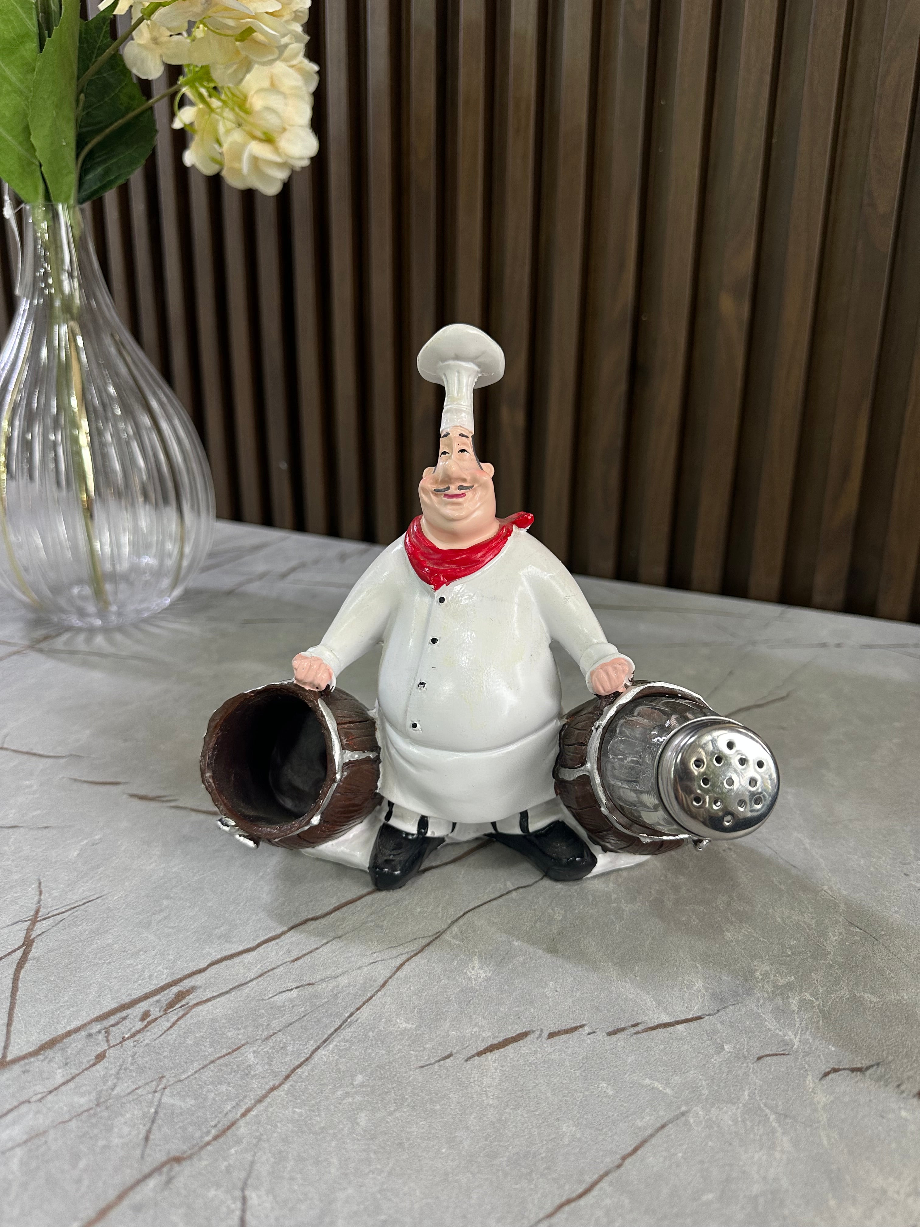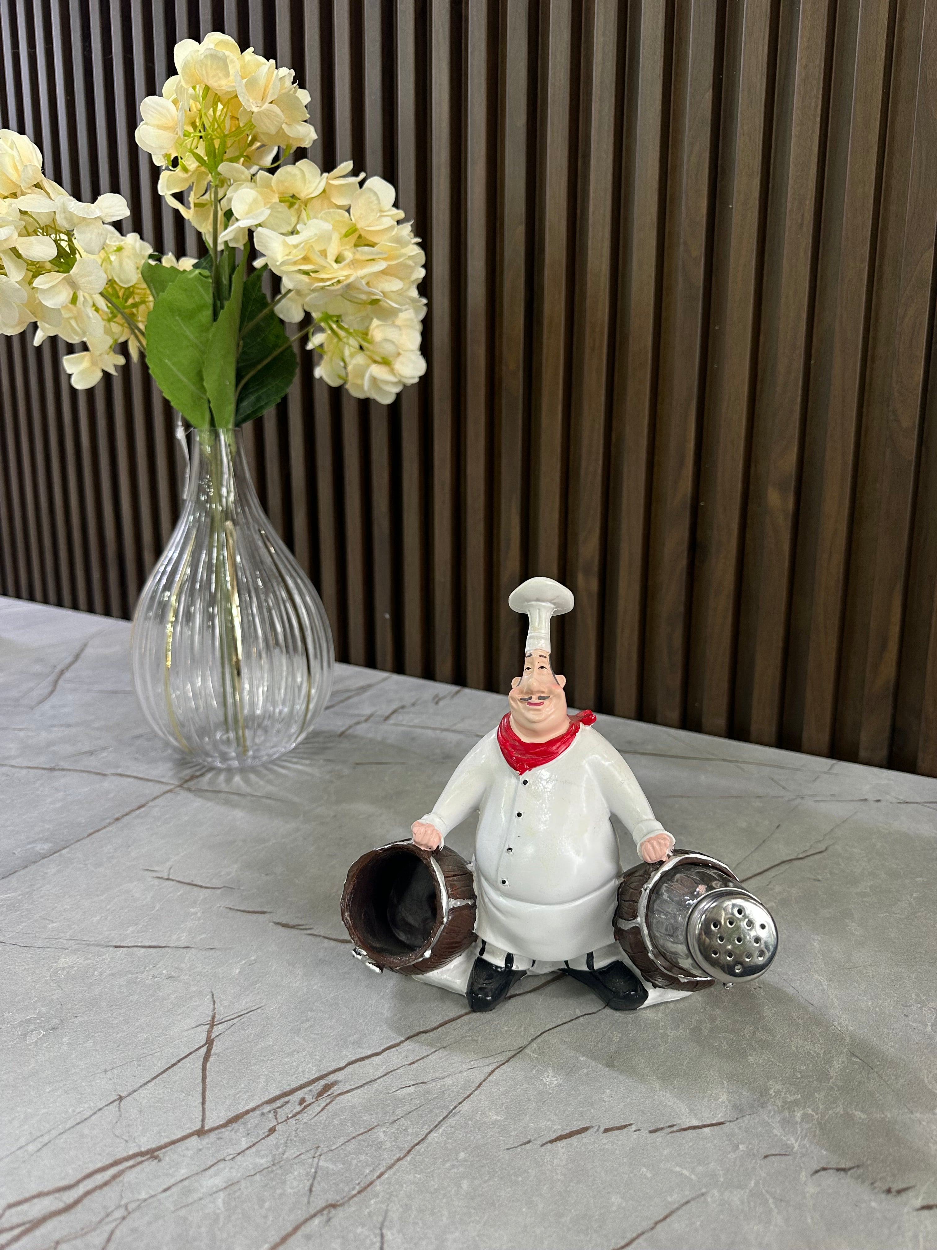 Mbajtëse dekorative për kripë dhe piper në formë shefi kuzhine, praktike dhe argëtuese, ideale për t’i dhënë kuzhinës një detaj unik. Përmasat: H20 cm.