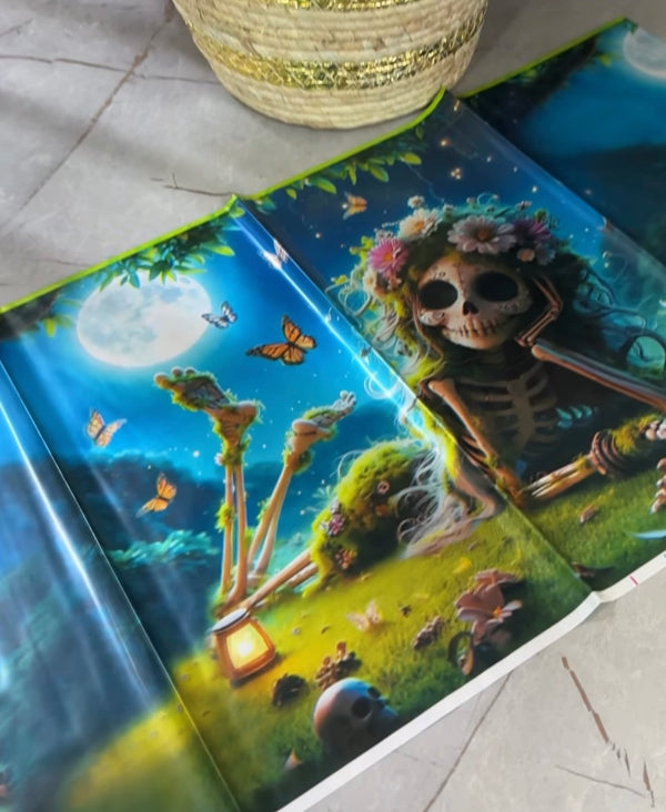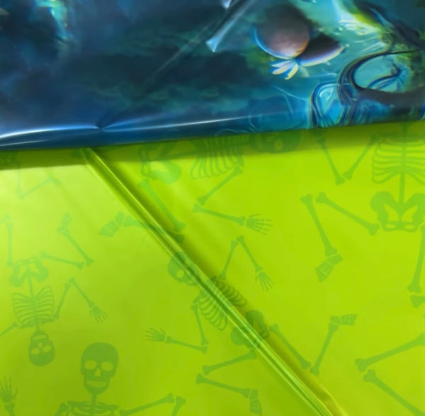 Mbulesë tavoline plastike në ngjyrën jeshile për Halloween dizajn me kafka, ideale për evente; përmasa: 137 x 183 cm
