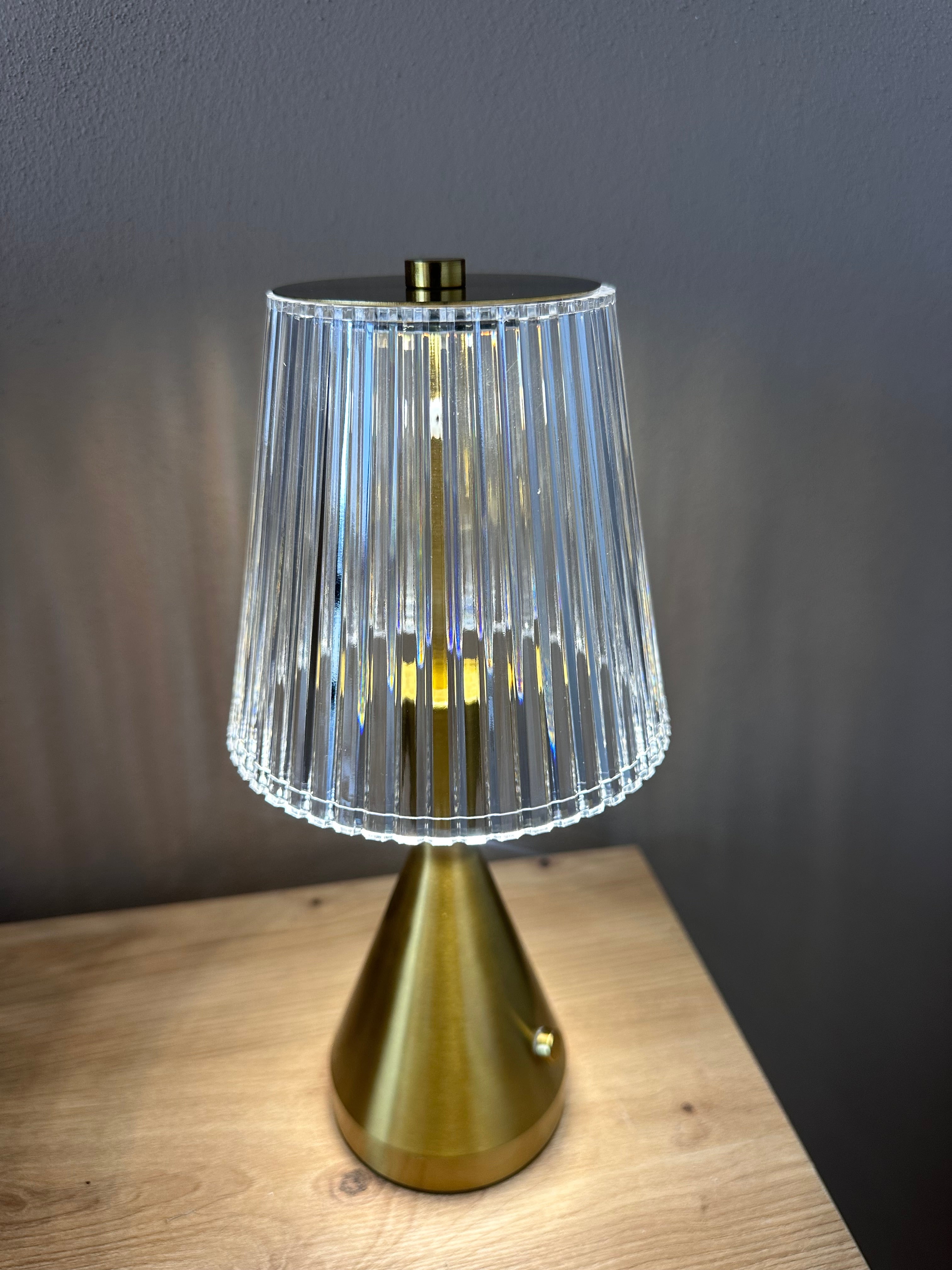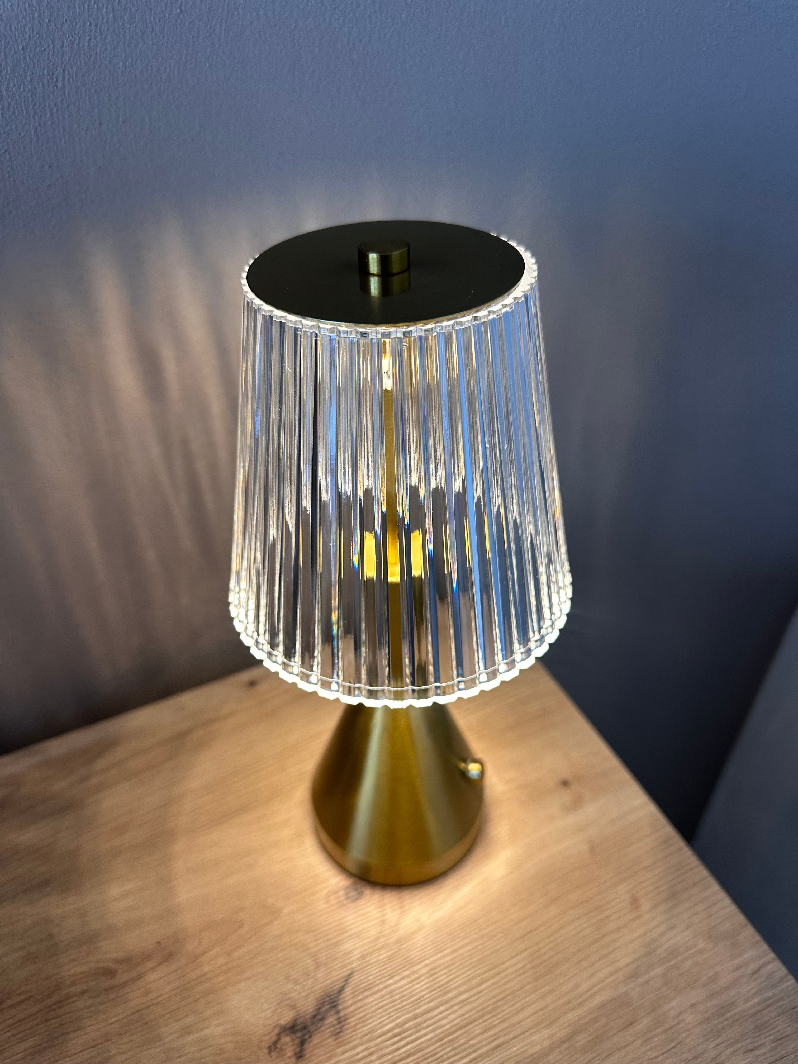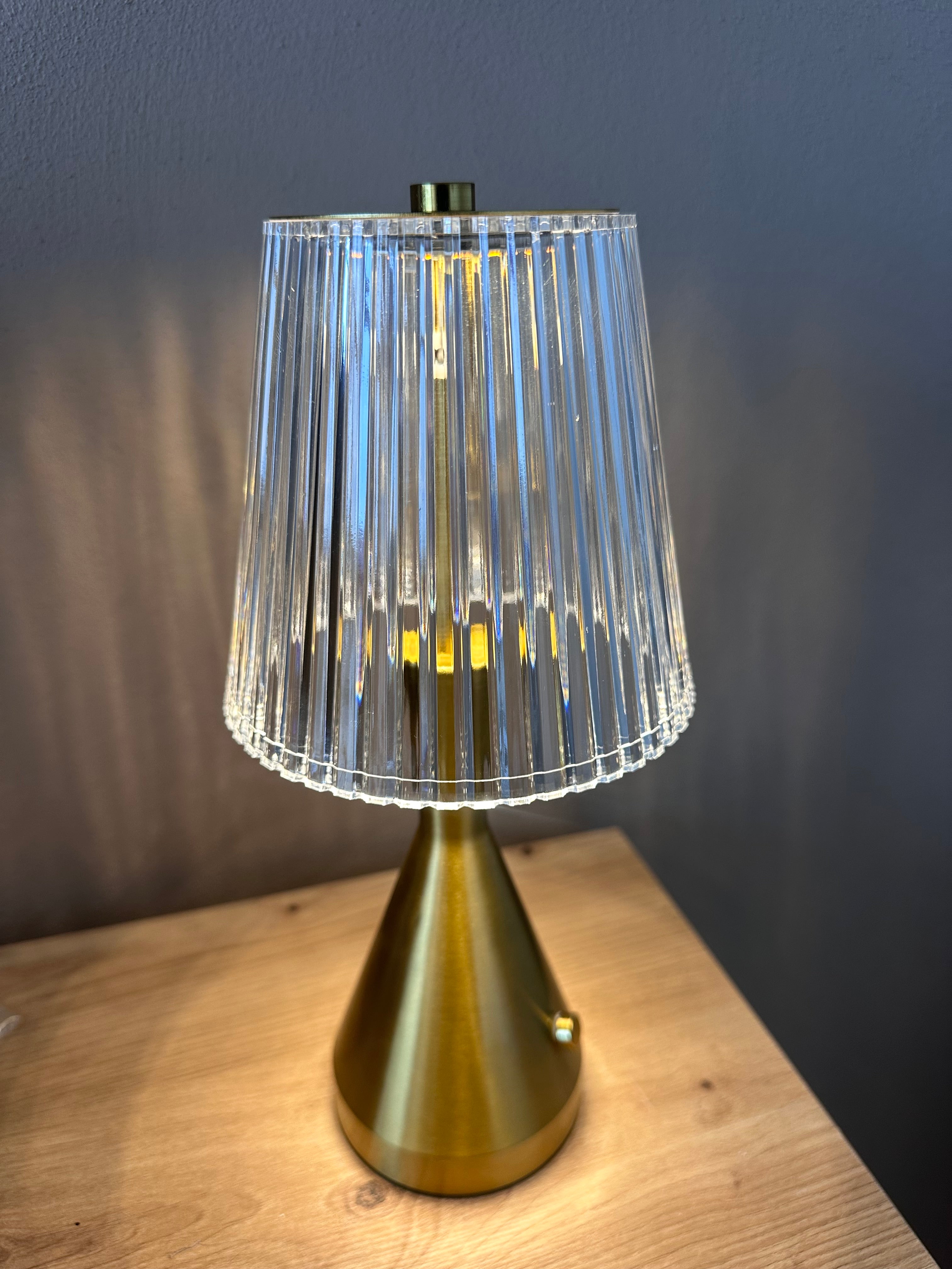 Ndriçues tavoline gold me kupolë me valëzime; 3 W ; Përmasa: 12.5 x 31 cm; Kohëzgjatje: 40.000 orë pune; Materiali: Akrilik; 3 temperatura ndriçimi