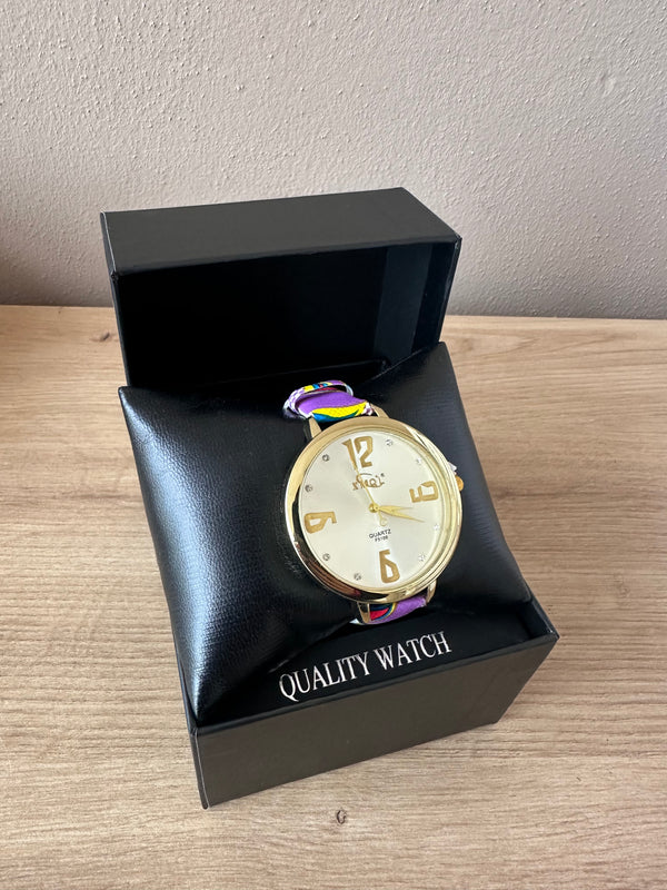 Orë për femra me fushë gold e rrip i holle imitim lëkure me figura abstrakte
