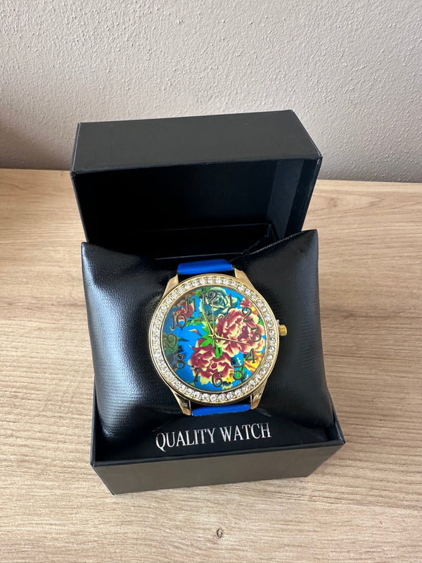 Orë për femra me fushë me dizenjo lulesh, gurë zbukures e rrip imitim lëkure