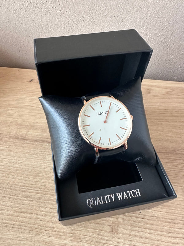 Orë për femra me fushtë të bardhë e gold me rrip imitim lëkure i zi