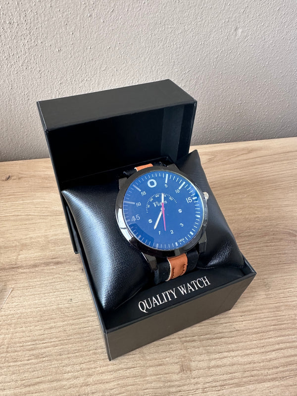 Orë për meshkuj me fushë blu e rrip imitim lëkure të zezë me detaje kafe