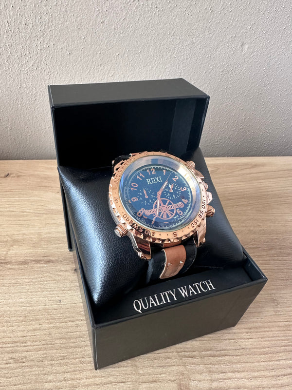 Orë për meshkuj rose gold me rrip të zi imitim lëkure e detaje kafe