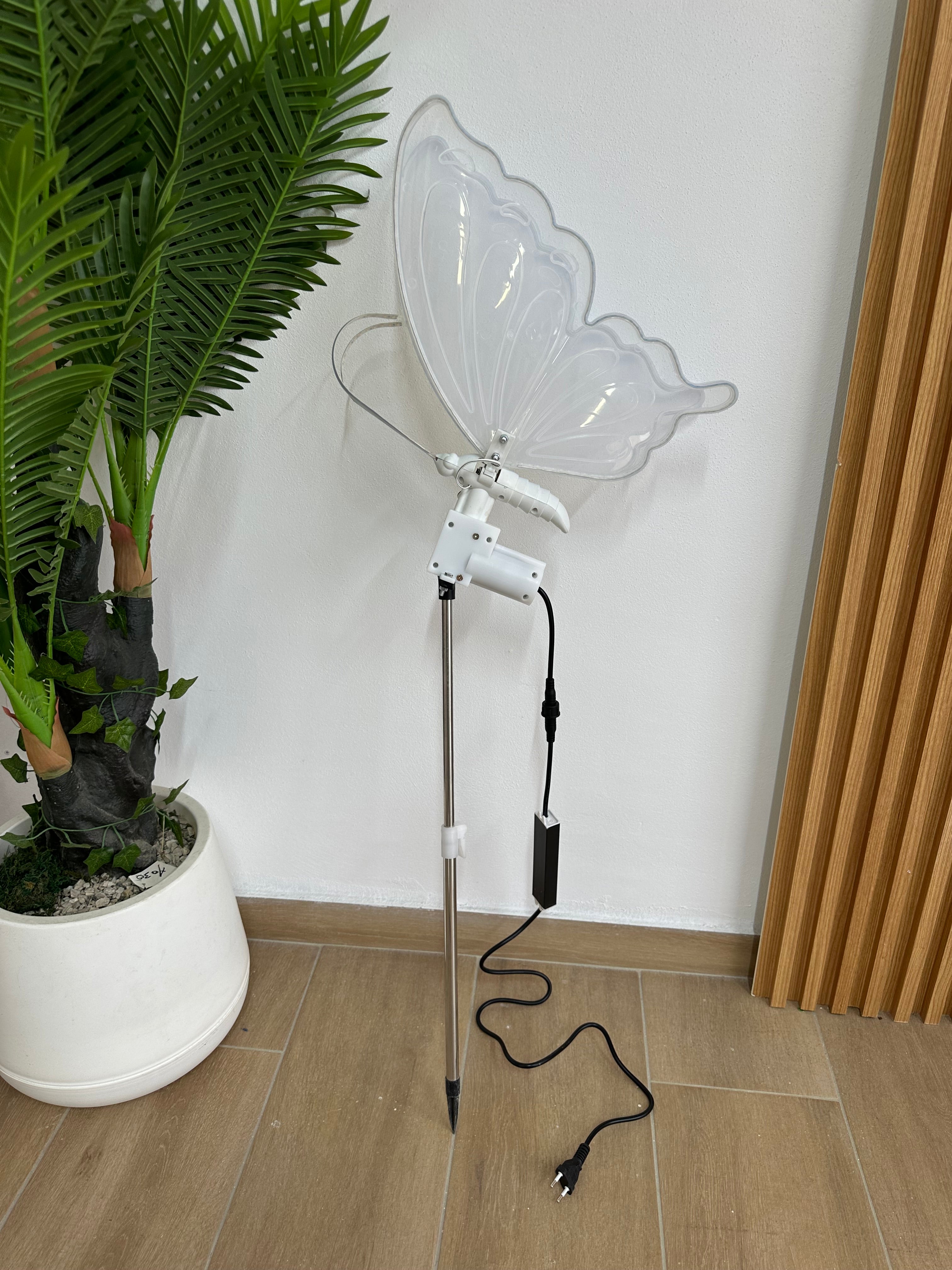Panel dekorativ LED në formë fluture për kopsht, me ndriçim të butë për ambiente të jashtme. Montim i lehtë në tokë. Përmasat: H110 cm. Materiali: Inox + plastike. Elektrike.