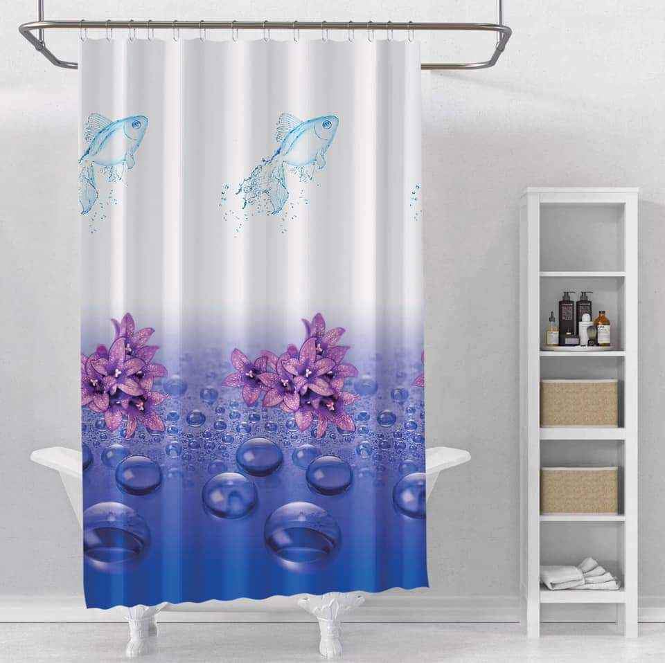 Perde dushi me peshq dhe lule lejla; Përmasa: 180 x 180 cm; Waterproof; Lahet shumë kollaj