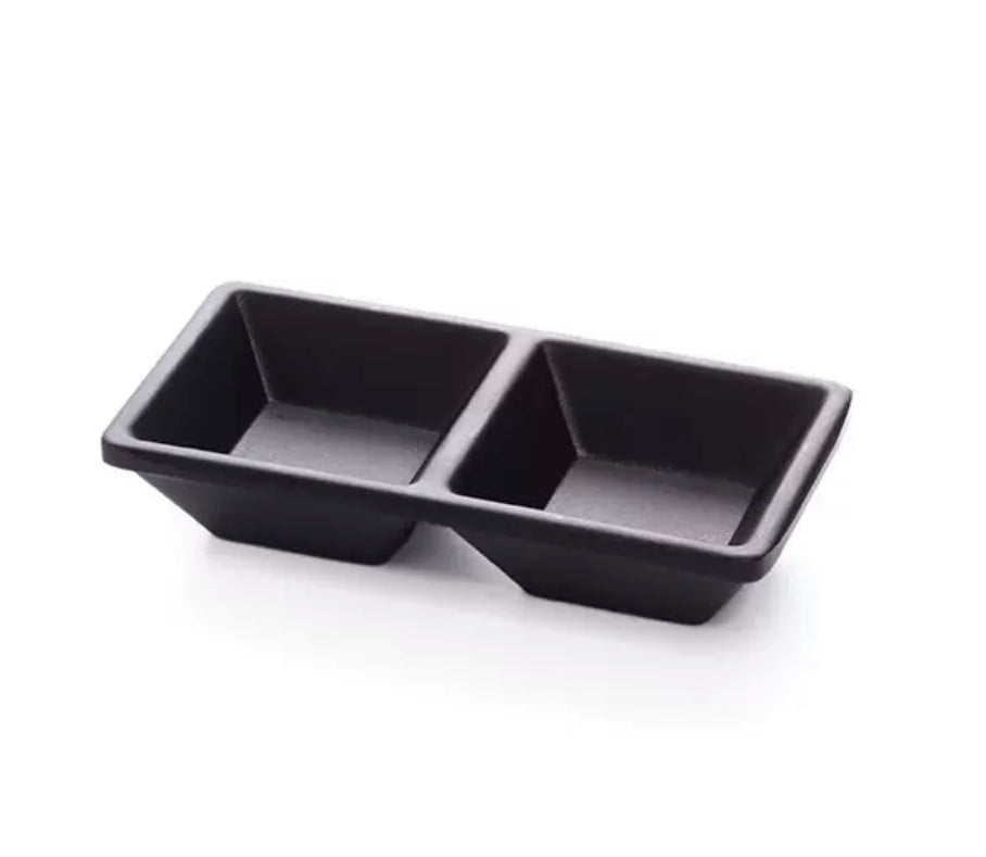 Pjatë melamine e zezë për salca me dy ndarje 10.5 cm x 7 cm
