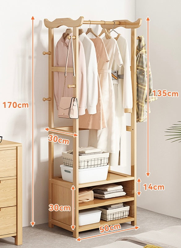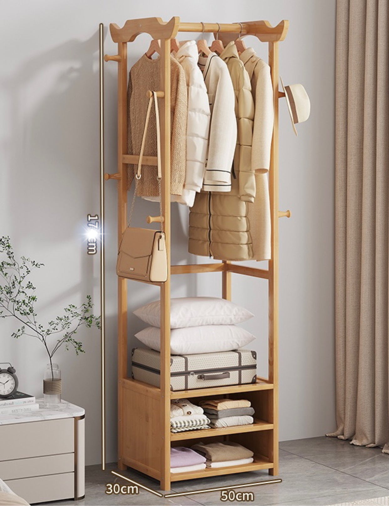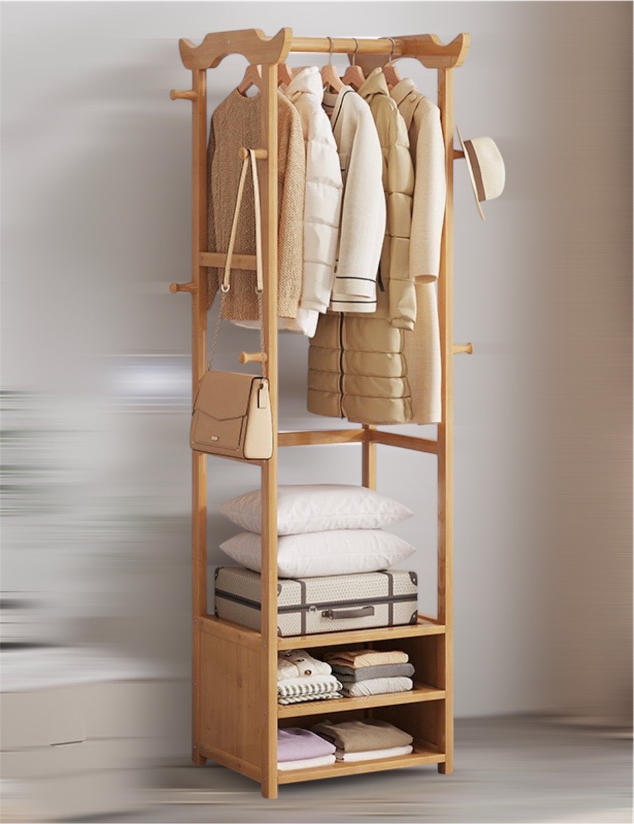Raft rrobash bamboo me një dizanj super të bukur për shtëpinë tuaj. E pajisur me varëse dhe sirtarë të hapur, zonën e veshjeve për të varur këmisha, fustane, pantallona, pallto...