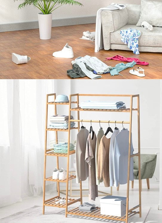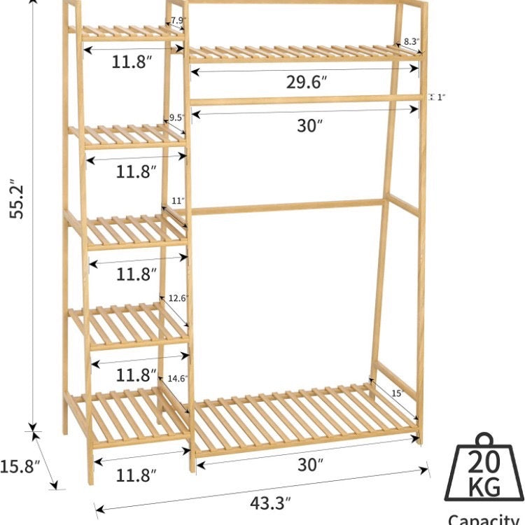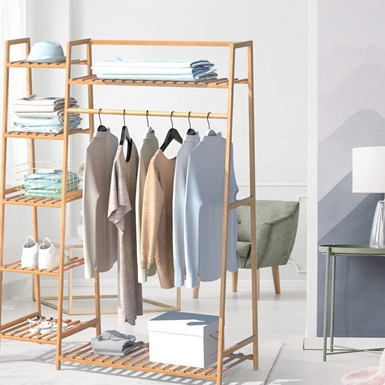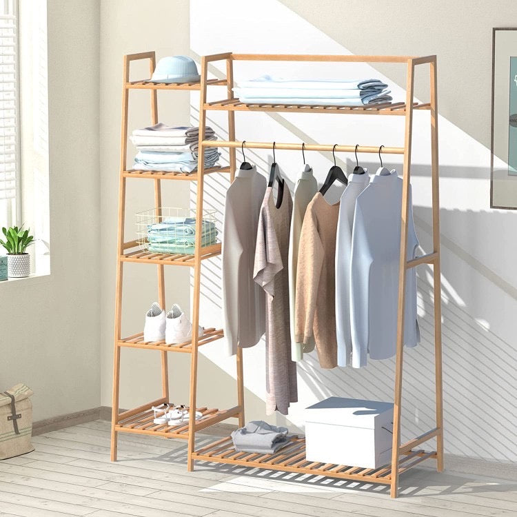 Raft rrobash bamboo me një dizanj super të bukur për shtëpinë tuaj. E pajisur me rafte, 5 kate të hapura, zonën e veshjeve për të varur këmisha, fustane, pantallona, pallto...