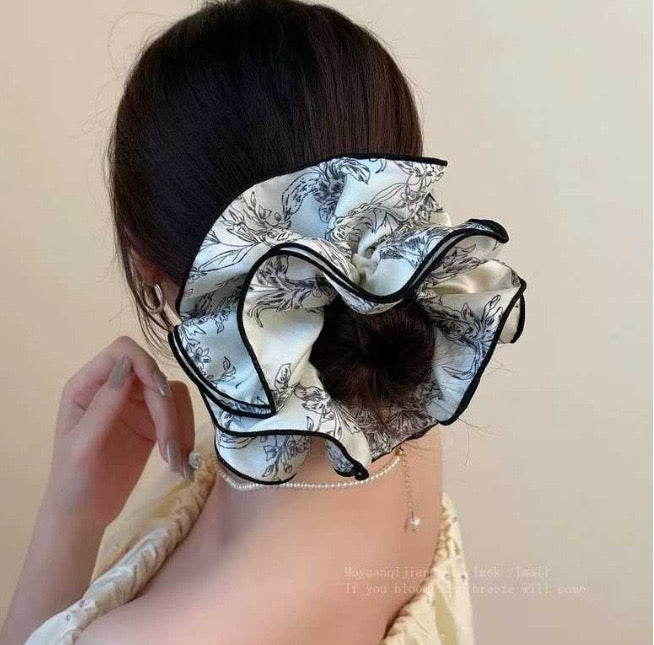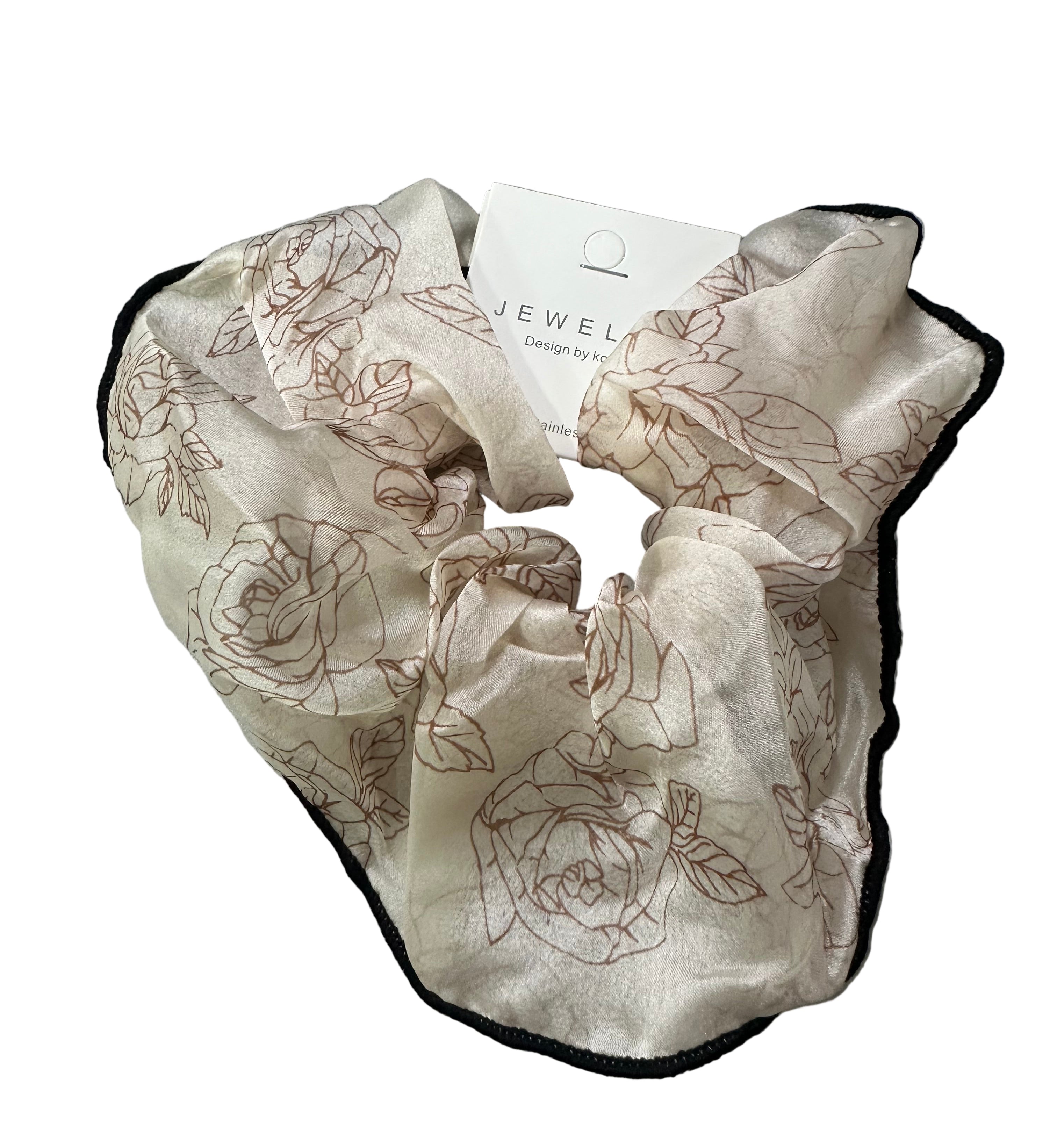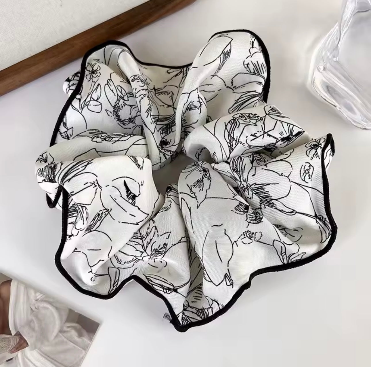 Scrunchie organza me motive lulesh dhe kontur të zi. E lehtë dhe ideale për çdo stil flokësh. Ngjyra: E zezë, e blu, uthull. E përshtatshme: Për fëmijë dhe të rritur....