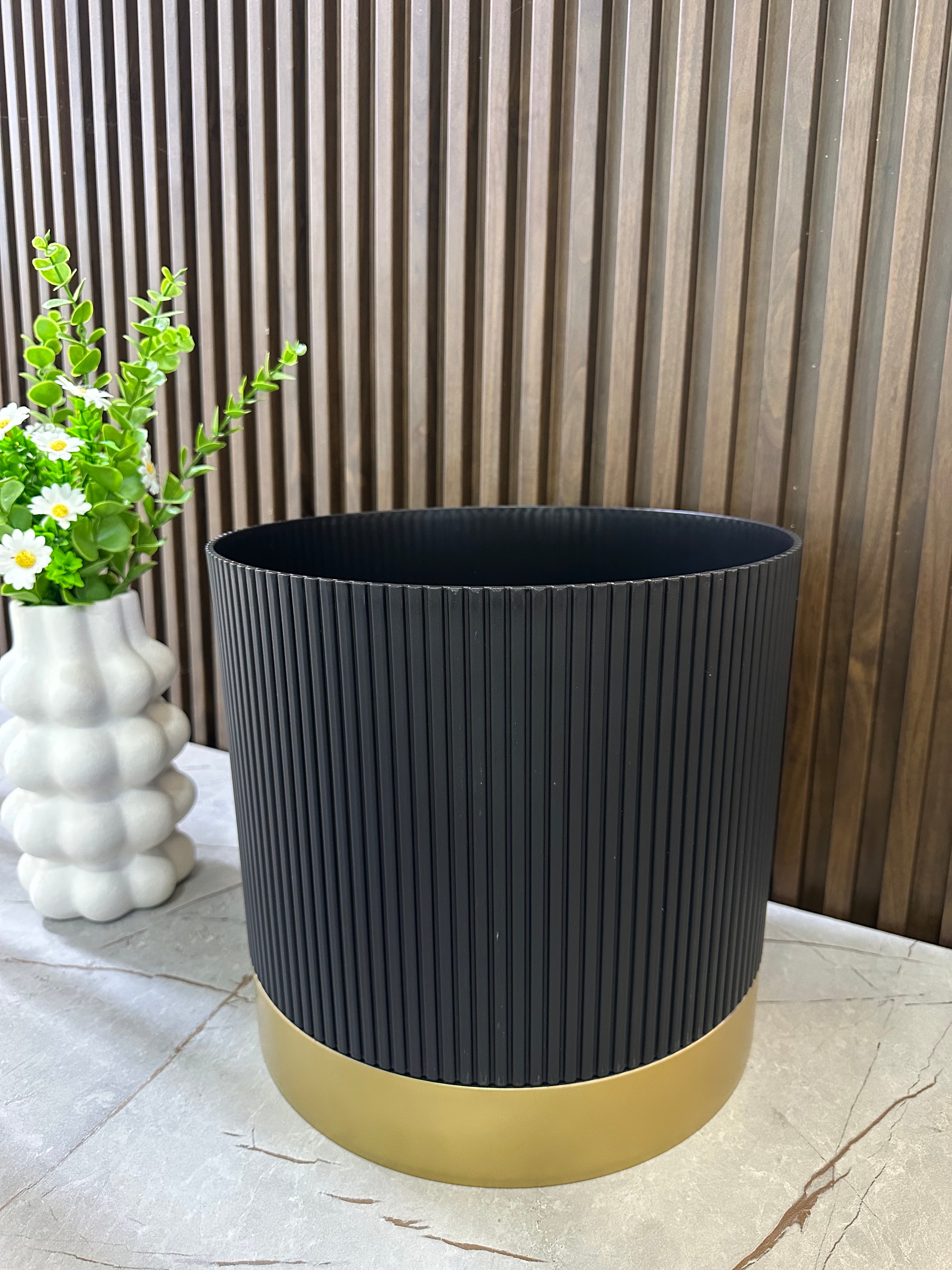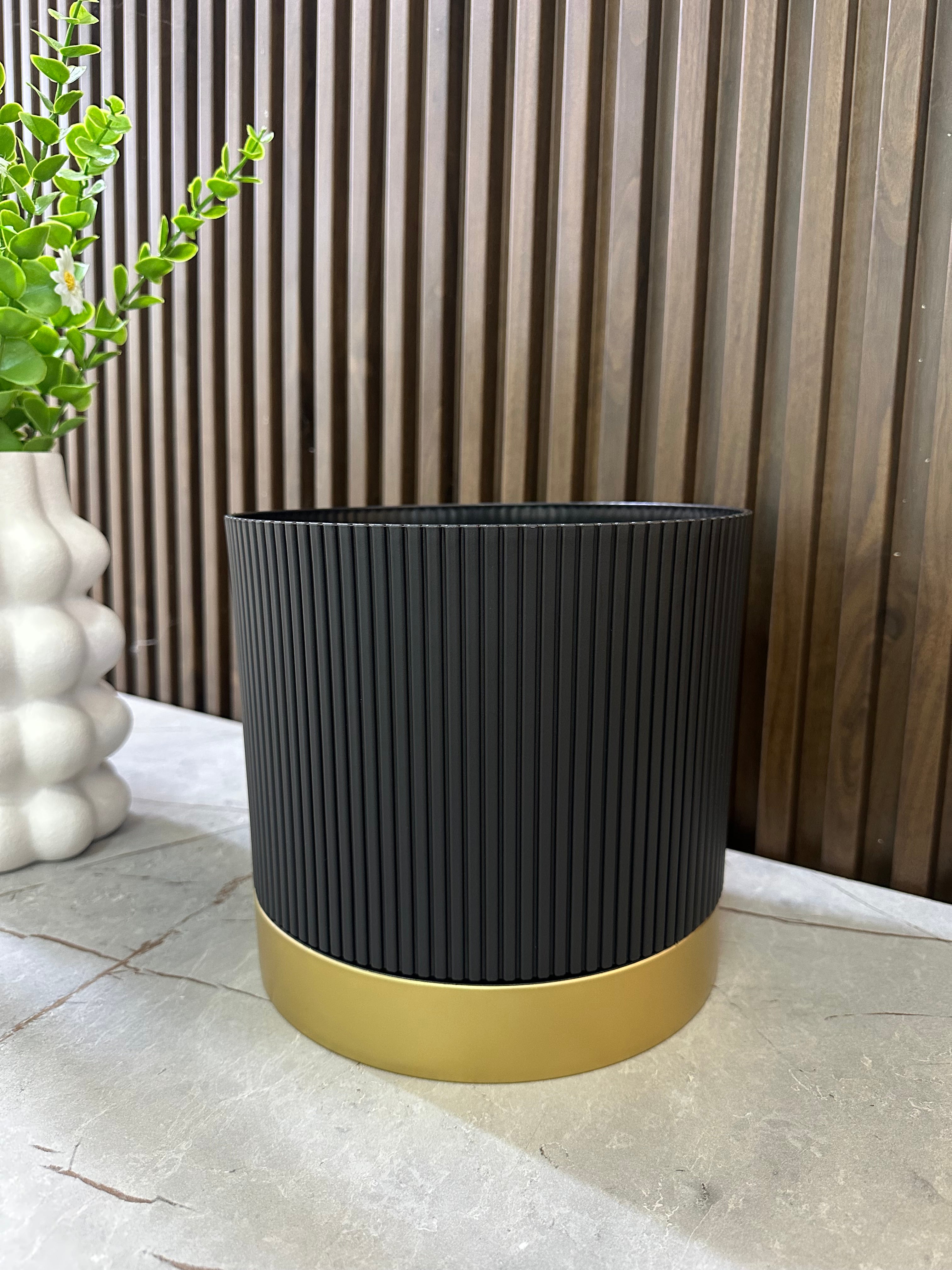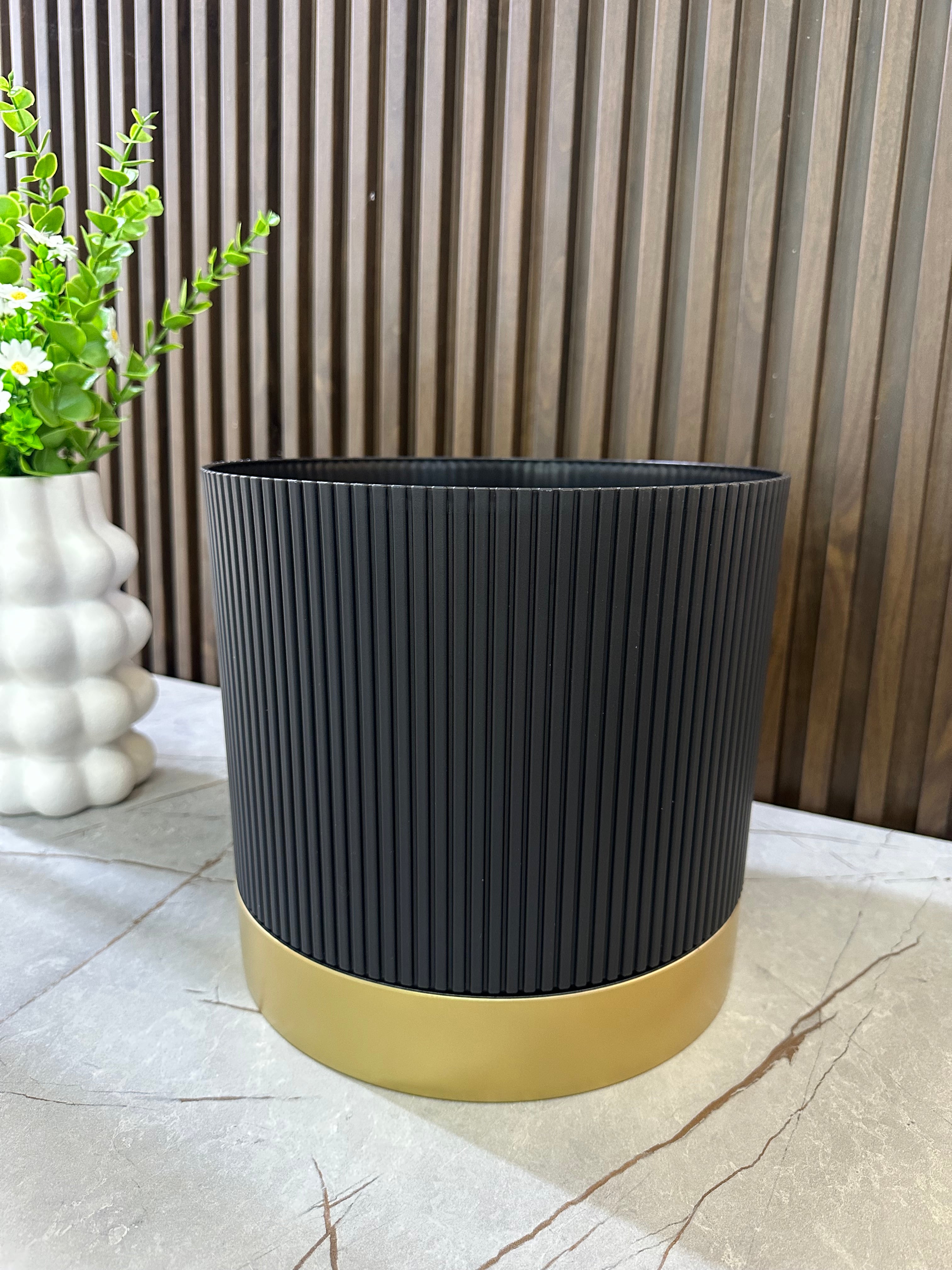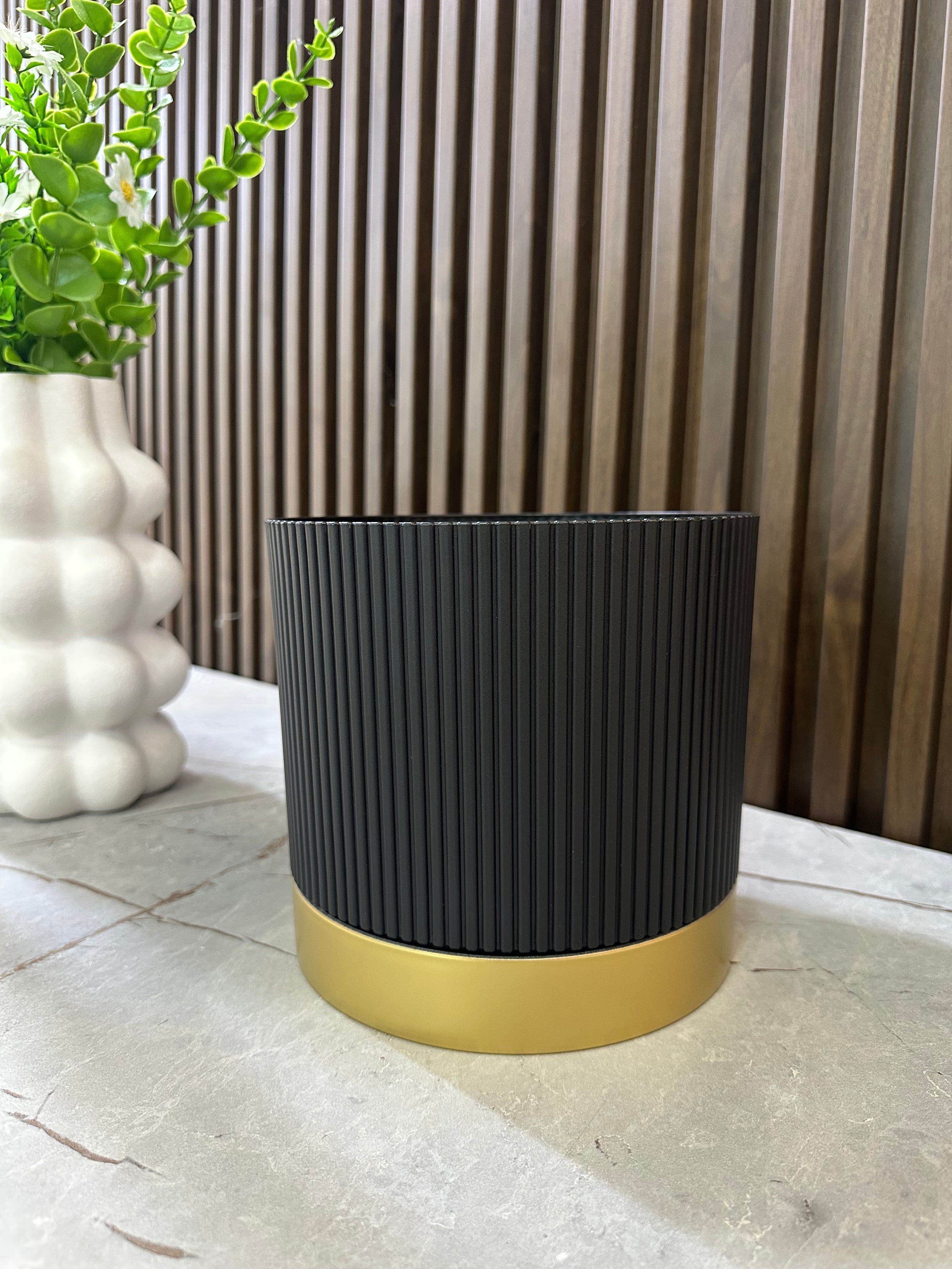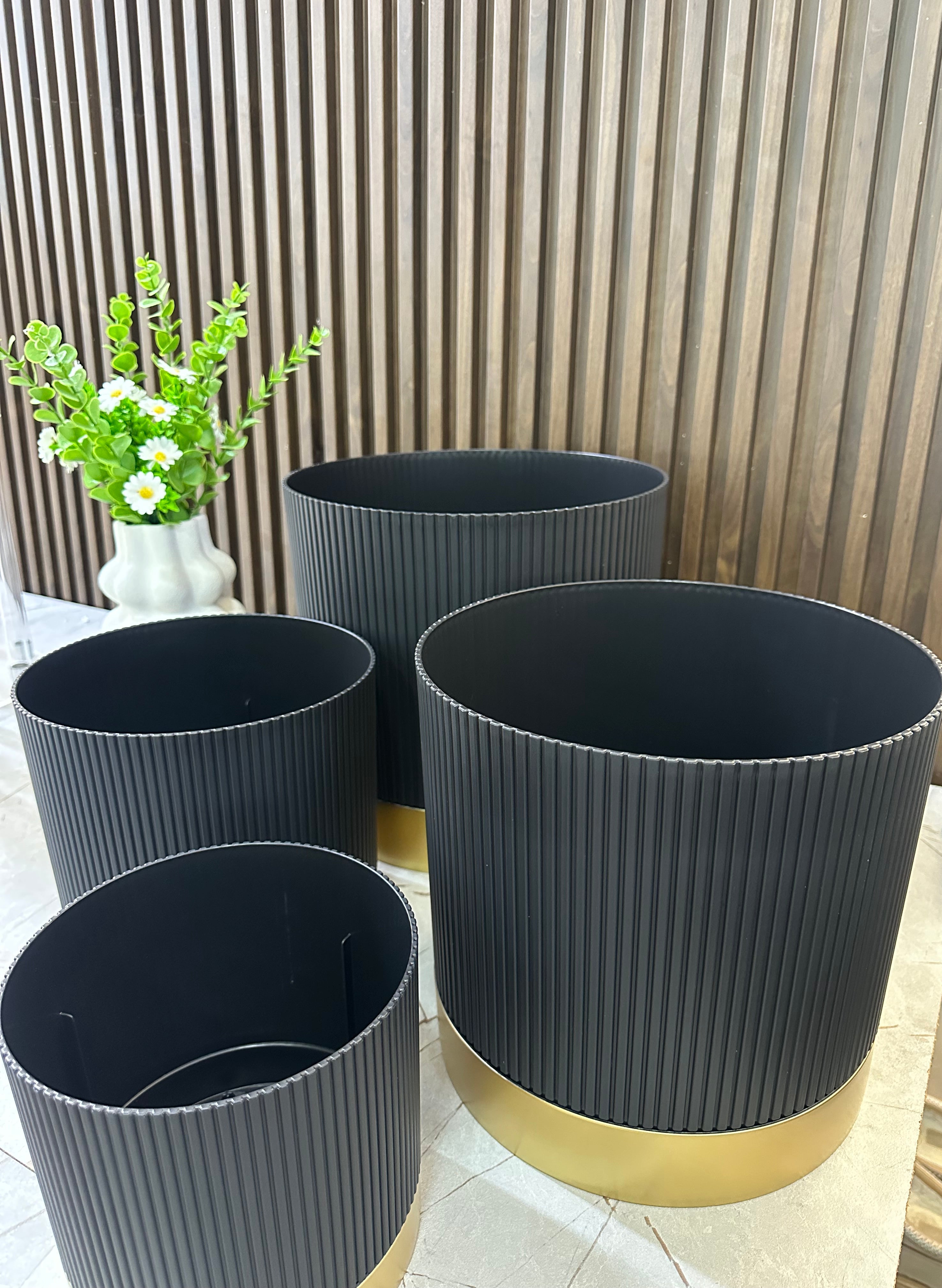 Vazo plastike lulesh, set 4 pcs, cilindrike, me vija vertikale dhe detaj gold, e zezë
