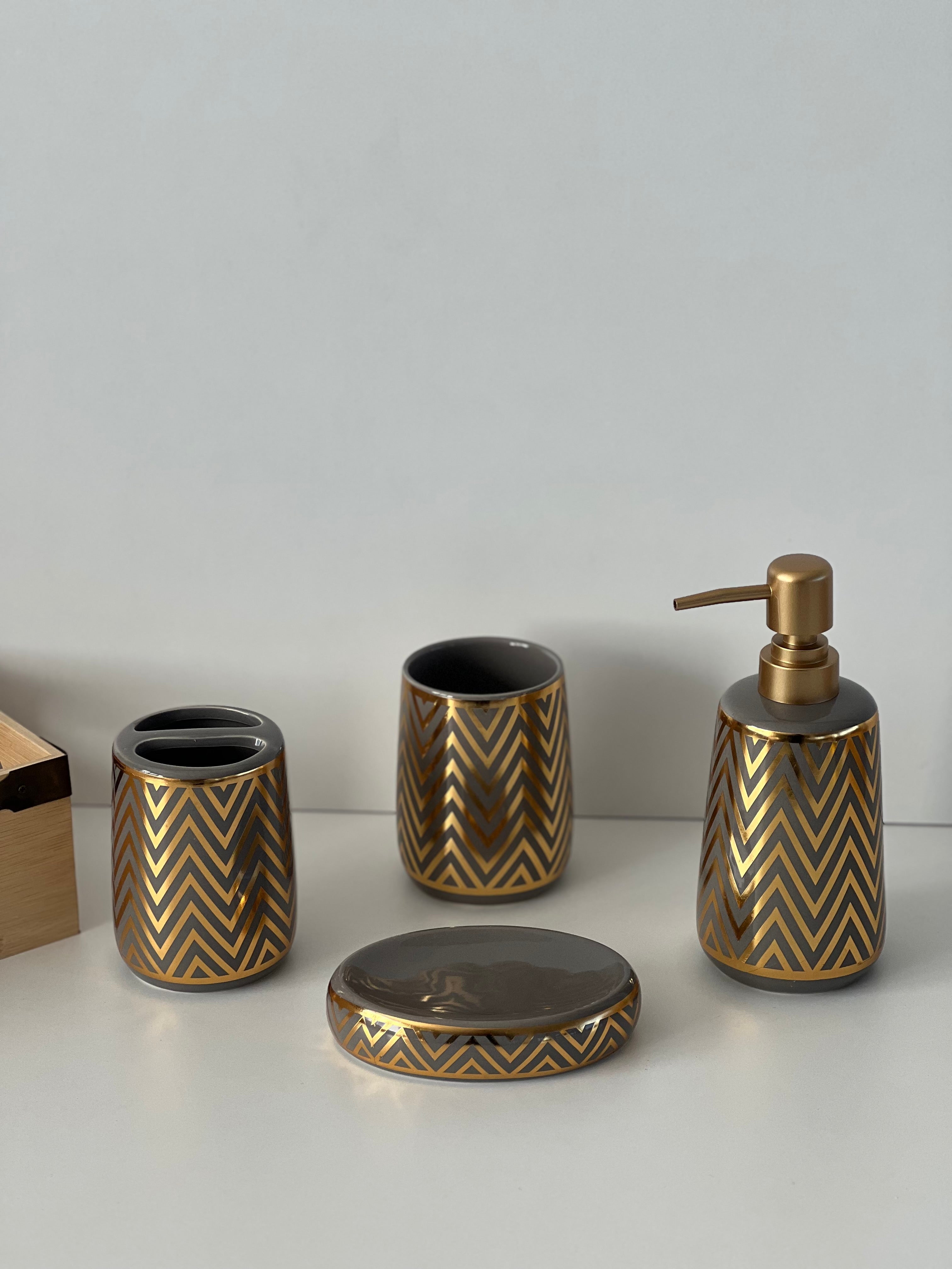 Materiali: qeramikeNgjyra: gri (me gold) Dimensionet: 18*7.5cm (dispenseri për sapunit e lëngshëm) 12*2.5 (mbajtësja e sapunit) 10*7cm (mbajtëse për furçet dhe mbajtëse për aksesorë)