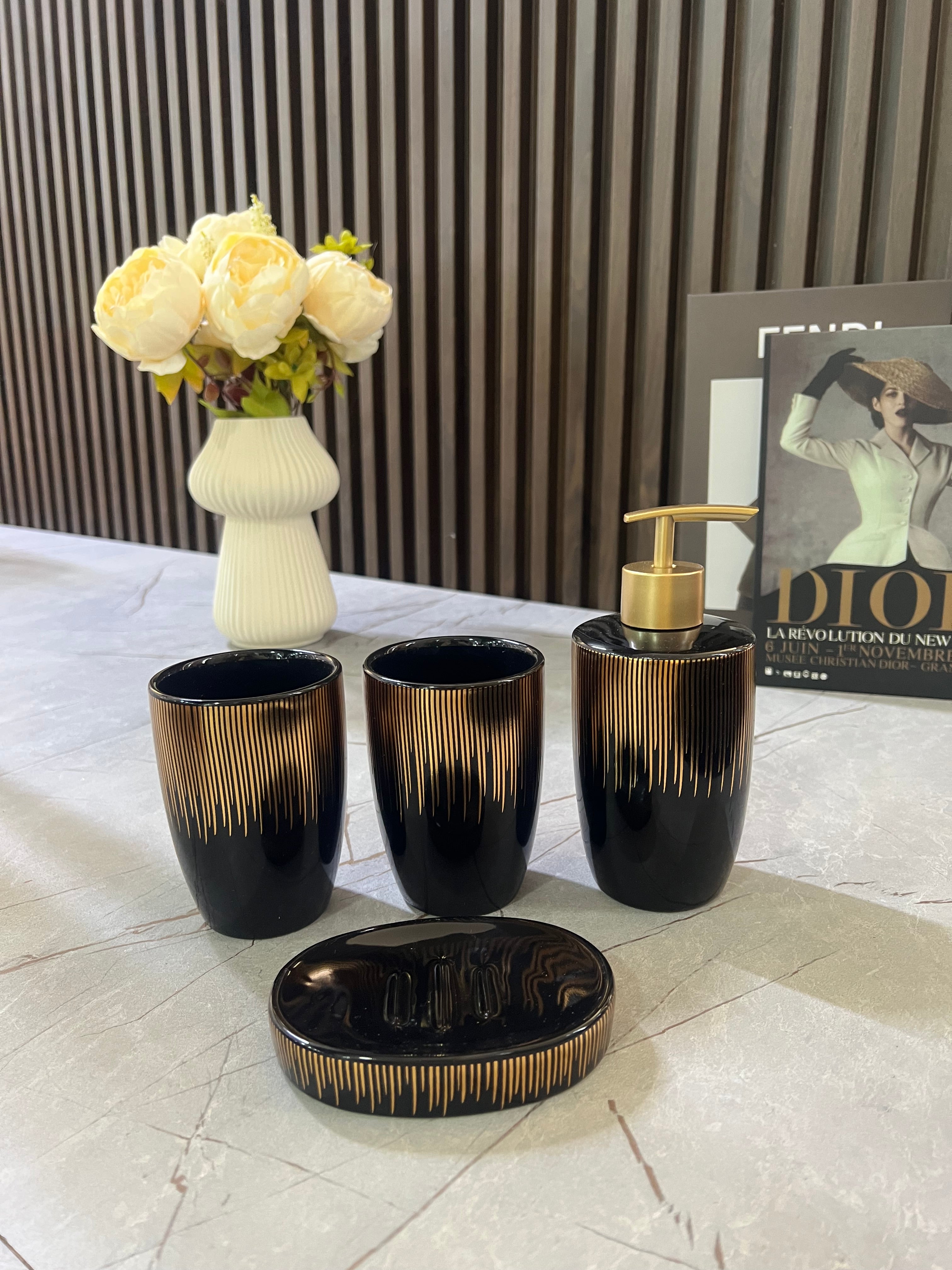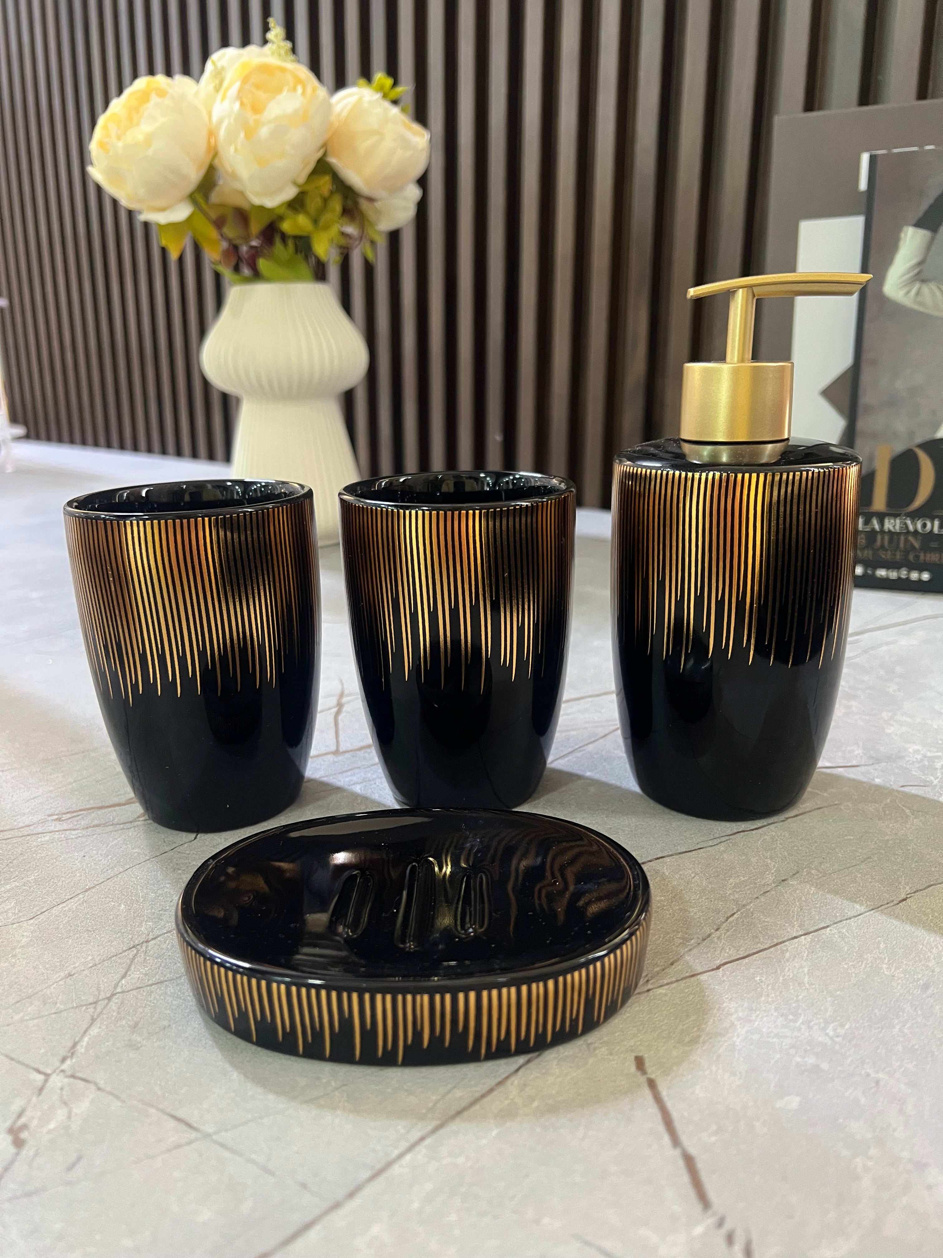 Set aksesorësh tualet në ngjyrë të zezë me detaje gold