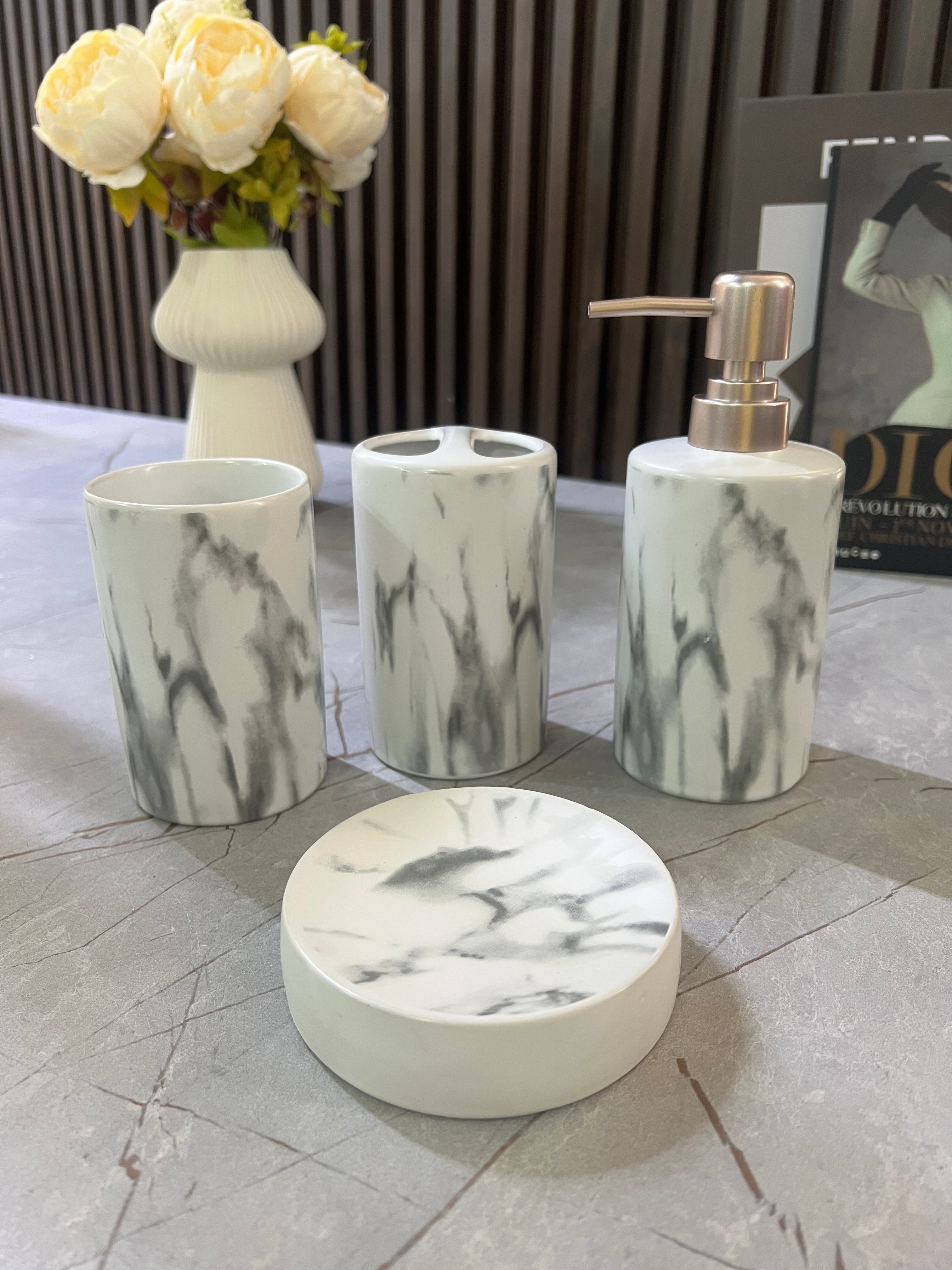Set aksesorësh për tualet me efekt mermeri, përfshin dispenser sapuni, gota dhe mbajtëse sapuni. Materiali: Metalike.