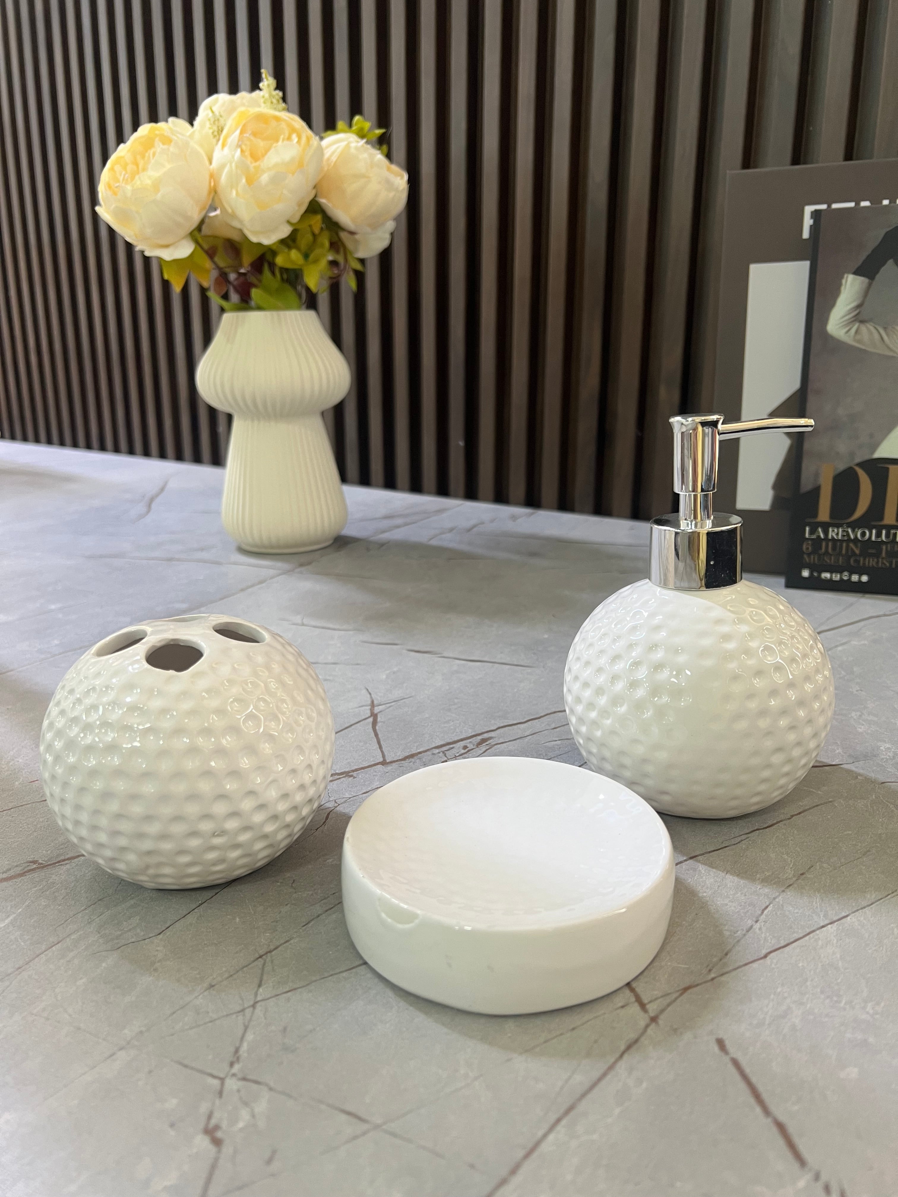Set aksesorësh për tualet në ngjyrë të bardhë me teksturë, përfshin dispenser sapuni, mbajtëse furçash dhëmbësh dhe mbajtëse sapuni. Materiali: Qeramike.