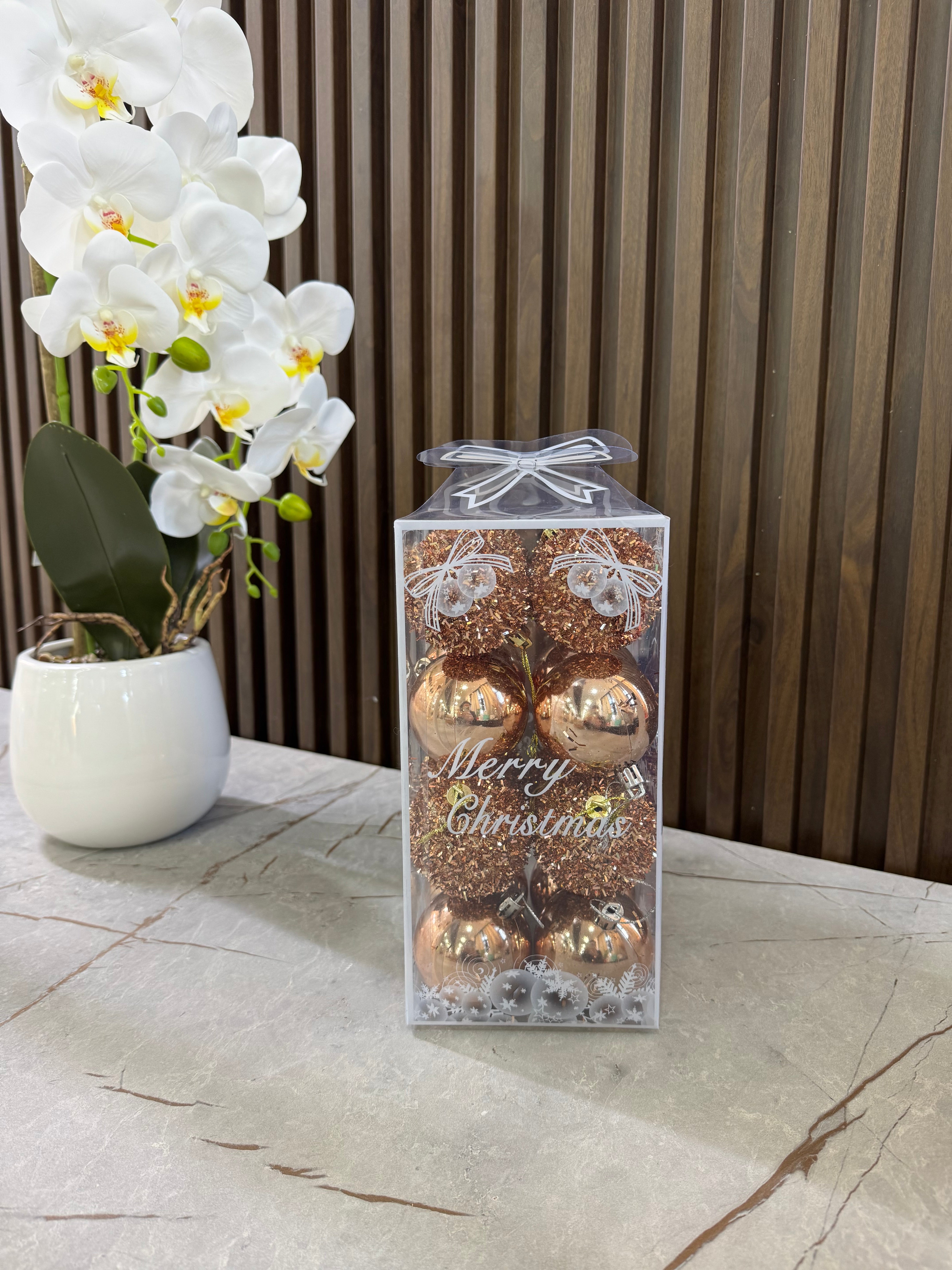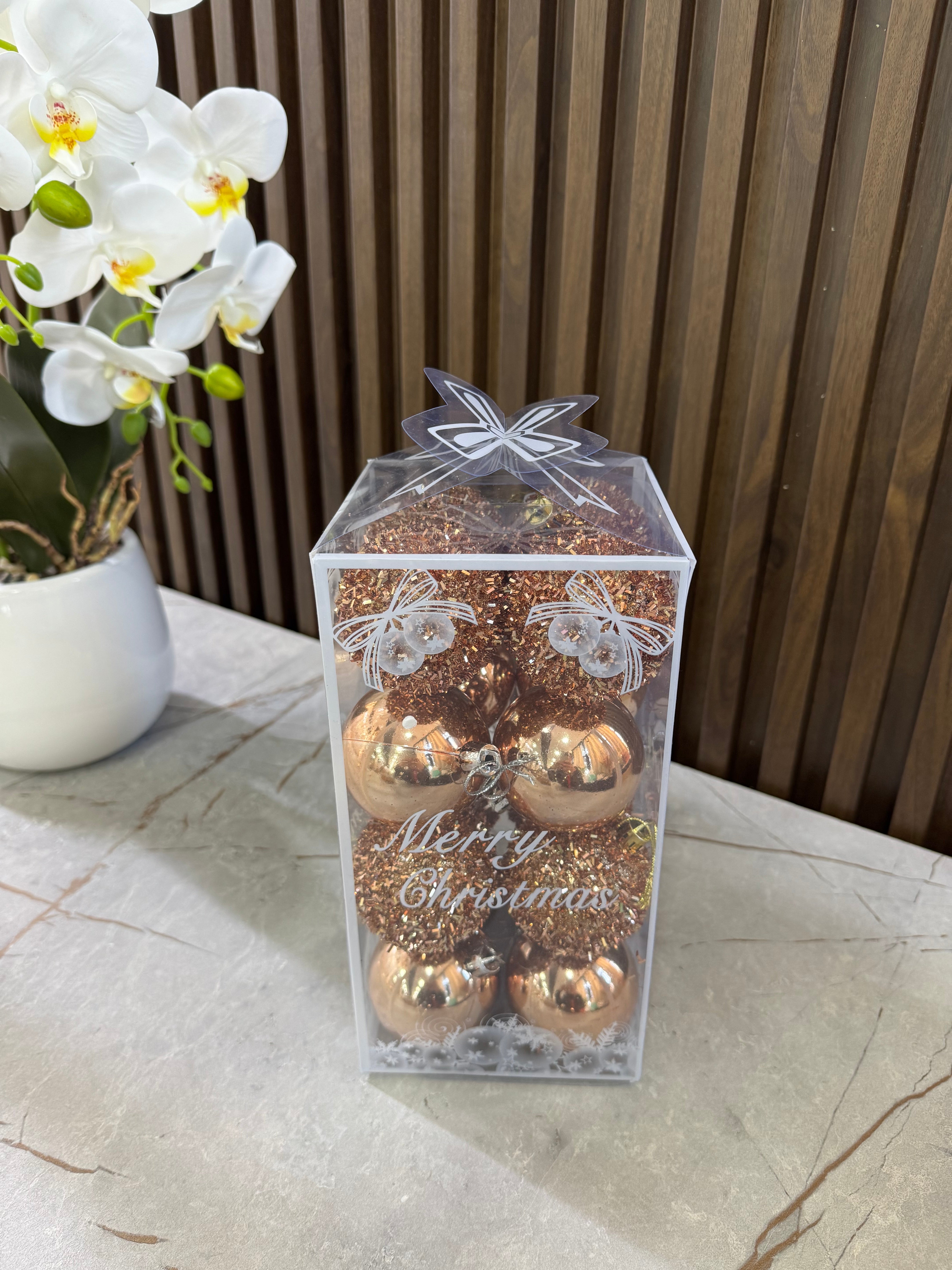 Set dekorativ topa për festa, në kuti transparente