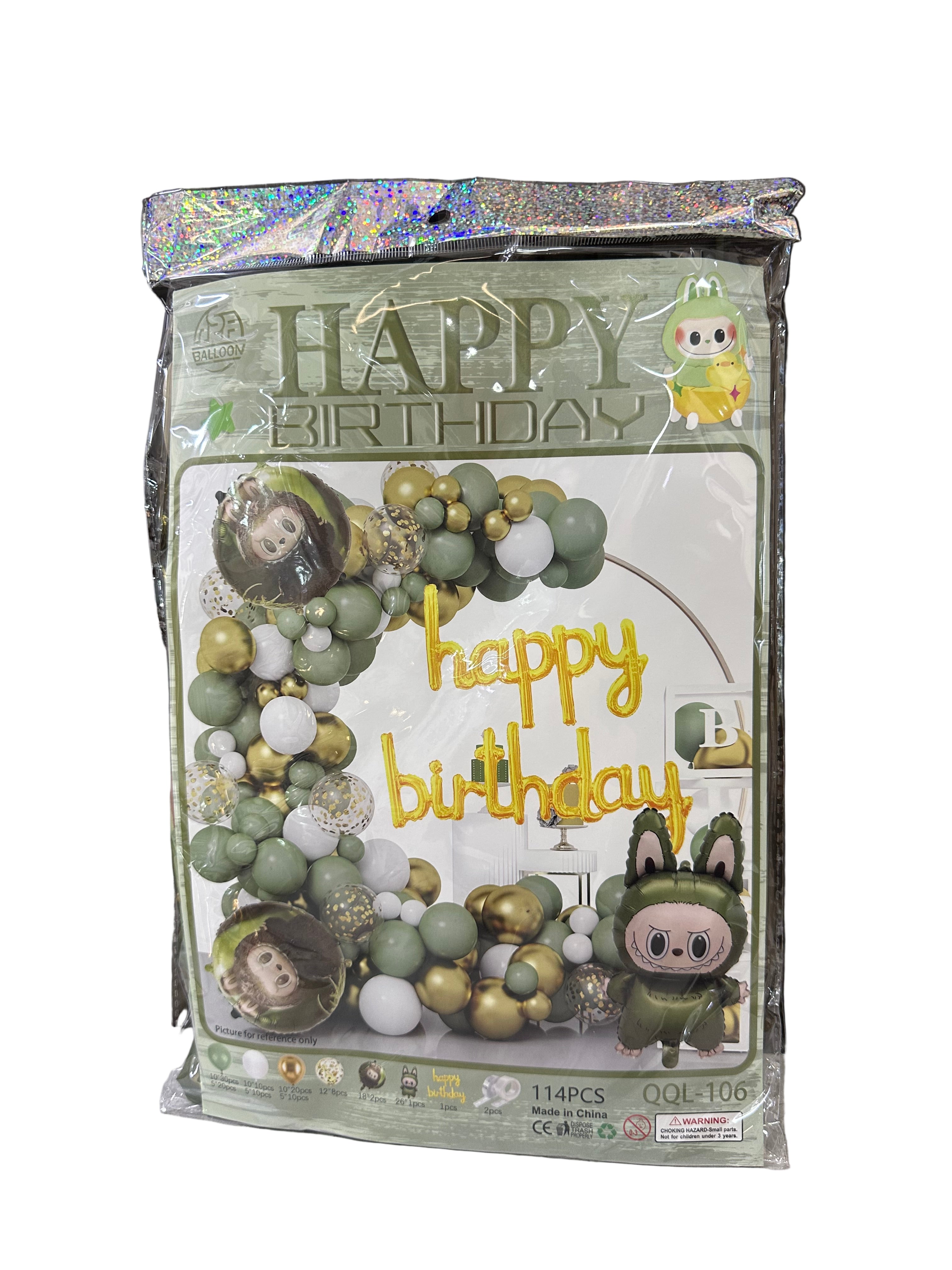 Set dekorimi “Happy Birthday” LABUBU me 114 copë, përfshin tullumbace shumëngjyrëshe dhe figura dekorative. Ideal për festa ditëlindjeje plot ngjyra dhe argëtim. Ngjyrat: Jeshile, gold, bardhë. Përfshin:  30 tullumbace të...