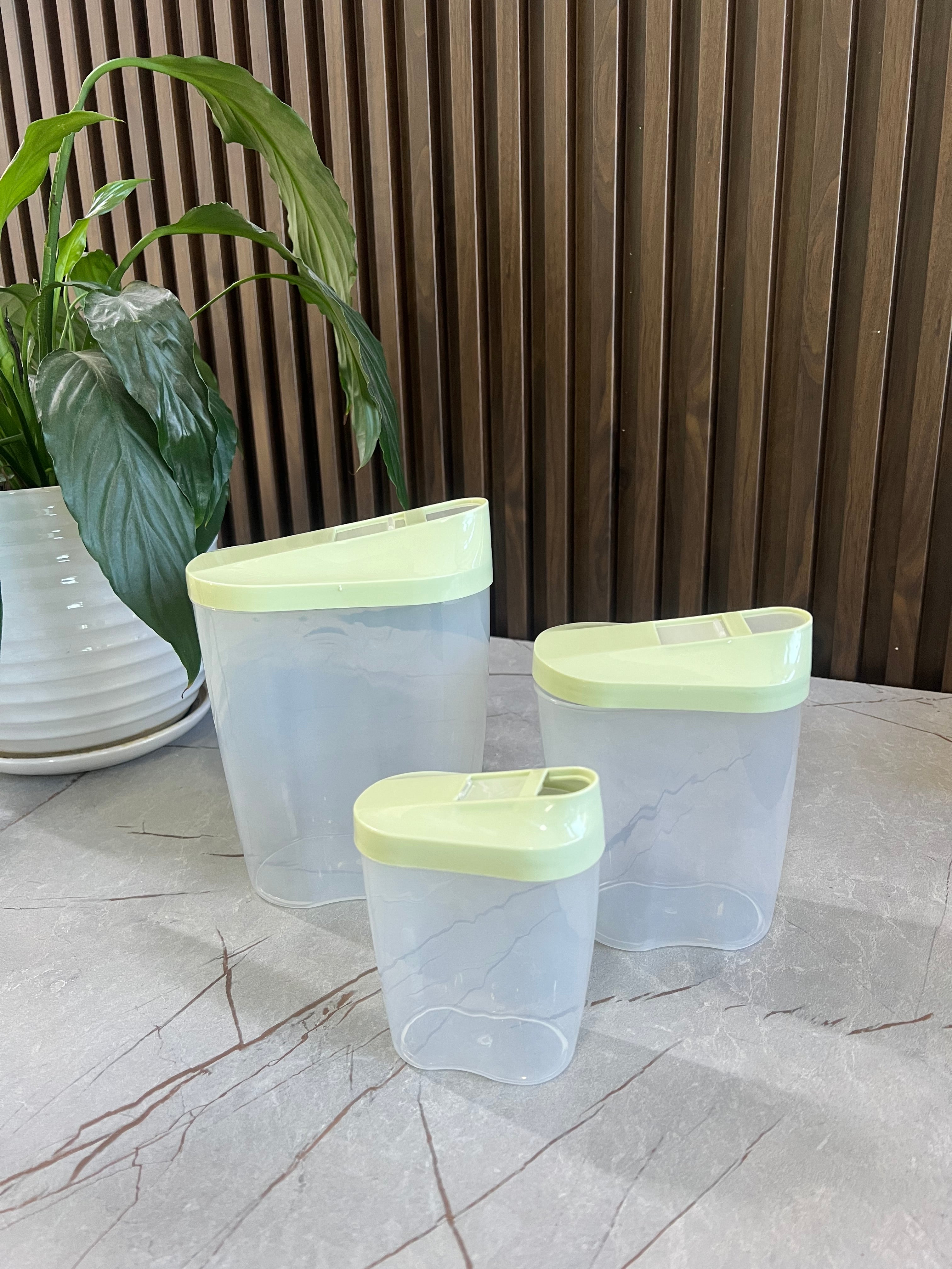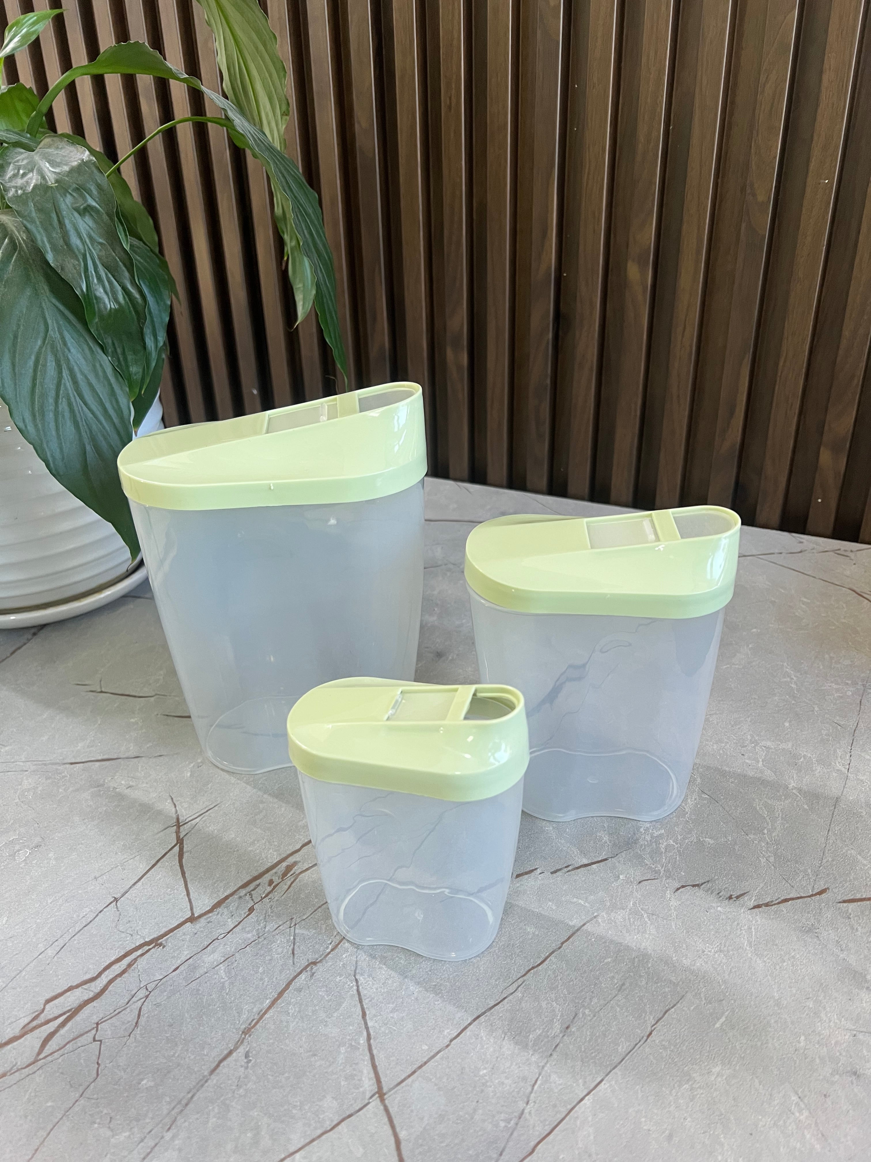 Materiali: Plastike. Ngjyra: Transparente + mente. Përmasat: 8x4xH11cm/9.5x5.5xH14cm/12x7xH17cm. Ideale për ushqime të ndryshme të thata.