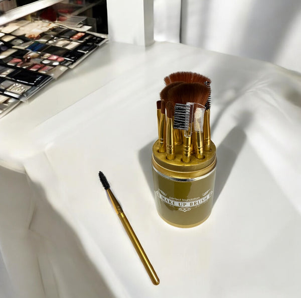 Set me 12 furça make up-i; Ngjyra: Gold, e zezë; Furca për të gjithë fytyrën duke filluar nga përhapja e pudrës e deri tek qerpikët e vetullat
