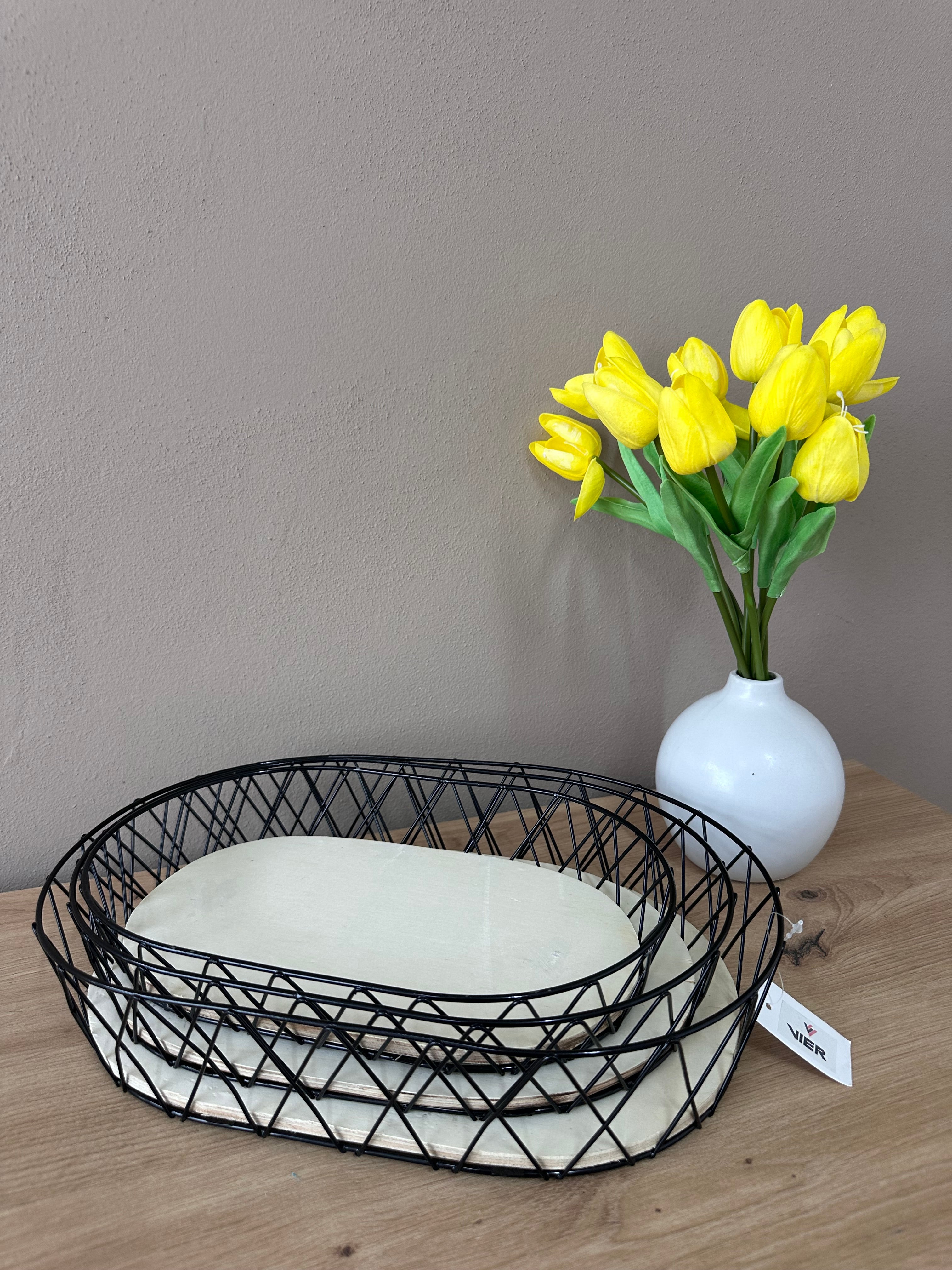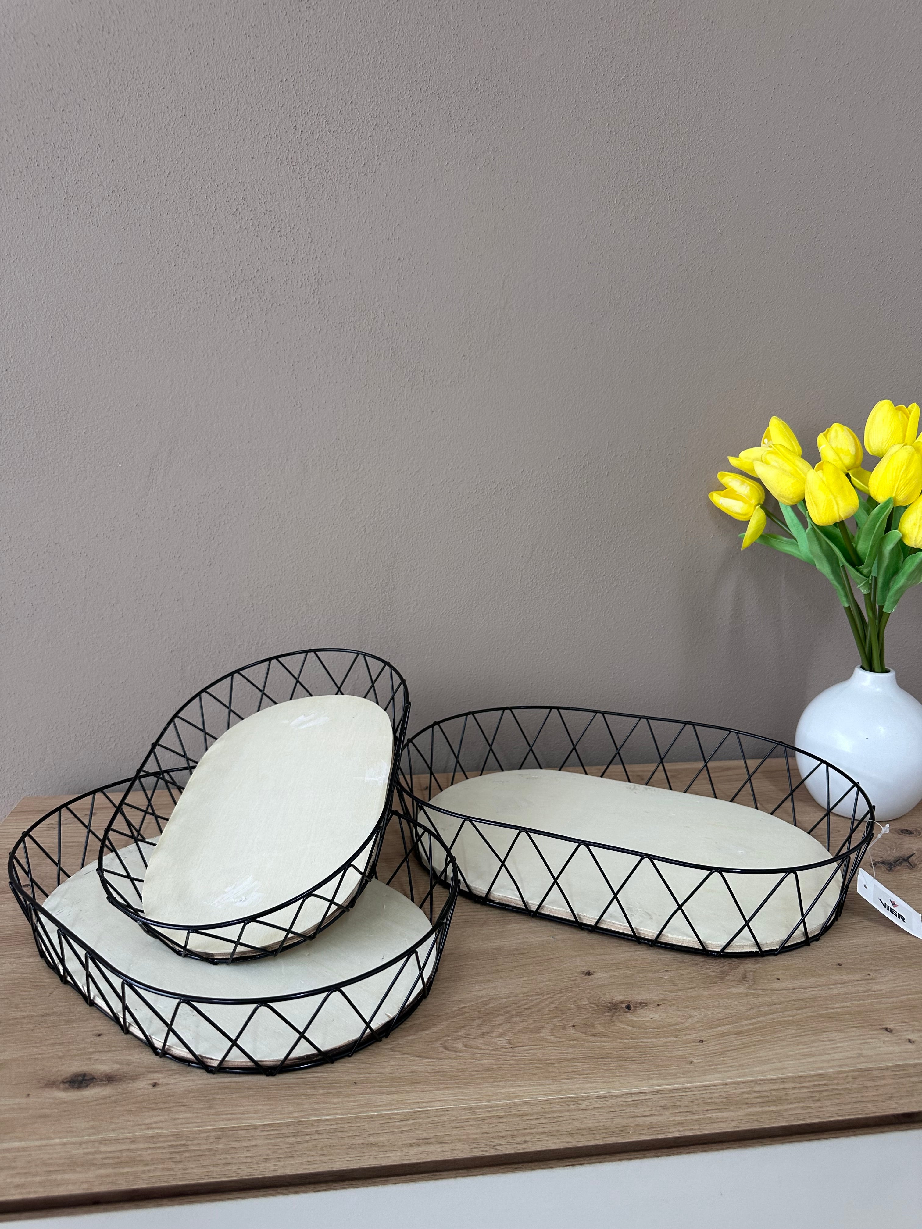 Set me 3 shporta metalike me bazament druri në formë ovale; Përmasa: 25 x 15 cm ; 28 x 17 cm; 30 x 20 cm