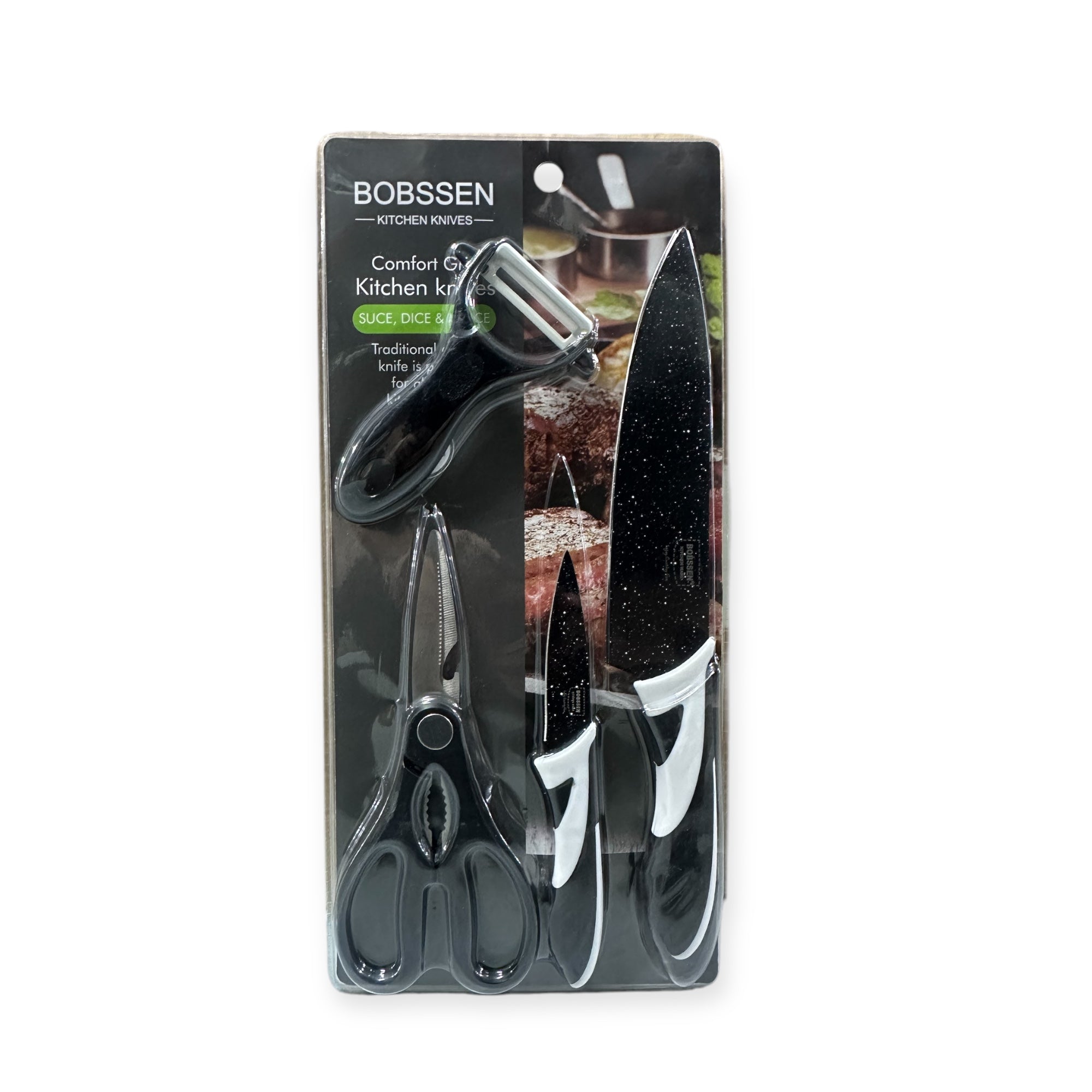 Set me 4 pjesë: 2 thika me madhësi të ndryshme, gërshërë dhe qëruese perimesh