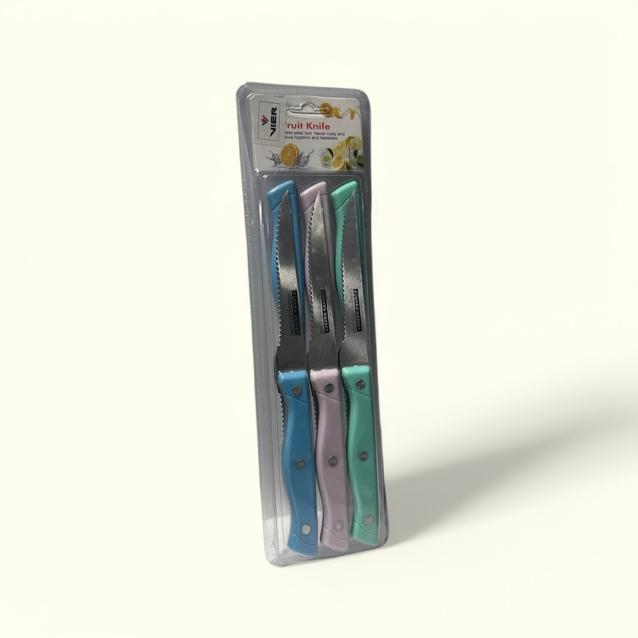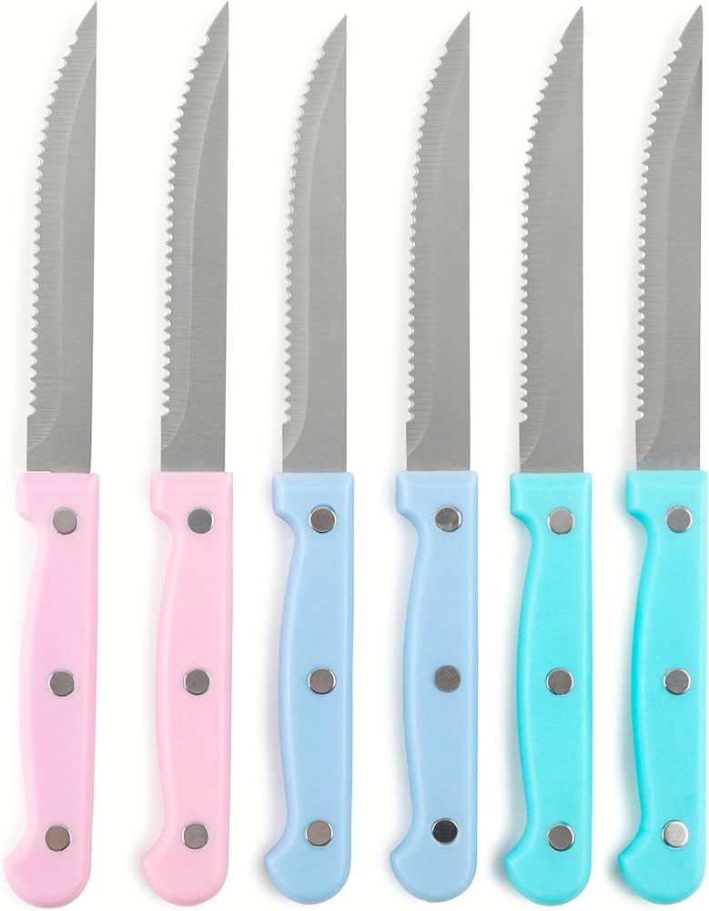 Set me 6 thika me bisht plastik me 3 ngjyra rozë, blu, jeshile; Materiali: Stainless Steel