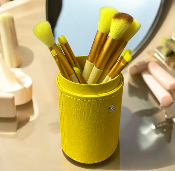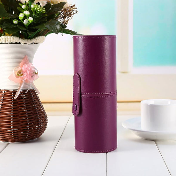 Set me furça make up-i dhe kuti lëkure rrethore; Ngjyrat: e verdhë, vishnje, jeshile; kutia është me kopsa; 20 cm; e përshtatshme për tu marre kudo me vete
