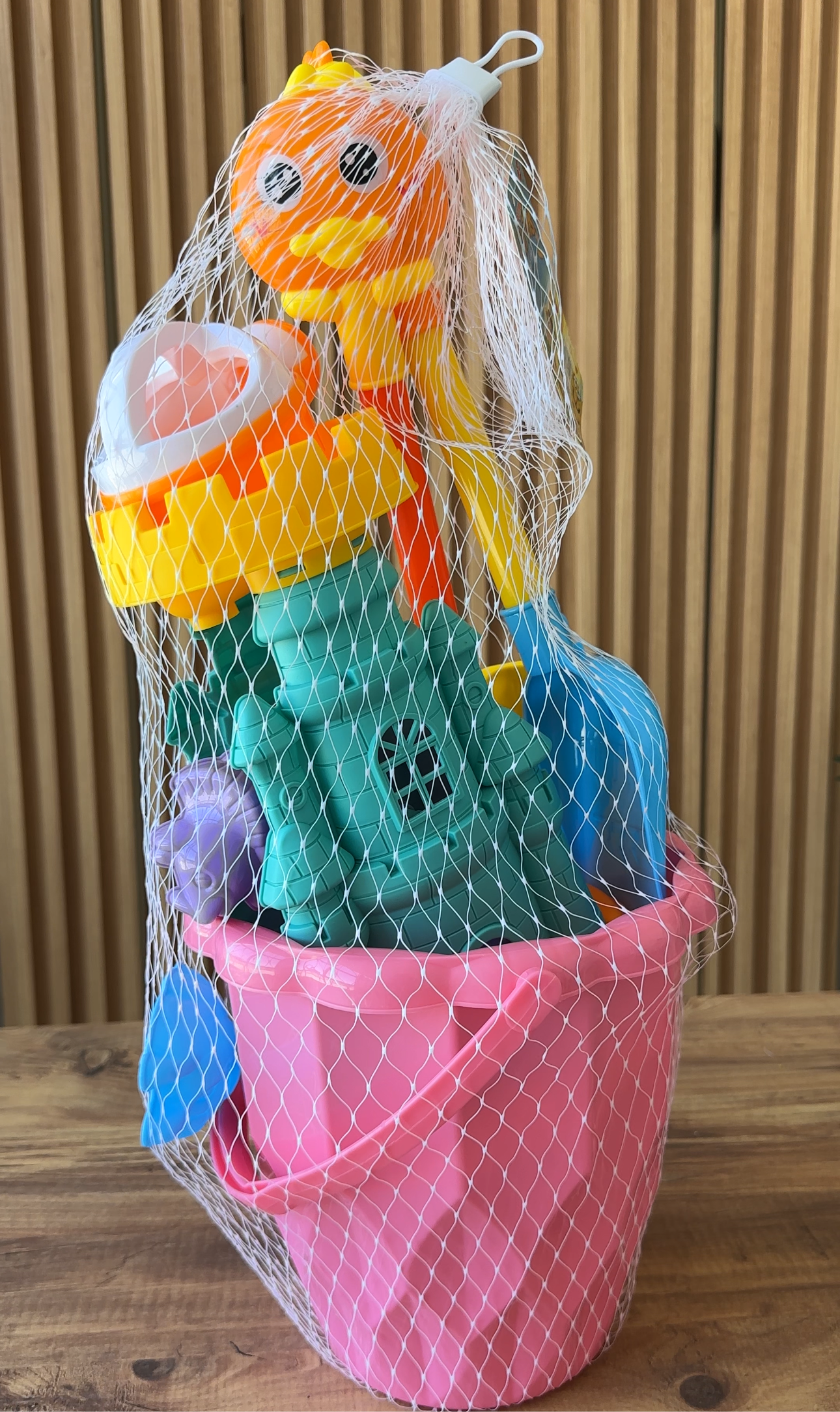 Set me lodra plazhi që përmban kovën, lodër uji në formë kështjelle, 4 forma rëre me kafshë, ujitësen dhe dy lopata