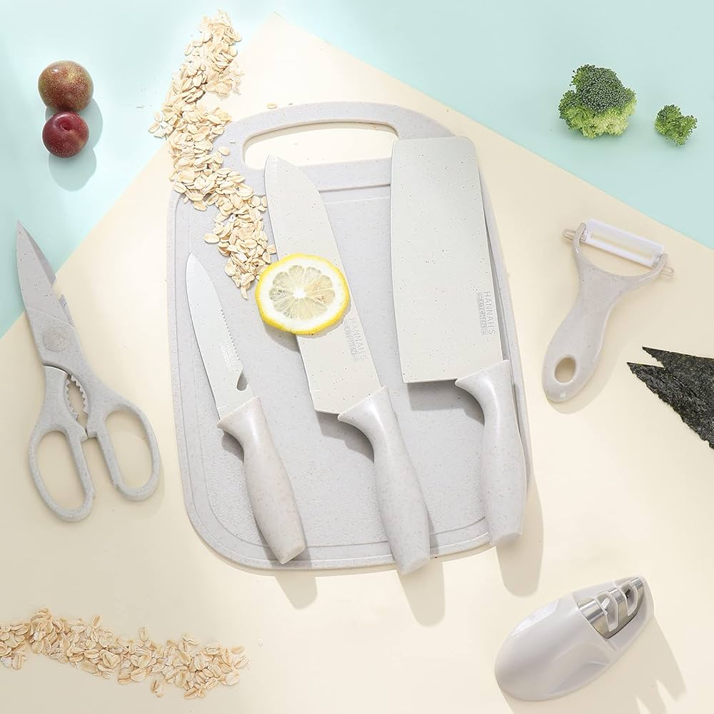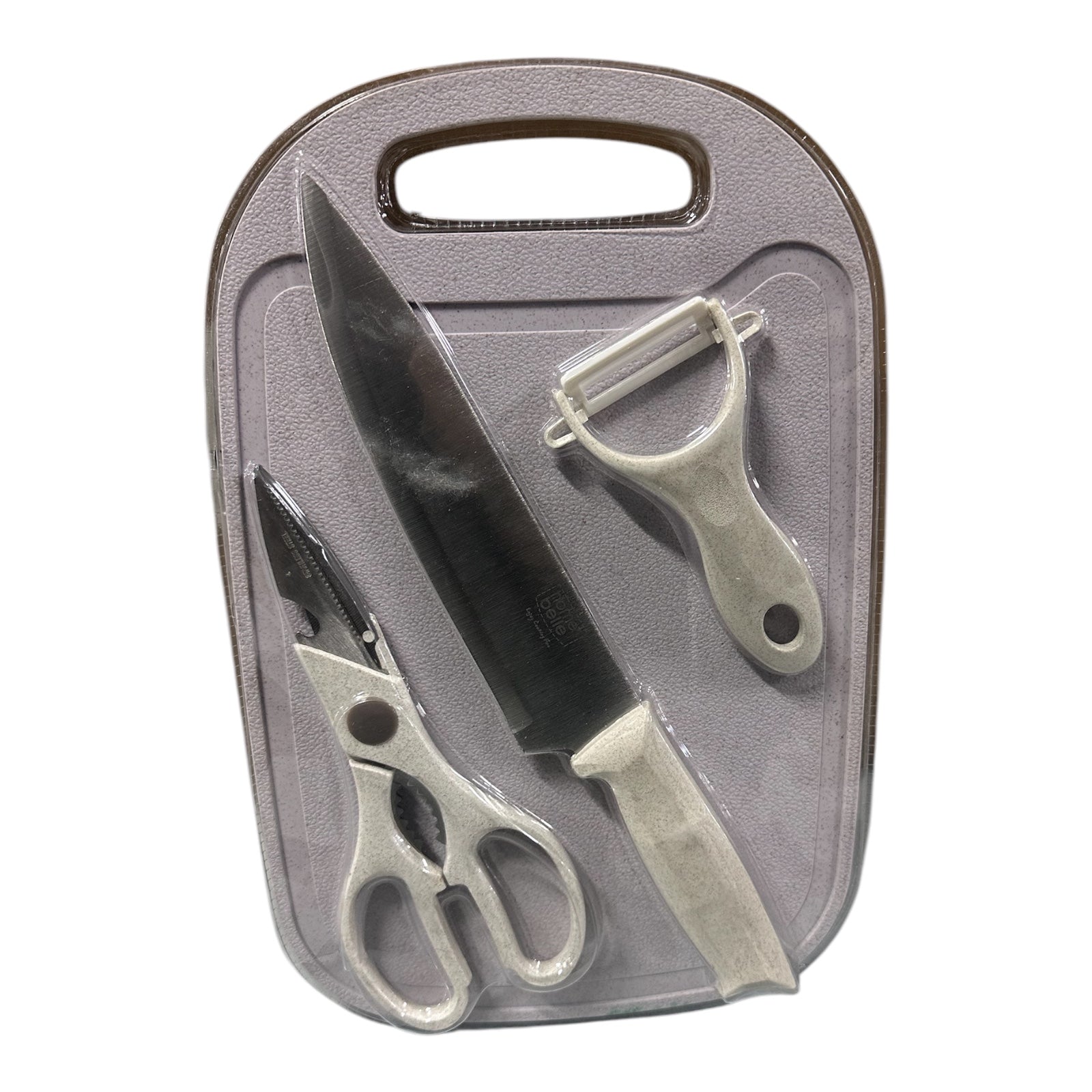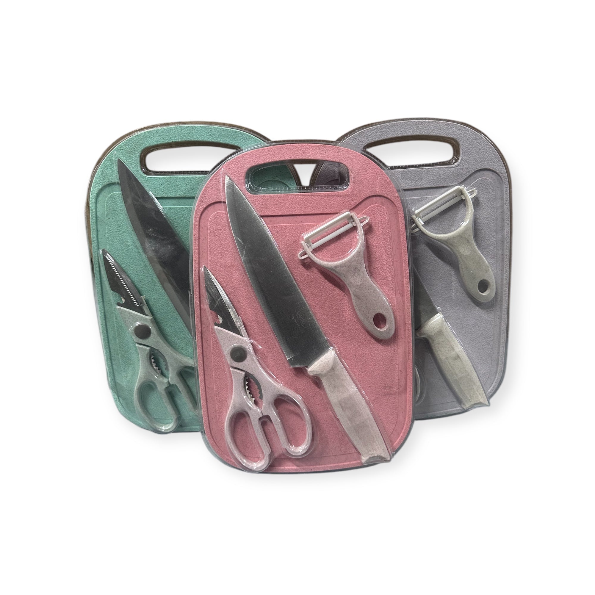 Set me thikë, gërshërë, qëruese perimesh dhe dërrasë për prerje