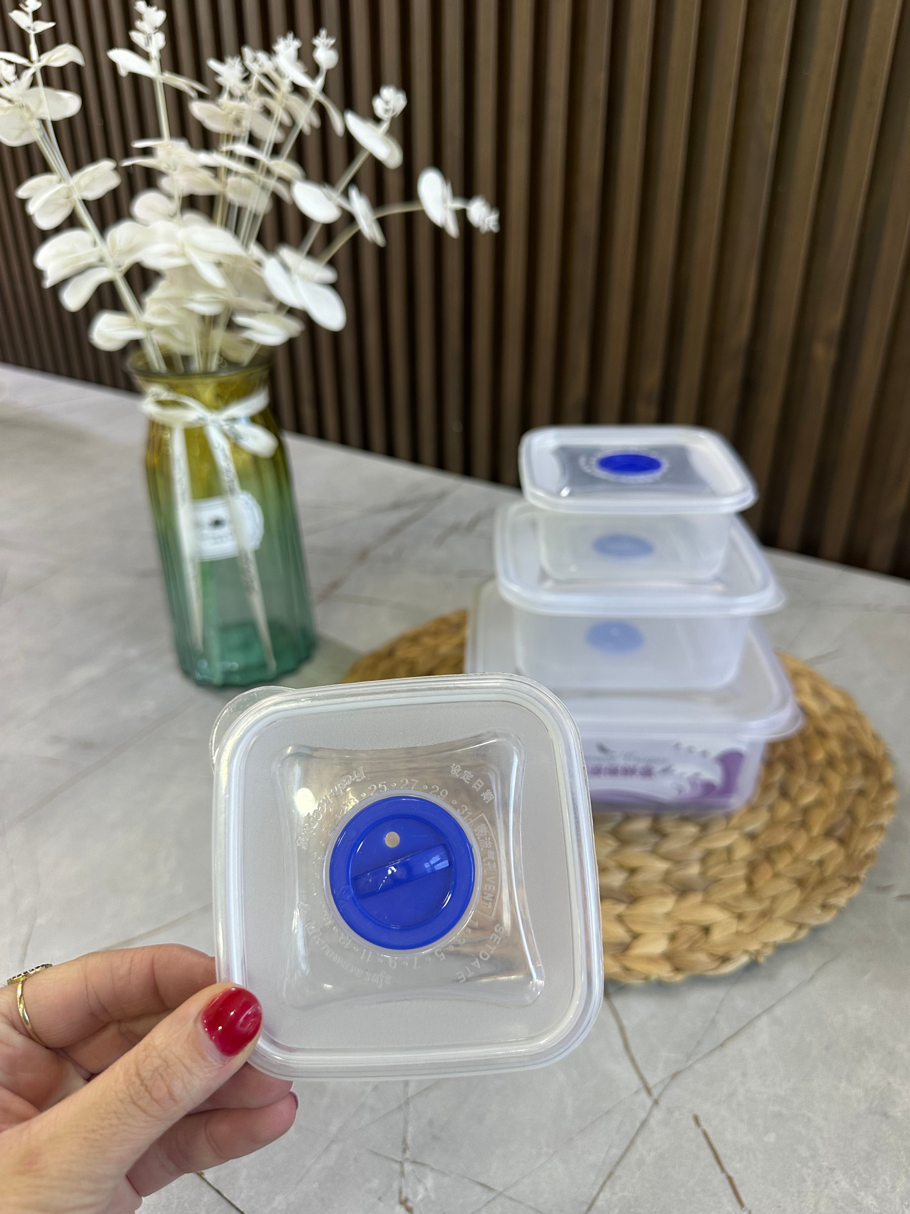 Materiali: Plastike. Ngjyra: Transparente. Set: 4 Pcs. Përmasat: 15x15x7cm/12x12xH7cm/9.5x9.5xH5cm/7x7xH4cm. Ideale për shtëpi dhe praktike për tu marrë kudo me vete.