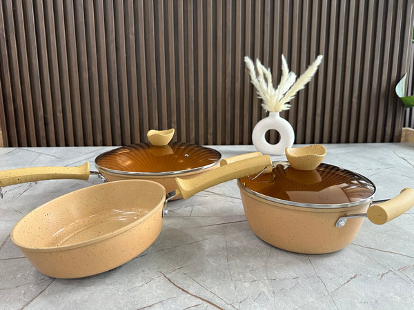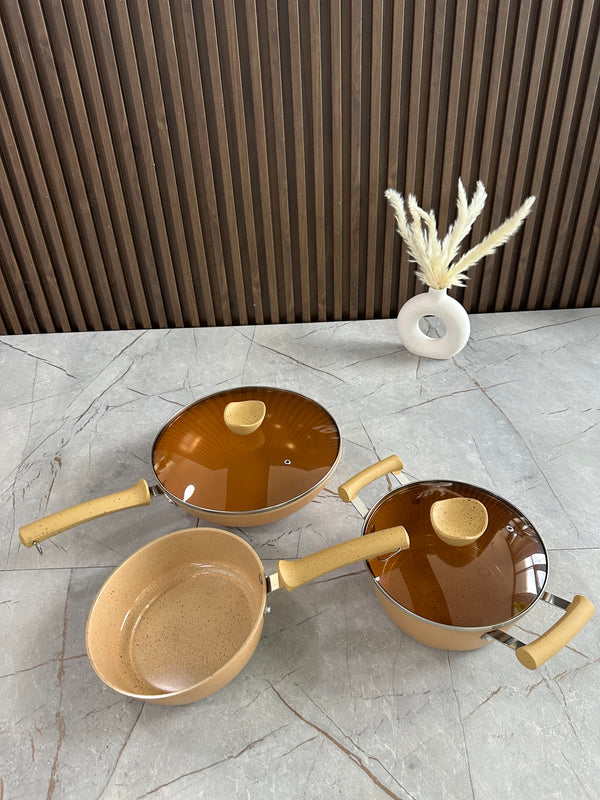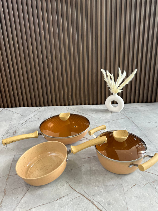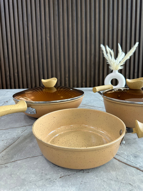 Specifikim  Materiali: veshje guri  Ngjyra: bezhë  Dimensionet: 30cm (tigani)/ 22cm (tigani)/ 22cm (tenxhere)