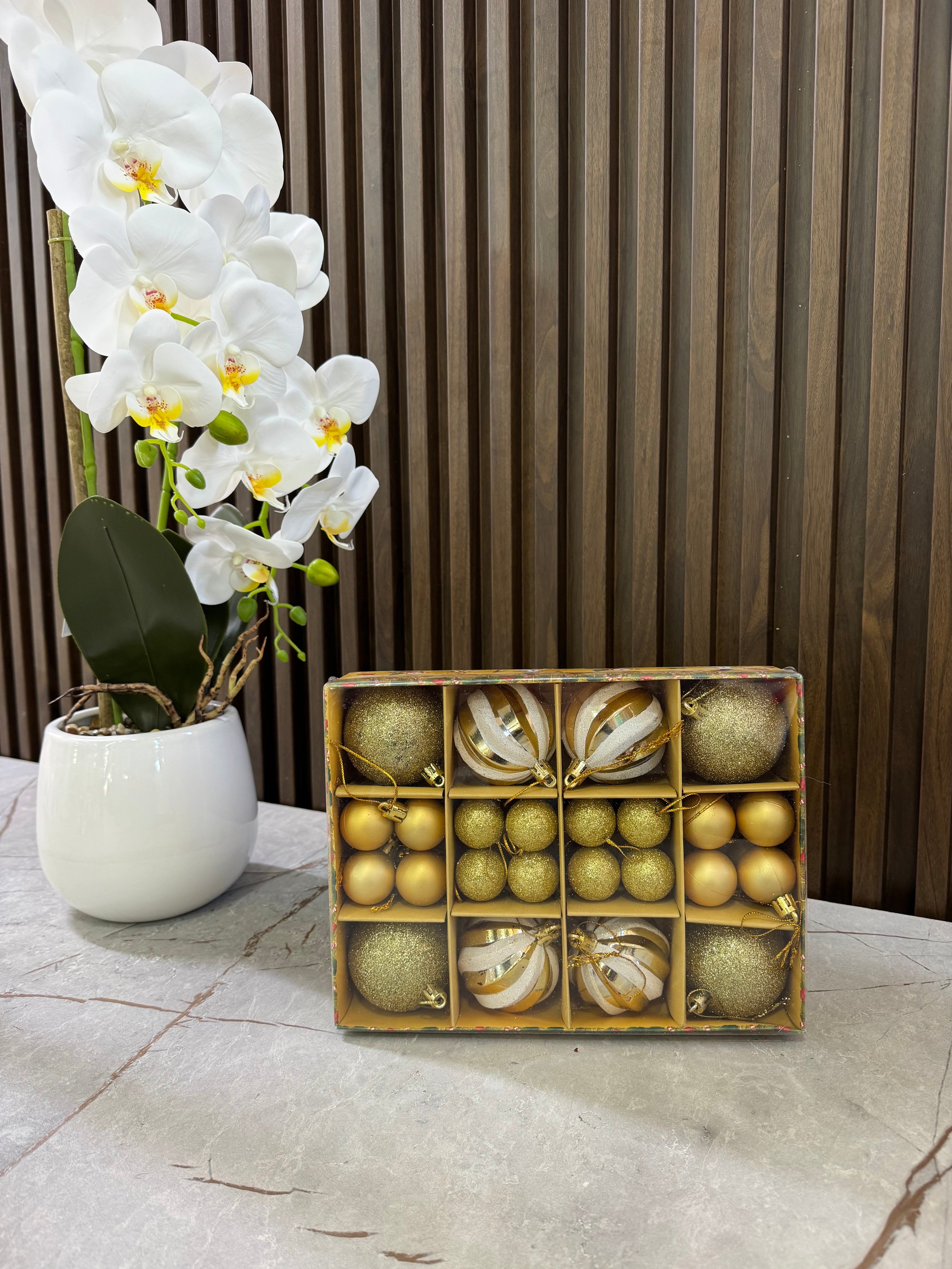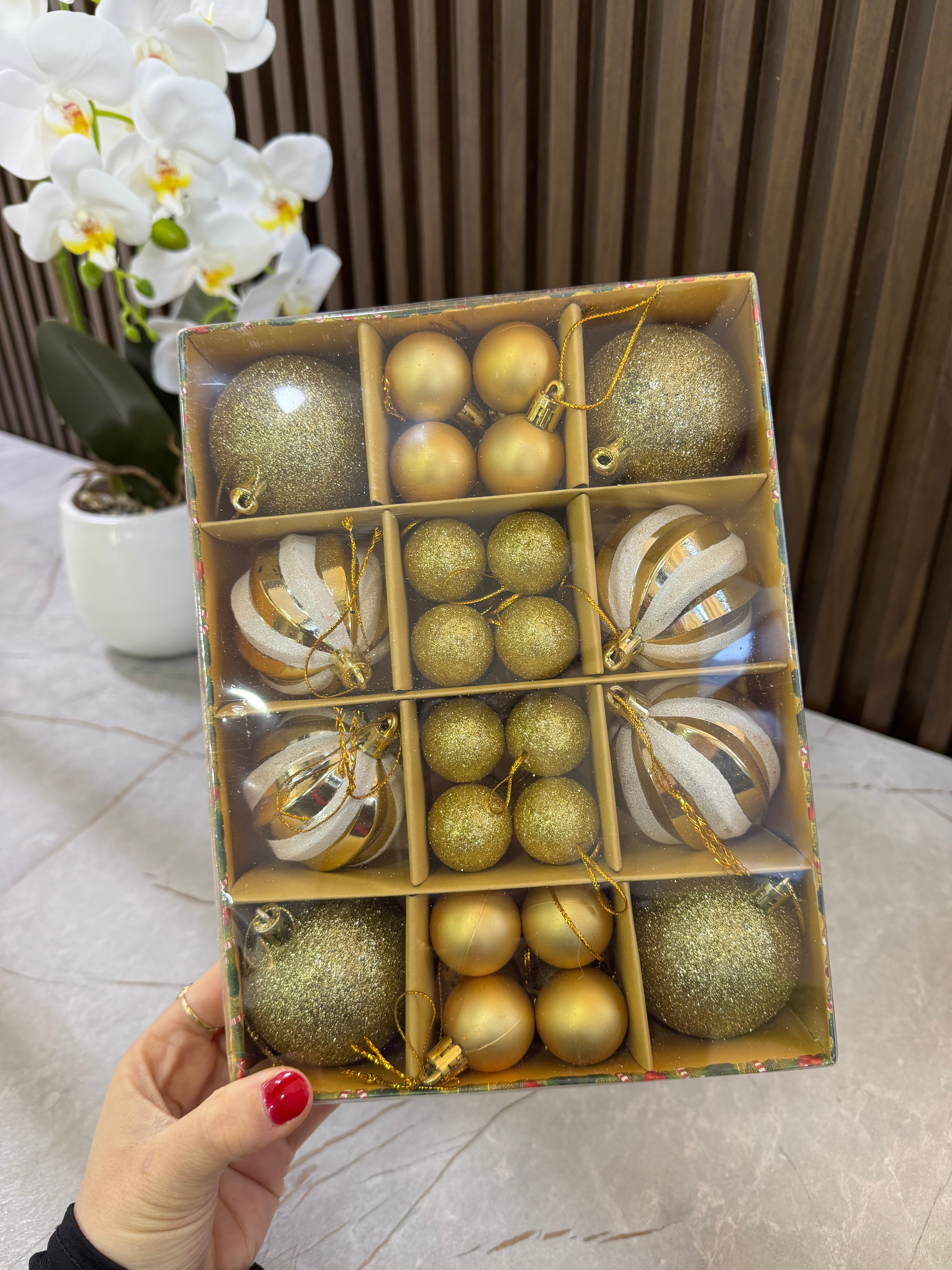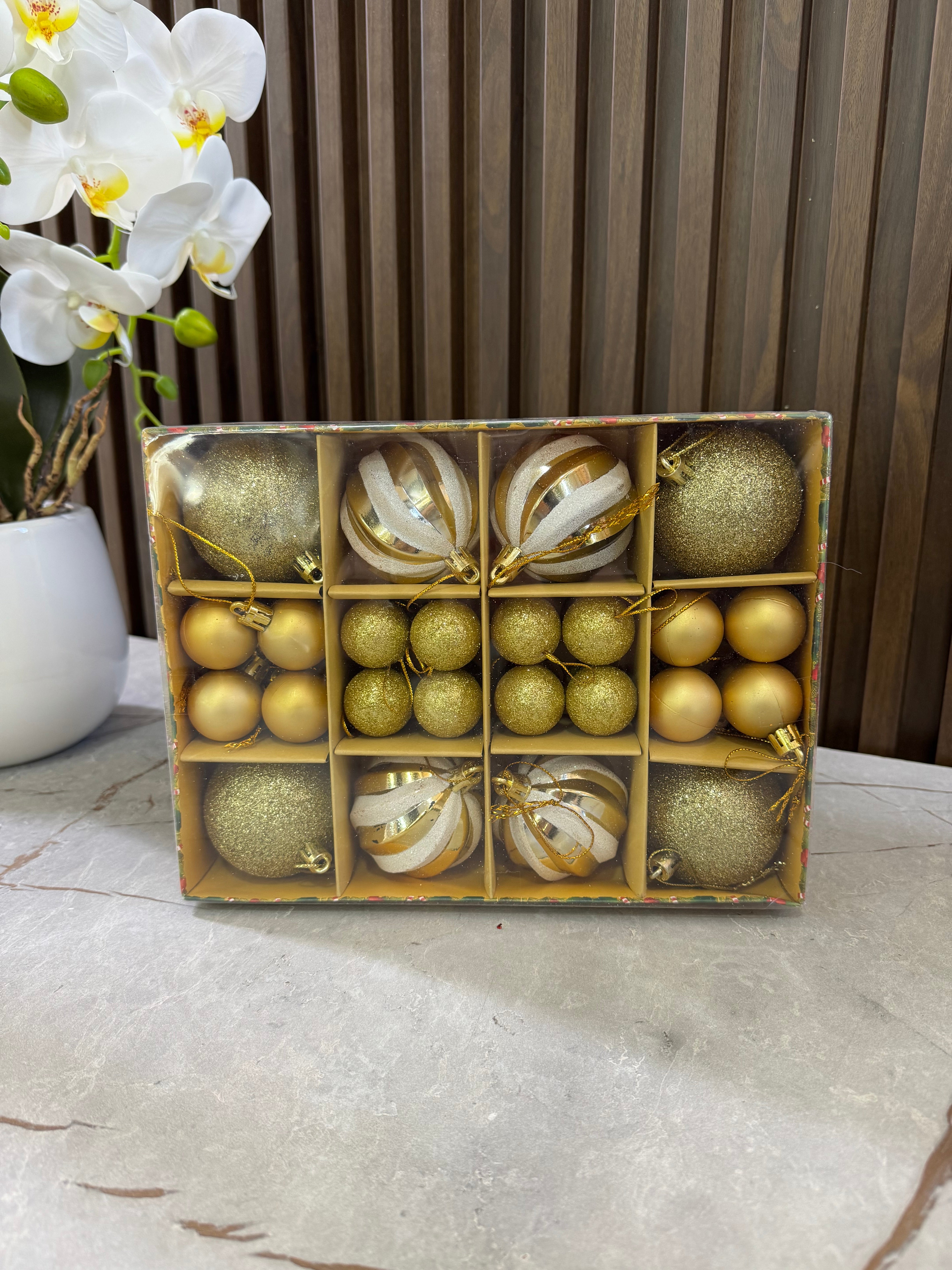 Ngjyra: Gold. Në 2 përmasa: Mesatar, të vegjël. Ideale për dekorimin e pemës së fundvitit.
