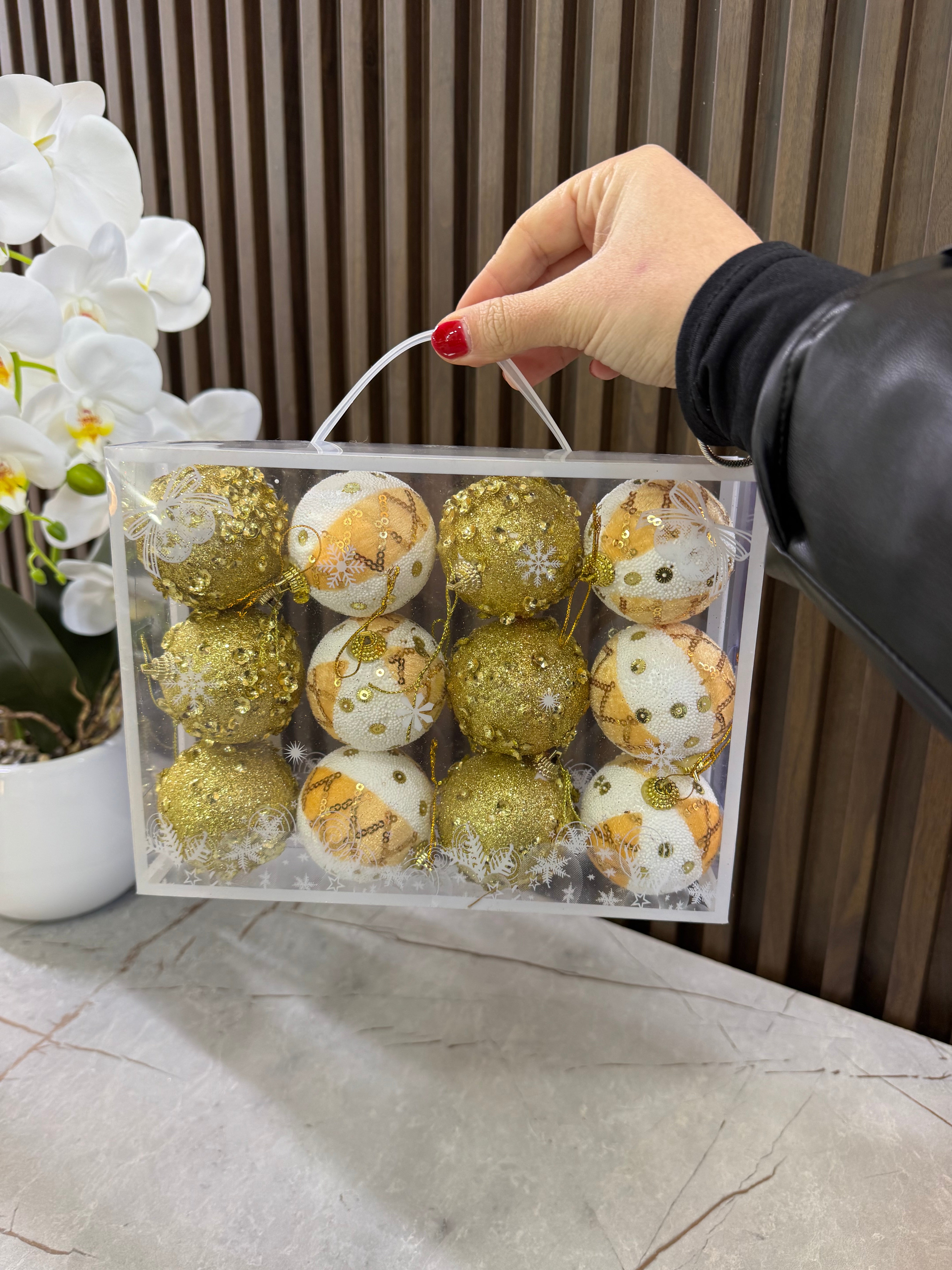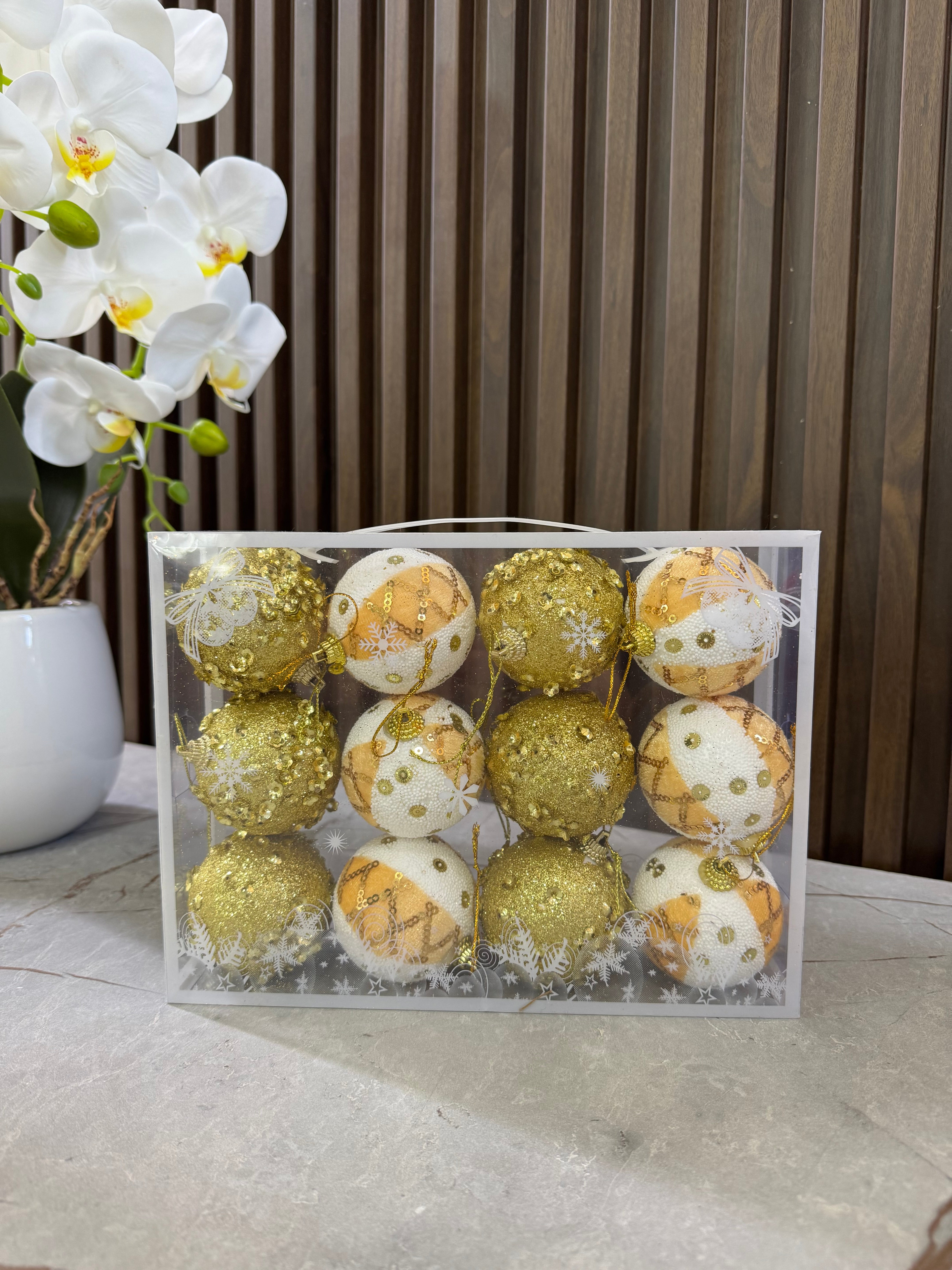 Ngjyra: Silver + verdhë dhe bardhë. Sasia: 12 Pcs. Ideale për zbukurimin e pemës së fundvitit.