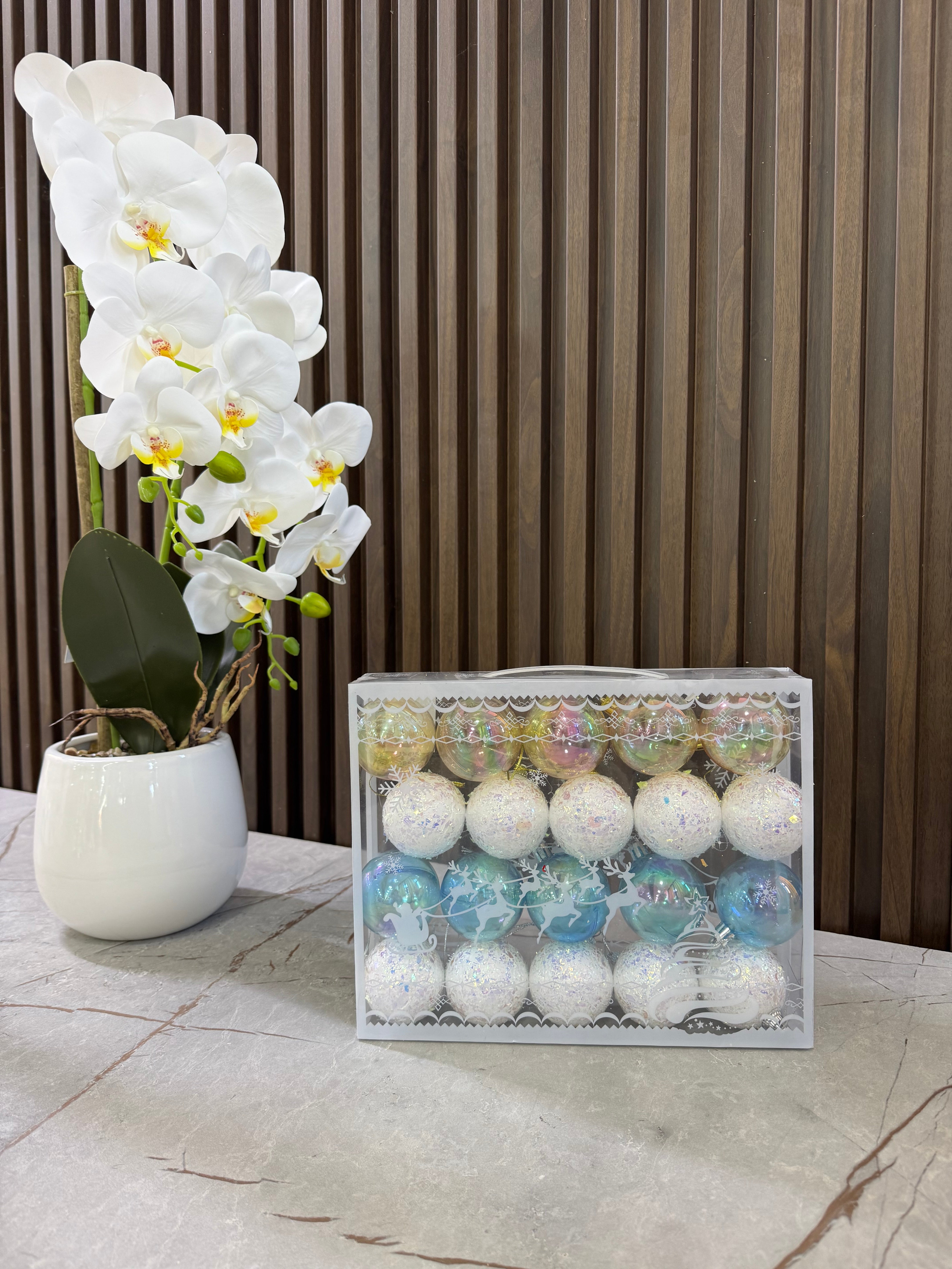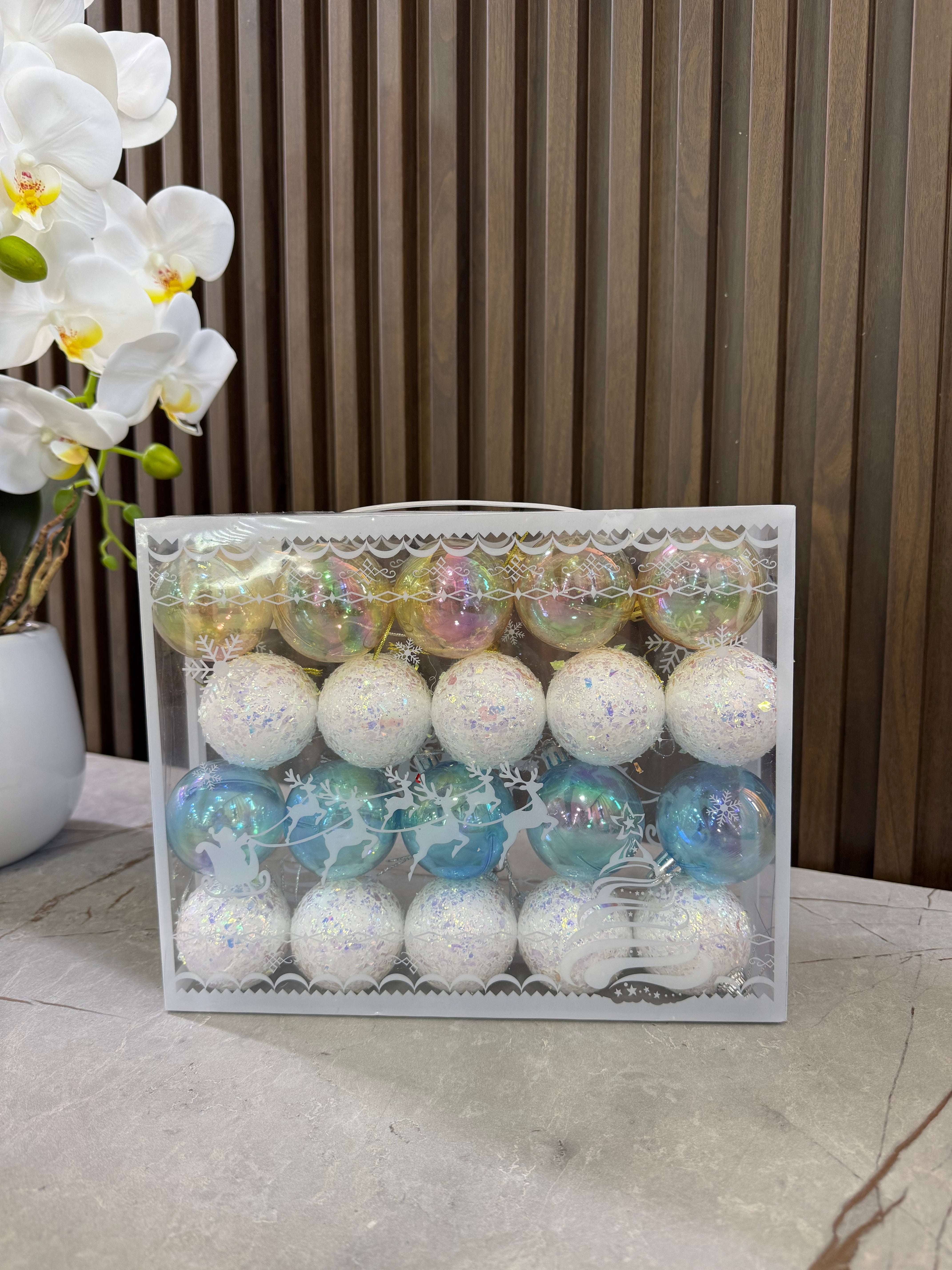 Ngjyrat: Silver, e bardhë, bojëqielli. Sasia: 20 pcs. Ideale për dekorimin e pemës së fundvitit.